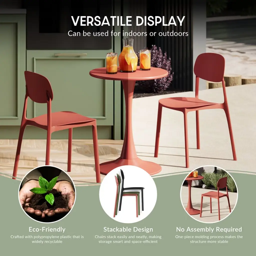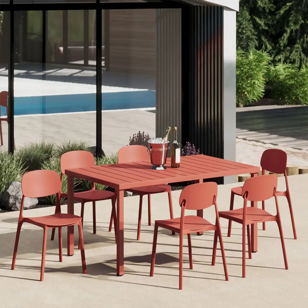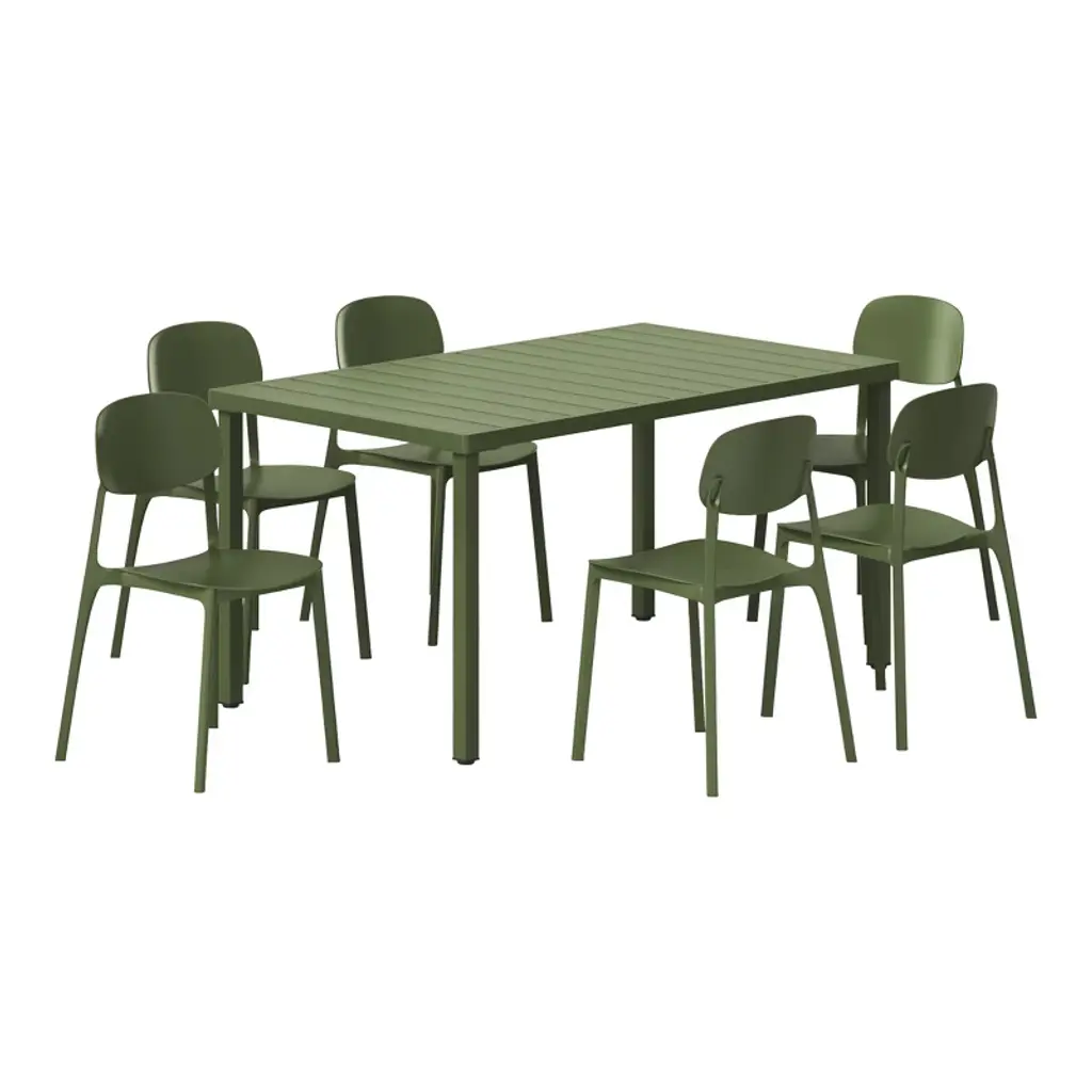 Elevate your outdoor gatherings with this six-person dining set. The rectangular table, crafted from durable iron with a rust-resistant e-coating, offers a modern foundation for al fresco dining. Complementing the table are six stackable patio chairs, designed for space-conscious living. Made from UV-resistant polypropylene resin, these lightweight chairs allow for effortless rearrangement, adapting to your evolving patio aesthetic. The sleek mid-century modern chair design ensures comfort with the open back promoting airflow to keep you cool and the splayed legs adds extra stability. Enjoy instant gratification with the fully assembled chairs, while the table's simple leg attachment allows for quick setup, making it the perfect centerpiece for your outdoor retreat ensuring this 7-piece rectangle patio dining table set for 6 is the perfect set for your patio this season.While we strive to accurately represent product colors, please be aware that actual colors may vary slightly due to individual screen settings and lighting conditions. FeaturesSet Includes: One (1) 59" Iron Metal Patio Dining Table & Six (6) Stackable Patio Dining ChairsE-Coating Finish Provides Rust & Fade Resistance To The Iron Metal, Ensuring Longevity & Weather Resistance In Outdoor ConditionsChairs Constructed with Durable Polypropylene (PP) Material & Designed for Sturdiness & StabilityRobust & Thick Iron Metal Table Offers Increased Stability & Adjustable Leveling Feet Enhance Stability On Uneven Surfaces, Eliminating WobbleStackable Chairs for Easy Storage & No Assembly Required, Simply Unpack & Enjoy & The Table Is Simple To Assemble by Simply Attaching the LegsWater Easily Drains Through The Slatted Tabletop & The Chairs Keep You Cool By Allowing Fresh Air To Flow Through The Open BackrestSpacious 59" Rectangular Tabletop Seats Up to 6 Guest Comfortably with Plenty of Space for all your Meals and DrinksDetails:Product Type: Patio Dining SetsWhat's Included: (6) Dining Chair; (1) Dining TableDining ChairDimensions: 18.5" W x 20.25" D x 32" HWeight: 8.3 lbs.Weight Capacity: 260 lbs.Dining TableDimensions: 59" W x 35.5" D x 29.5" HWeight: 38 lbs.Table Top Width: 59"Table Top Depth: 35.5"Table Top Thickness: 1.5"Seat Width: 16.25"Seat Depth: 16"Weight Capacity: 200 lbs.