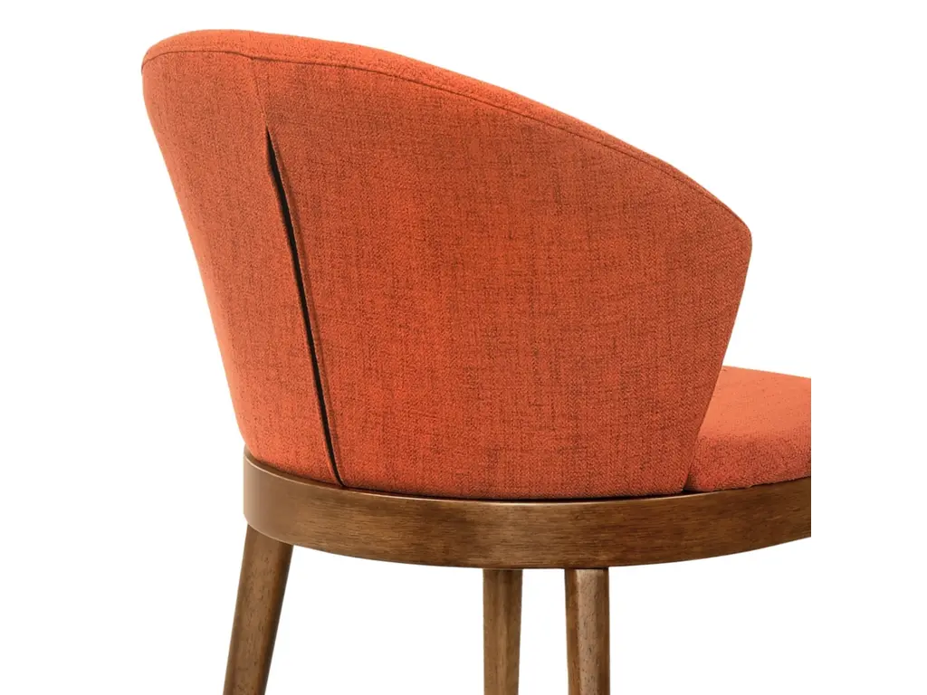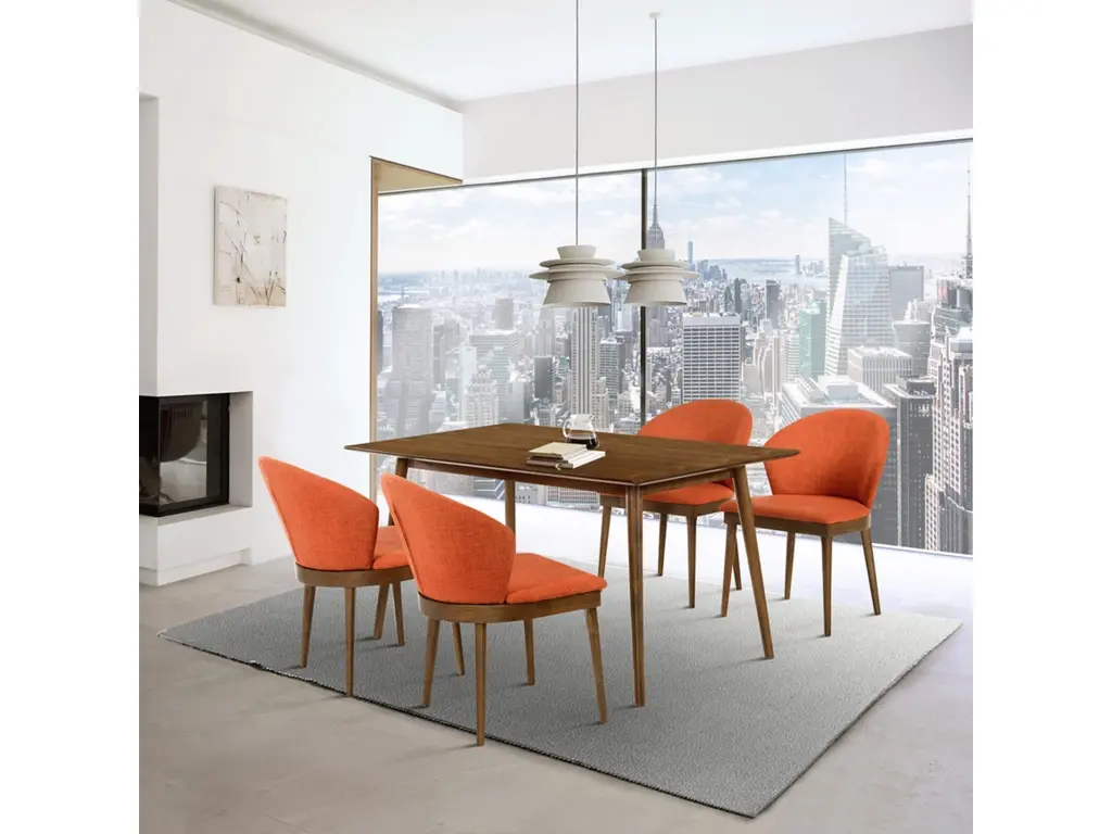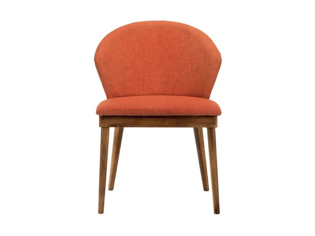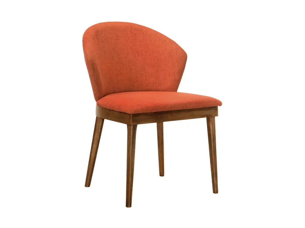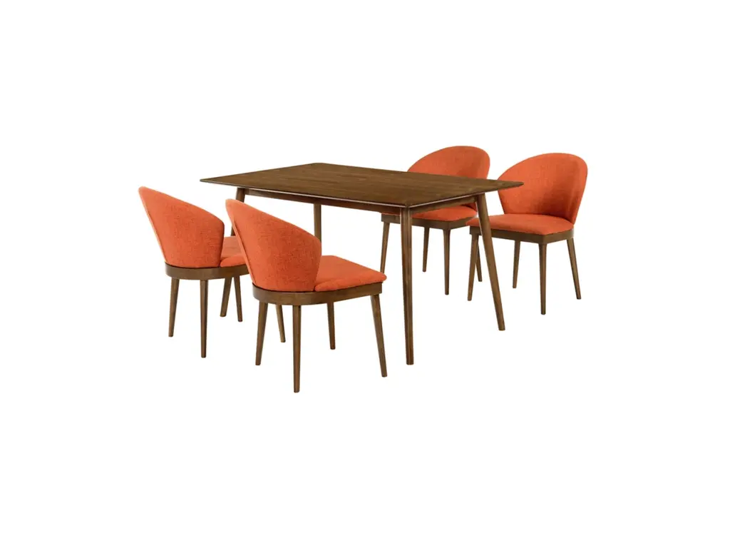 The Westmont and Juno Orange and Walnut 5-Piece Dining Set is the ideal addition to any kitchen or dining room. Combining mid-century elements with an updated modern style, the 59-inch rectangular wood dining table offers a clean, streamlined design with plenty of space to enjoy a meal with family and friends or spread out as you work from home. Offering an on-trend modern look that is both stylish and functional, this set is the perfect anchor for your dining space and is sure to make a statement. The tall, rounded seat back of the Juno chair features ergonomic properties to keep your back healthy and properly aligned. The soft fabric upholstery is wrapped around an incredibly comfortable foam padded seat cushion for your pleasure.
