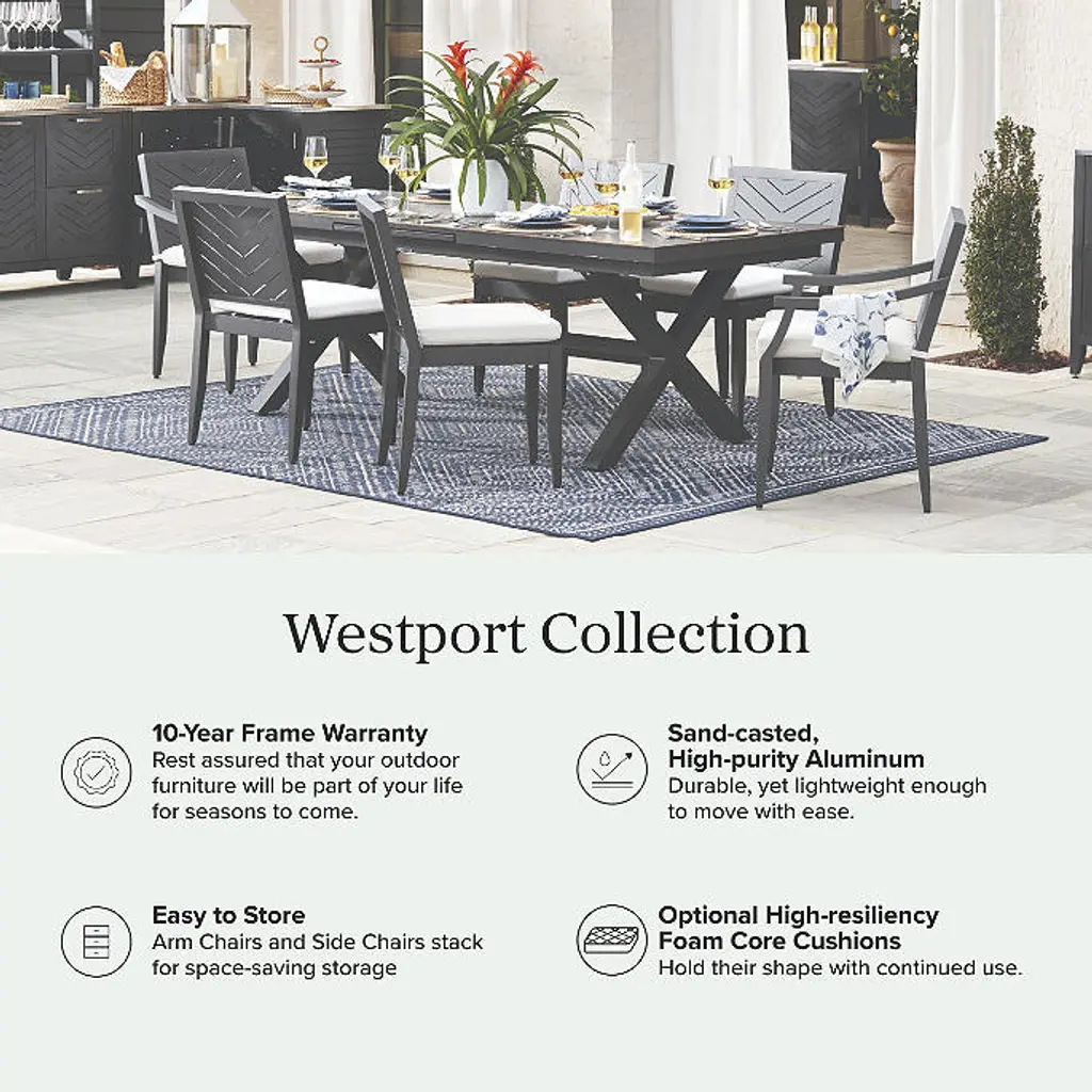 Based on or popular Westport Outdoor Kitchen Collection, each outdoor dining piece is crafted of aluminum and stainless steel. They feature a chevron design on the seats and seatbacks for a cohesive look. The arm chairs and side chairs also stack for convenient, space-saving storage when not in use. Includes Hartley expandable dining table, four side chairs and two arm chairs Seats six people when closed and ten people when extended Durable yet lightweight aluminum frames finished with a protective powdercoat to resist the elements Aluminum slats on seats and seatbacks form a chevron pattern Frames are backed by an industry-leading 10-year structural warranty Cushion(s) sold separately Arm Chairs and Side Chairs stack Assembly required Imported A Frontgate exclusive. At Frontgate, our primary focus is quality. We guarantee that every product we sell will stand up to the supreme test – our customers' satisfaction. To learn more about our policies, visit our Shipping & Processing, Returns & Exchanges and Warranty & Price Guarantee pages.