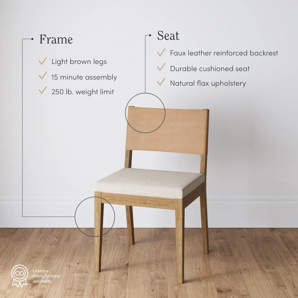 We loved our Linus Bar Stool so much, we had to make a dining chair to match. Our Linus Dining Chair features a thick, durable cushion covered in natural flax fabric, with complimenting rubberwood legs in a light brown finish. It's brushed light brown faux leather back ensures that the shape of the backrest stays intact over many meals. Linus adds comfort and style to dining room or breakfast nook with its clean modern lines and textured fabric. And with an easy 20 minute assembly time, you’ll be enjoying that pizza from your new dining chair in no time!