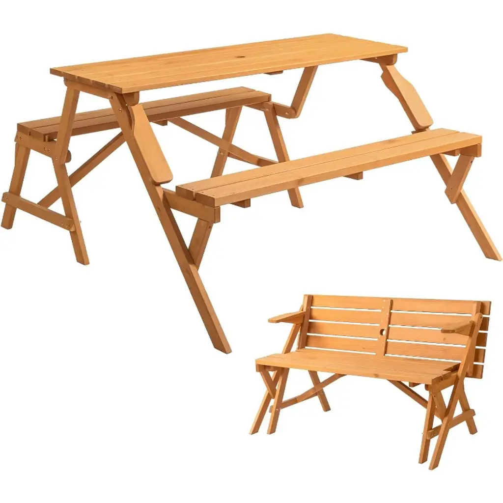 Who needs to pack for a picnic? This 2-in-1 transforming table can quickly swap between a handsome garden bench and a classic picnic table with two benches and a 380-pound capacity table! A solid fir wood construction will resist rot, while a built-in umbrella slot will ensure cool outdoor dining!