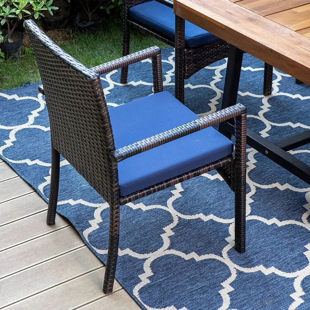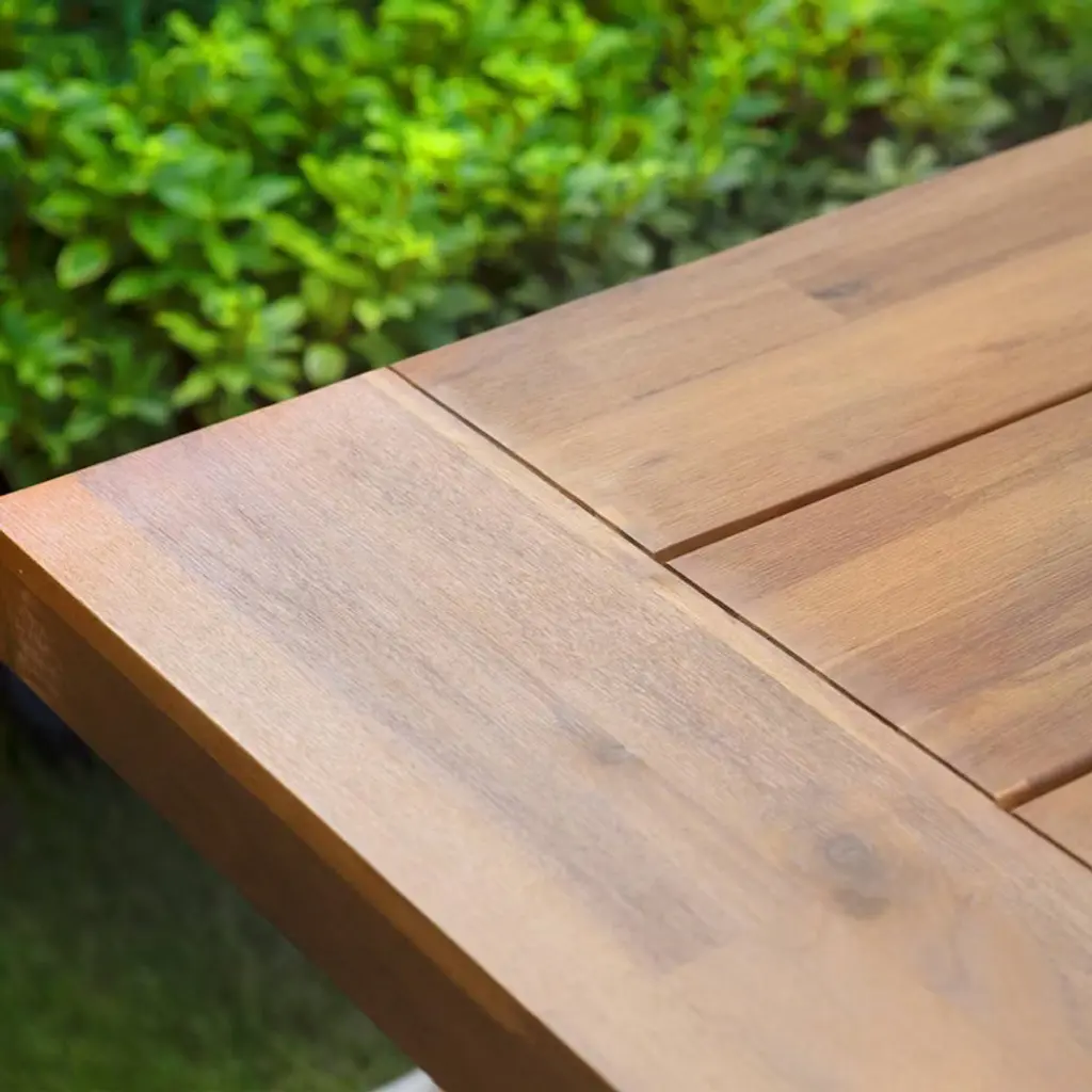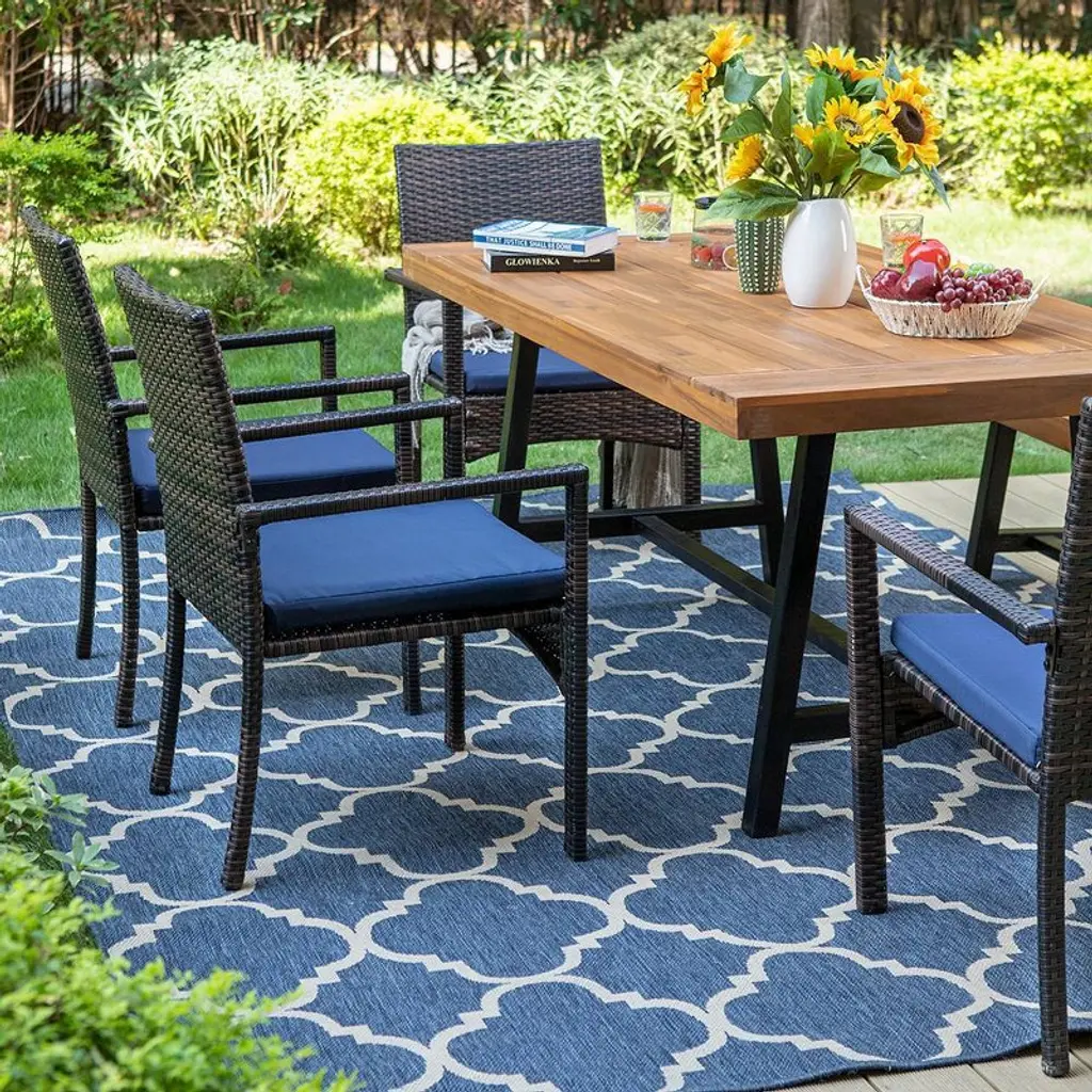 [CAPTIVA DESIGNS] Upgrade your outdoor dining with our 6-piece set - Acacia table, bench, and four wide PE Rattan chairs. Crafted with weatherproof Acacia wood and ergonomic right angle armrests, this set ensures durability and unparalleled relaxation. Soft, removable cushions add extra comfort, while easy assembly and minimal maintenance make enjoying your outdoor space effortless. Embrace nature's beauty with rich Acacia wood, creating an inviting space for lasting gatherings.FEATURESNature Appearance - Natural beauty with the rich look of Acacia wood.Weatherproof Acacia Wood - Durable, weather-resistant Acacia wood for lasting quality.Extra-Wide Wicker Chairs - All-weather wicker chairs for extra relaxation.Removable Soft Cushions - Comfortable cushions that are easy to clean and remove.Elegant Comfort Design - Ergonomic right angle armrests for unparalleled comfort.SPECIFICATIONWood Table: 29.7"H x 35.3"W x 67.7"LFloor to Apron Height: 26.7"Wood Bench: 17.9"H x 14.4"W x 63.0"LArm Chair: 34.4"H x 23.8"W x 26.4"D, 20.5" (seat back height)Seat Dimensions: 19.7"W x 19.7"D, Cushion Thickness: 2"Floor to seat top: 16.1" (cushion not included), Floor to armrest: 24.4"Package Includes1 x Wood Table (1 box)1 x Wood Bench (1 box)4 x Wicker Chairs (2 boxes)Instruction Manuals (come with each box)(Decorations on the table are not included)Tips: Allow all the holes in the section to line up correctly and then tighten the screws. Assembly: 30 minutes to set up the table, 20 minutes to assemble the bench, and about 40 minutes to put the chairs together.