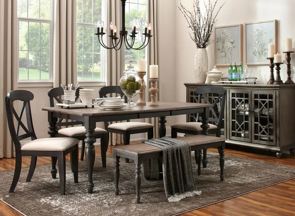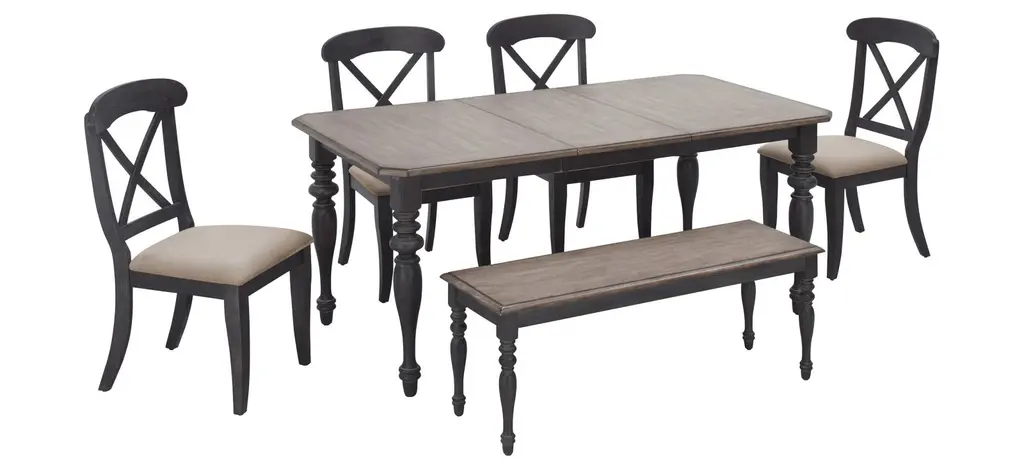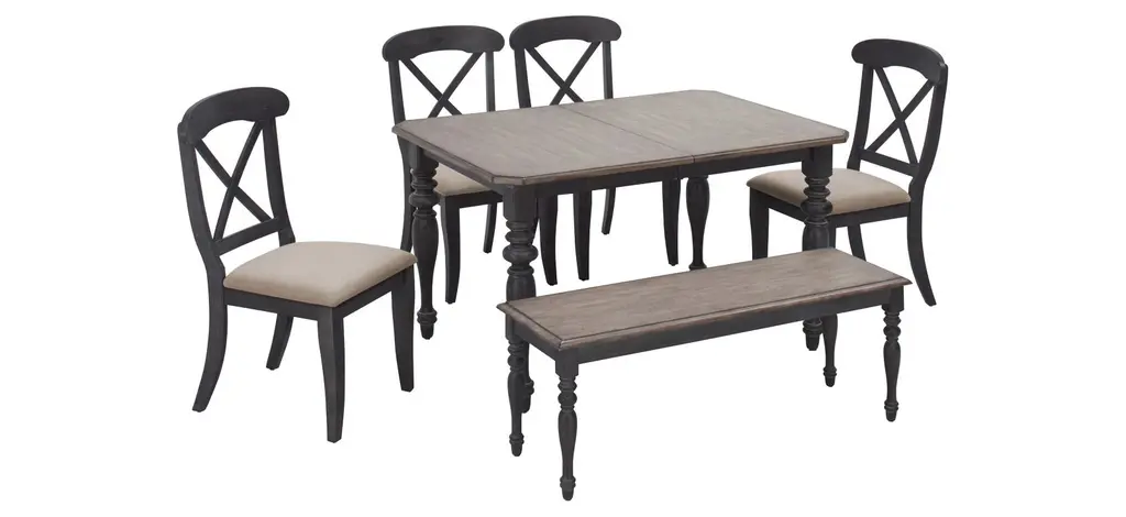 The Charleston 6-piece dining set captures a modern yet classic look. The table features turned legs, bun feet and canted corners as well as an 18" extension leaf. The side chairs feature tapered legs, upholstered seats and a stylized X pattern on the backs. The bench features matching turned legs of the dining table and nylon chair glides to ensure your floors stay protected. Elegantly styled and casually proportioned Charleston works in a dining room as well as a kitchen dining combination.