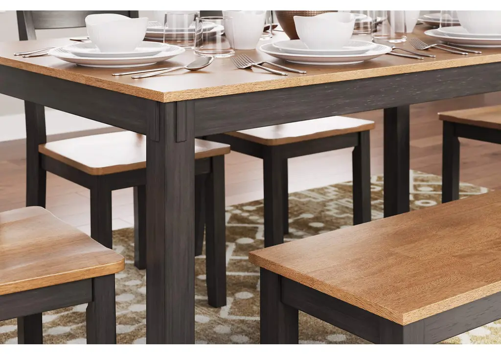 Who says a simple design can't be eye-catching? The Gesthaven dining table, chairs and bench have a casually cool style, yet they still turn heads. The two-tone table and seating choices are effortlessly handsome. Ladderback chairs cater to your comfort with contoured seats, and the bench for two is right on trend. Aside from dining, this set's relaxed simplicity is perfect for homework, morning coffee or checking all those emails. Weight 171.000 lbs. (76.95kgs.)
