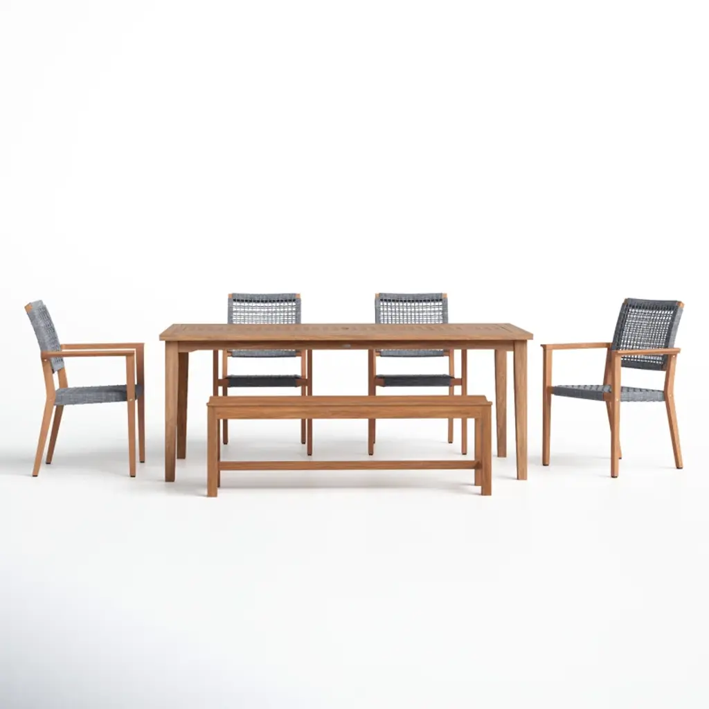 Introduce a touch of rustic charm to your dining room with the Luis Natural Rectangular Wood 72-90" Extendable Dining Table With Bench + Upholstered Chair Set For 6. Crafted from acacia wood, this set combines durability and style, making it perfect for family gatherings and dinner parties. The natural finish highlights the beautiful wood grain, creating a warm and inviting atmosphere.