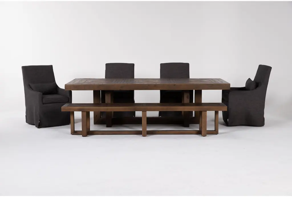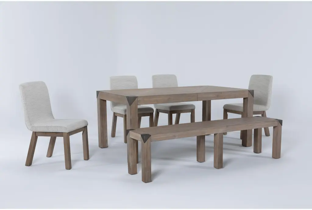 Luis Natural Rectangular Wood 72-90" Extendable Dining Table With Bench + Upholstered Chair Set For 6 | Acacia