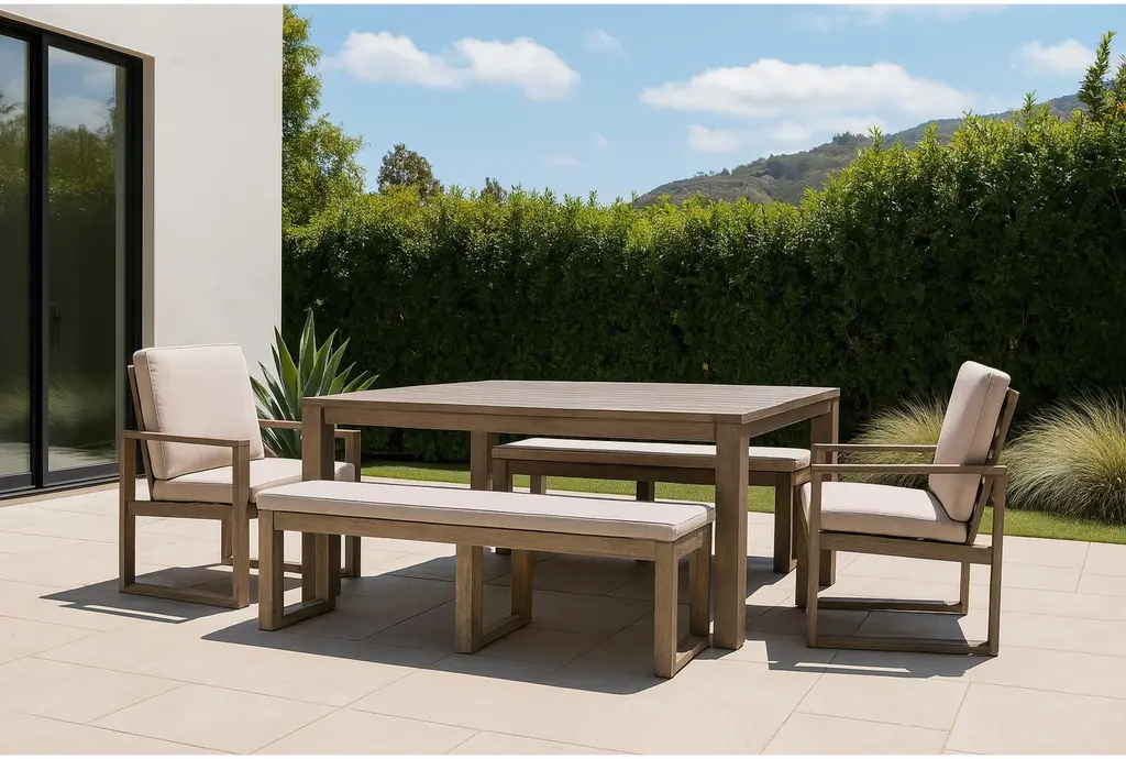 Introducing the Malaga II Natural Wood Rectangle Metal 80" Outdoor Dining Table set, perfect for your outdoor space. This modern design includes a weathered grey table, arm chairs, and two benches to comfortably seat six. Crafted from 100% eucalyptus, the set is both stylish and durable, offering a perfect blend of functionality and aesthetics for your dining needs.