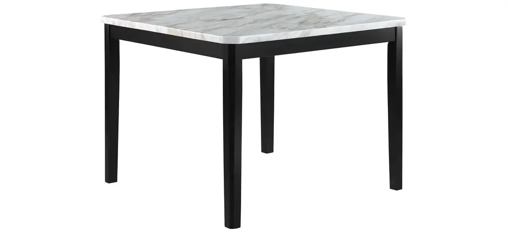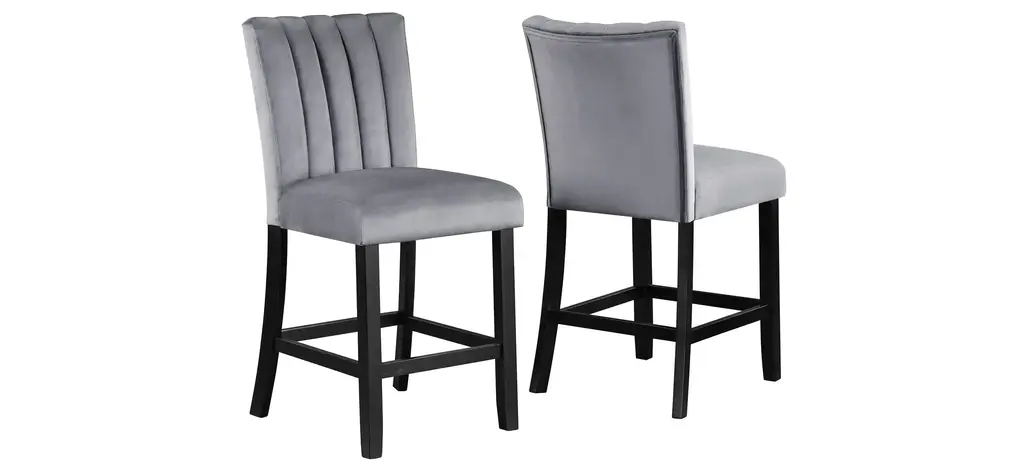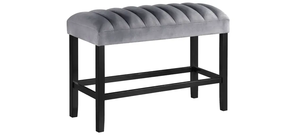 This Pascal Counter Height 6-PC. Dining Set with Bench is a perfect blend of traditional and modern design elements. The black finish on the table legs contrasts beautifully with the white marble-like top, creating a stylish and eye-catching piece of furniture. With this transitional dining table, you can expect a blend of classic elegance and modern functionality in your dining area. The chair is upholstered in a soft, grey-colored velvet that is both durable and comfortable to sit on. The standout design feature of the chair and bench is the channel tufting on the seats, which adds a touch of texture to the design making this perfect for both formal and casual dining settings.