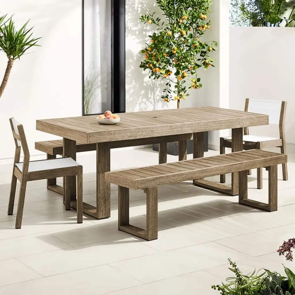 We made pairing easy with this ready-to-buy outdoor set. Our Portside 76.5" Dining Table fits up to two benches and two textilene-clad chairs, seating up to eight. Each piece is made from sustainably sourced-tropical hardwood that's wire brushed for a rustic finish. For set pictured, select 1 Portside Outdoor Dining Table, 2 Portside Benches and 2 pair of Portside Textilene Dining Chairs. Components are priced individually. Table & benches: Solid tropical hardwood with a wire-brushed finish. Chairs: Solid hardwood frame and easy-to-clean textilene® fabric in Gray (Weathered Gray) or White (Driftwood). Made with FSC®-certified wood from responsibly managed forests. Table includes umbrella hole at center. Table features sleigh legs. Outdoor cover available (sold separately). Made in Indonesia.