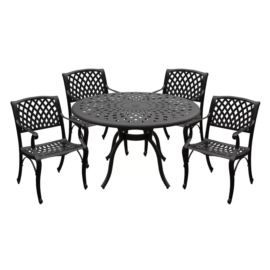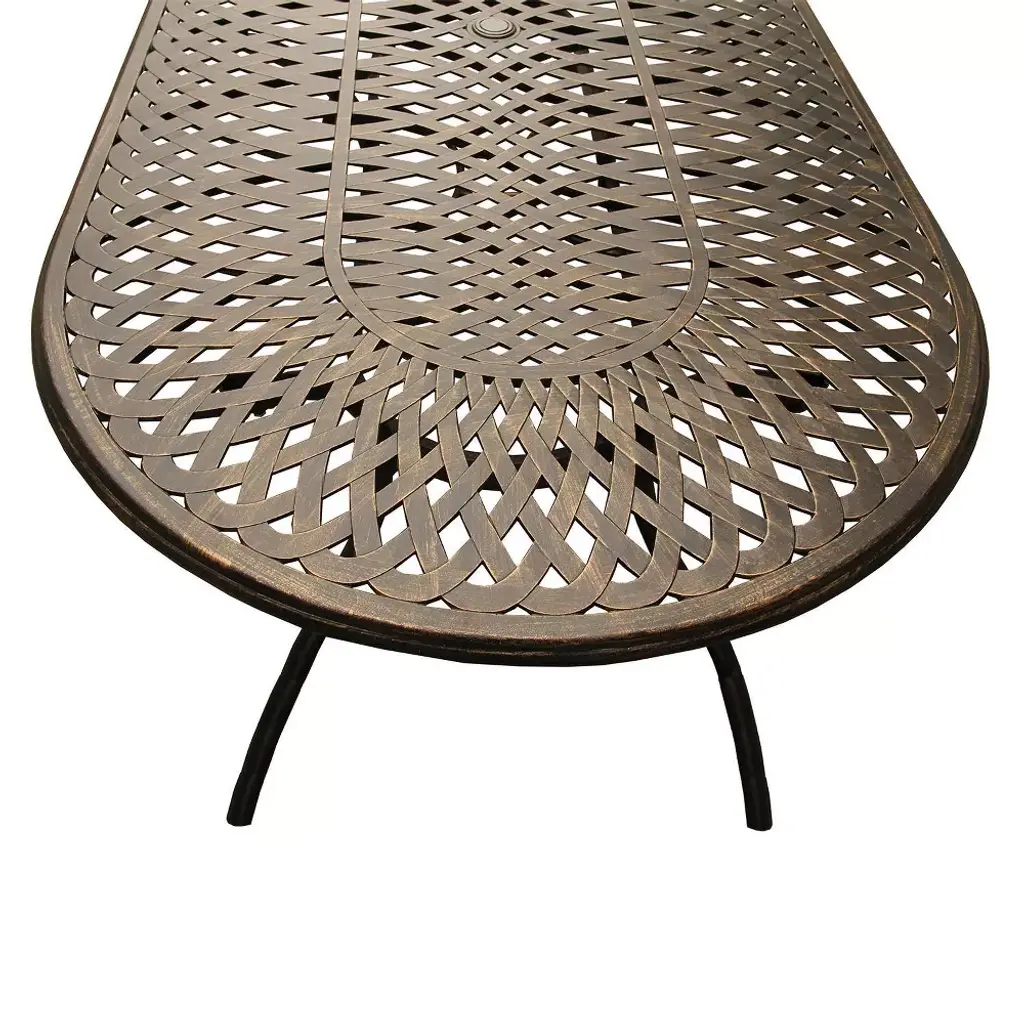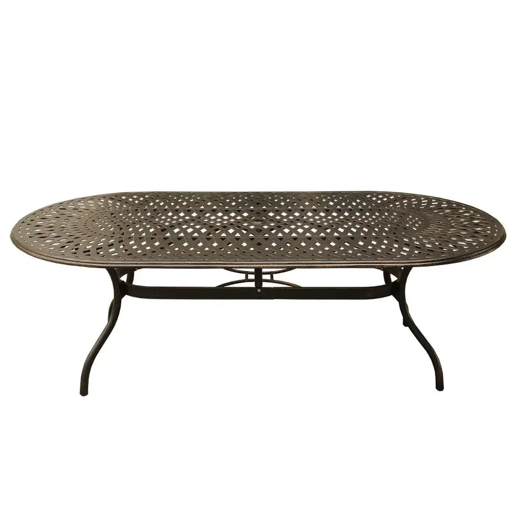 Constructed of cast aluminum in UV resistant, powder coated, hand applied bronze finish, this large oval 95 inch dining table set with 10 cast aluminum chairs features a top that is designed specifically to prevent damage caused from pooling by allowing water to pass through freely. Made specifically for large families or entertaining guests, this mesh lattice mordern contemporary oval oblong dining table set is ideal for any outdoor patio, porch, deck, balcony and backyard. Suitable for indoor or outdoor and commercial or residential use.