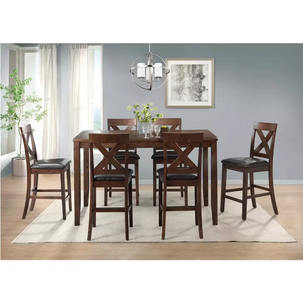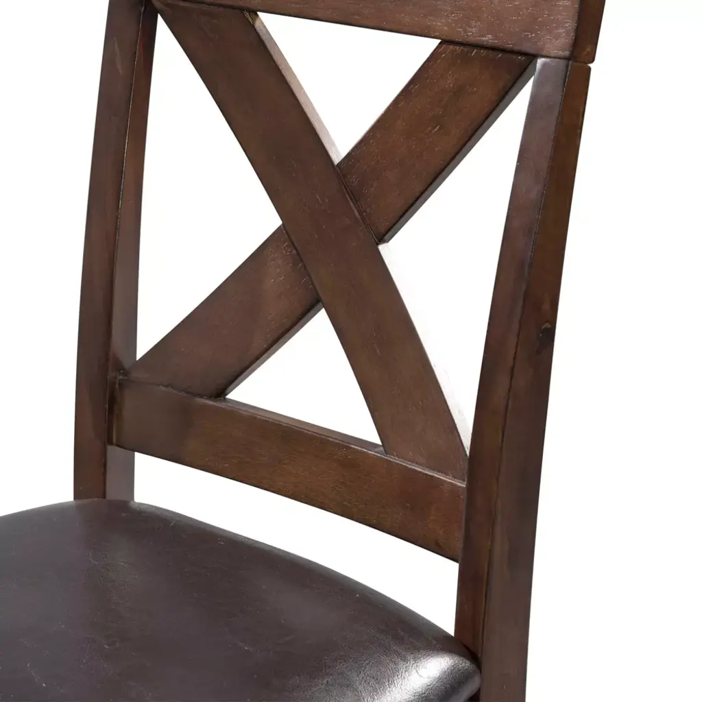 The Picket House Furnishings Alexa 7PC Counter Dining Set brings instant style to your dining room! This group features an X-Back design on the chairs, with a chocolate faux leather upholstered seat. The table is finished in warm cherry, completing the look of this group. This set includes a table and six side chairs.