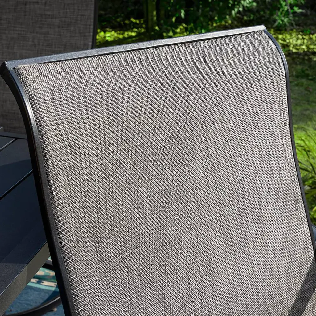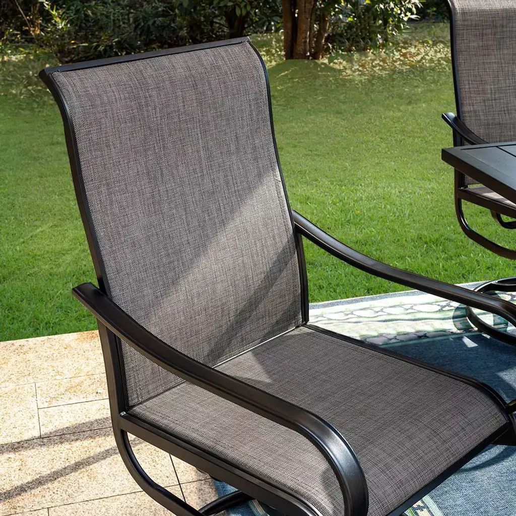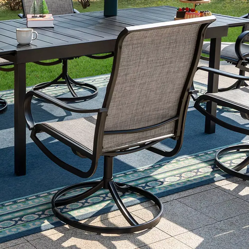 [CAPTIVA DESIGNS] Upgrade your outdoor dining with our 7pc Patio Dining Set. The black steel table seats 6, and the wood-like top adds indoor and outdoor elegance. The convenience of 360°Swivel Chairs boosts Breathable Quick-Dry Sling Fabric. It is designed to make your dining moments memorable.Crafted from E-coating and powder-coated steel frame, it's both sturdy and durable, making it suitable for any outdoor setting. Resistant to water, weather, and fading, it is suitable for indoors and outdoors, with easy assembly and maintenance for hassle-free enjoyment.FEATURES1.57" Dia umbrella hole for most market umbrellas.Wood-like table top with Elegant and natural appearance.Breathable Sling Fabric 360°Swivel chairs for enhanced comfortU-curve armrest, 3 steel bottom brackets, and triangle structure.E-coating and Powder-Coated Steel Frame for a sturdy centerpiece.SPECIFICATIONDining Table: 28.5"H x 38.0"W x 61.5 "L, 26.8" (floor to apron height)Swivel chair: 42.1"H x 22.9"W x 22.8"D, 24.8" (seat back height)Seat Dimensions: 19.5"W, 20.9"D, & 17.5" [floor to seat top]Package Includes1 x dining table (1 box)6 x swivel chairs (3 boxes)Instruction Manuals (come with each box)(Decorations on the table are not included)Tips: Allow all the holes in the section to line up correctly and then tighten the screws. Assembly: 30 minutes to set up the table and about 60 minutes to put the chairs together.