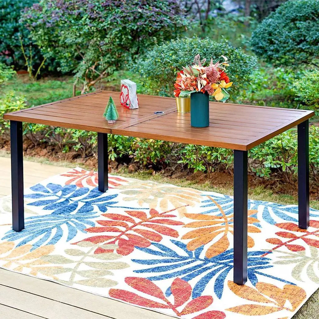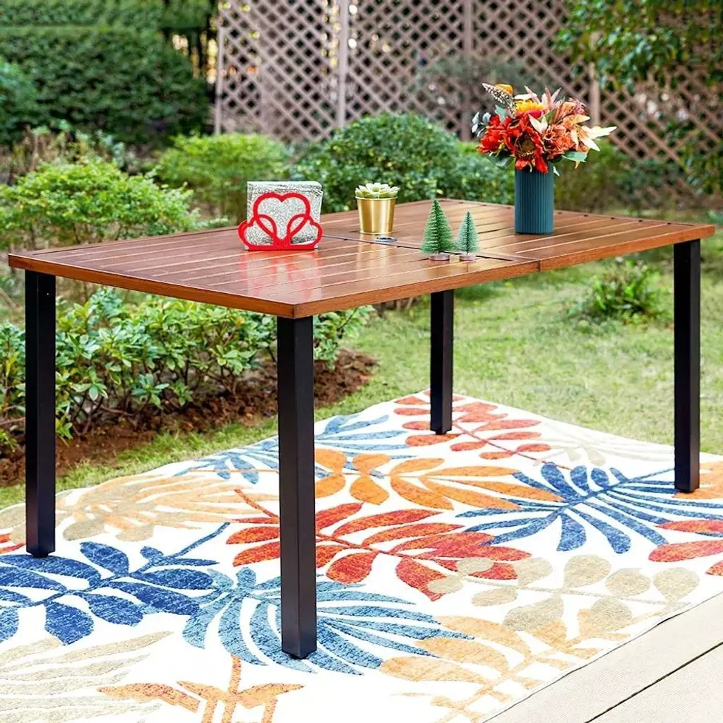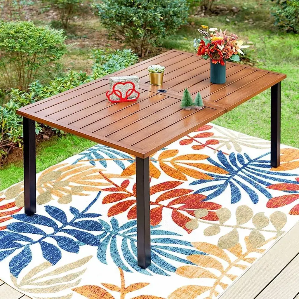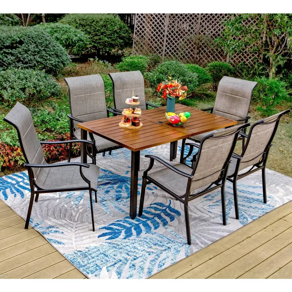 [CAPTIVA DESIGNS] Upgrade your outdoor dining with our 7pc Patio Dining Set, which features a premium metal frame and wood-like tabletop with a 1.57" umbrella hole.The table offers a rustic look with a durable faux woodgrain finish. The chairs offer comfort with breathable padded sling fabric, all supported by sturdy steel frames with powder coating. A perfect combination of style and function for your outdoor dining experience.FEATURESPremium Metal Frame - Sturdy metal construction.Wood-Like Tabletop - Attractive and durable.1.57" Umbrella Hole - Shade option on sunny days.Breathable Sling Fabric - Comfortable seating.Padded Textilene Fabric - Perfect balance of comfort and support.SPECIFICATIONDining Table:29"H x 36.25"W x 59.75"L, 27.1" (Floor to apron height)Sling Chair: 42.1"H x 23.2"W x 22"D, 25.2" (seat back height)Seat Dimensions: 19.6"W x 18.8"D, & 16.5" [floor to seat top]Weight: 18.74 PoundsPackage Includes1 x Dining Table (1 box)6 x Sling Chairs (3 boxes)Instruction Manuals (come with each box)(Decorations on the table are not included)Tips: Allow all the holes in the section to line up correctly and then tighten the screws. Assembly: 30 minutes to set up the table and about 60 minutes to put the chairs together.