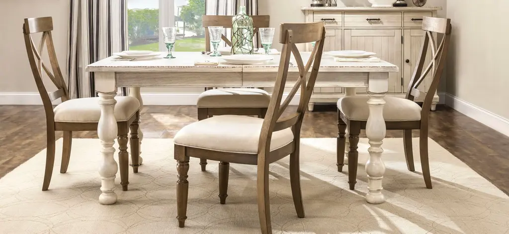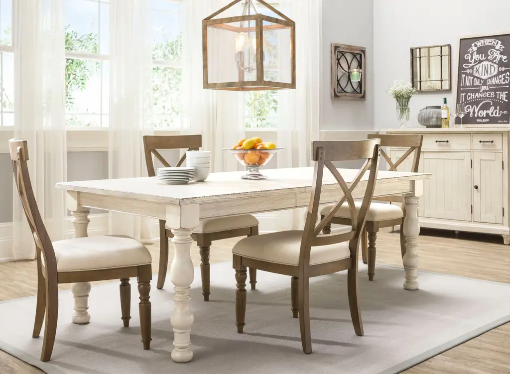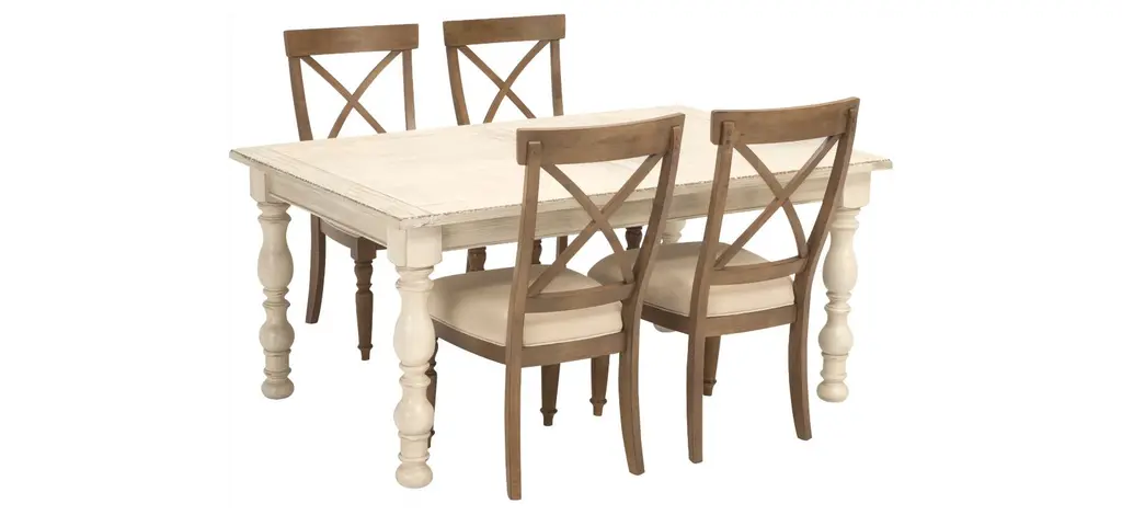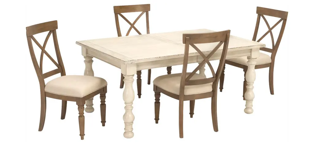 If you're looking for something with a casual cottage vibe, you'll love the Aberdeen 5-piece dining set! This collection is a stunning example of a country casual retreat at its finest. Distressed finishes offer worry-free care, so you can focus on entertaining instead of dings and scratches. Topped off with features like the plank-style tabletop and the two-tone chairs, the Aberdeen creates a charming dining experience.