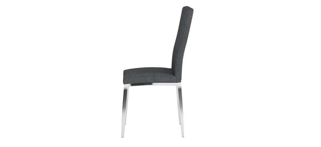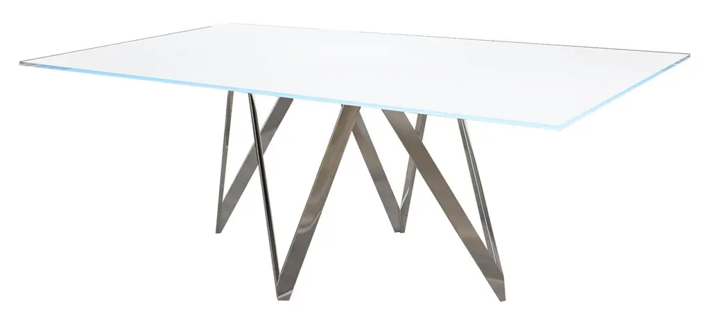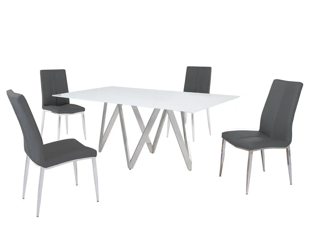This modern Abigail dining set features a super-white starphire glass table top on an art deco design stainless steel 4-legged base. The curved-back chairs are faux leather upholstered with decorative stitching, set on a sturdy chrome base.