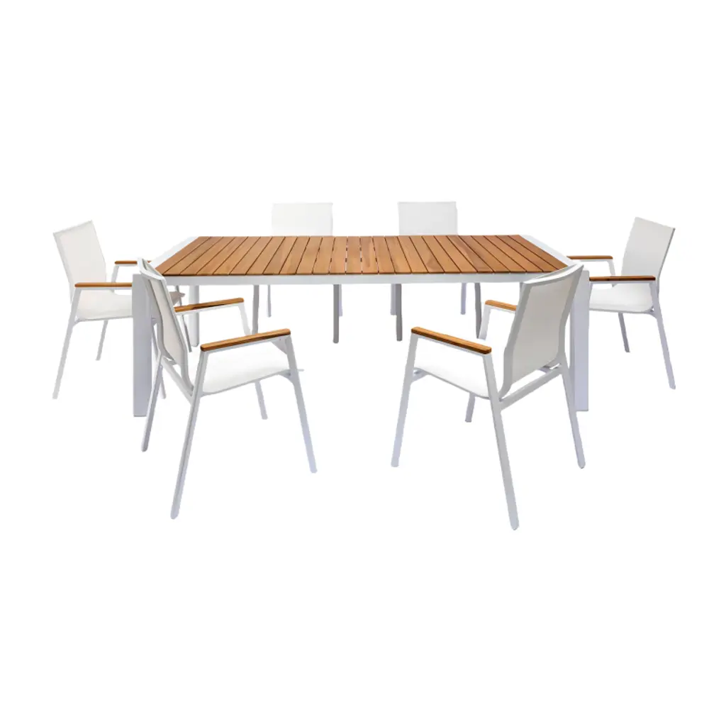 Getting everyone outside just got easier with the Aviana Outdoor Modern Dining Set White. Grab your drinks and food and take the whole family outside to enjoy your backyard with this 7-piece set. Made with functionality in mind, the Aviana Outdoor Modern Dining Set remains pristine through rain or shine with weather resistant material. Pair with the Hatay Modern Umbrella for some shade during sunny summer days. *Care Instructions* Buff lightly with Sandpaper to Clean and Restore Smooth Finish on Teak.To Preserve Golden Brown Finish of New Teak ; use a Teak Sealer Regularly. DISCLAIMER: To ensure the longevity of outdoor furniture, store items in a clean, dry place.