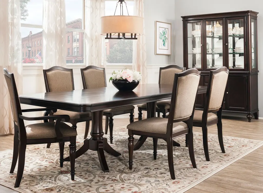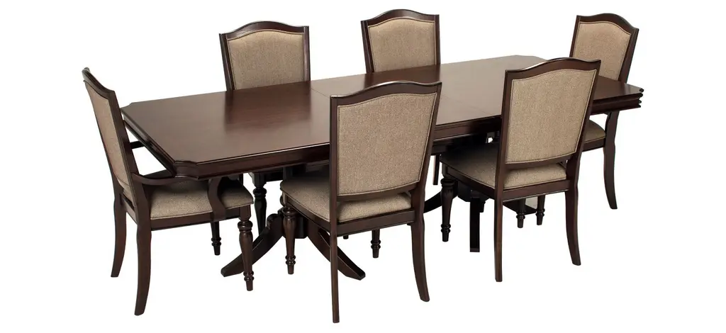 Refined yet relaxing, the Bay City 7-piece dining set delivers elegance that's fit for a formal gathering. The upholstered chairs will lend a sense of comfort and ease to your sit-down meals, while classic turned legs and beautiful cherry veneers add to the group's character. When it comes to entertaining, a 20-inch extension leaf will ensure there's ample room for your dinner guests. <a href="" dining-rooms dining-accessories bay-city-dining-table-protector-659926158">Matching Table Protector</a>