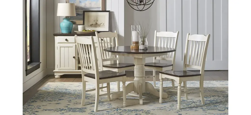 The British Isles 5-pc. slatback drop-leaf dining set is constructed of solid Rubberwood and designed with traditional country appeal.