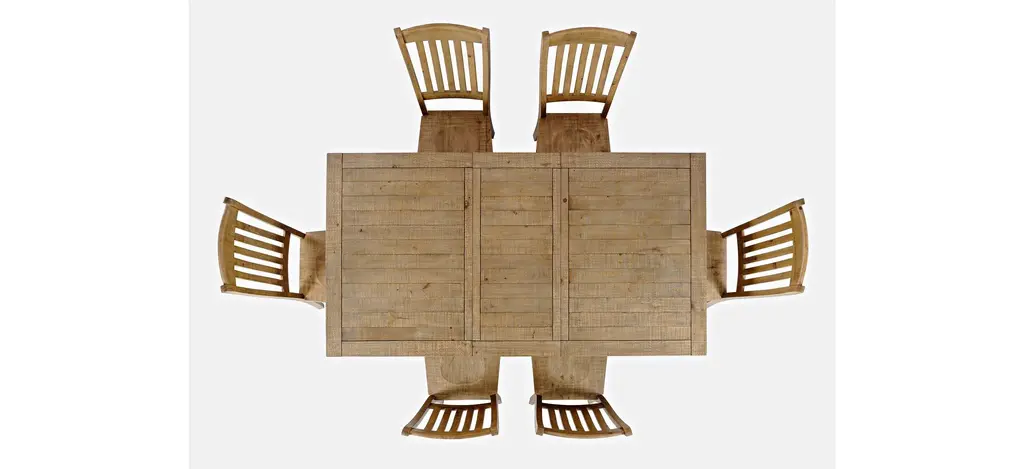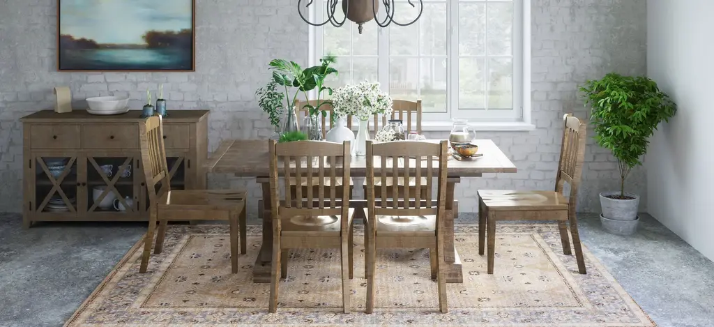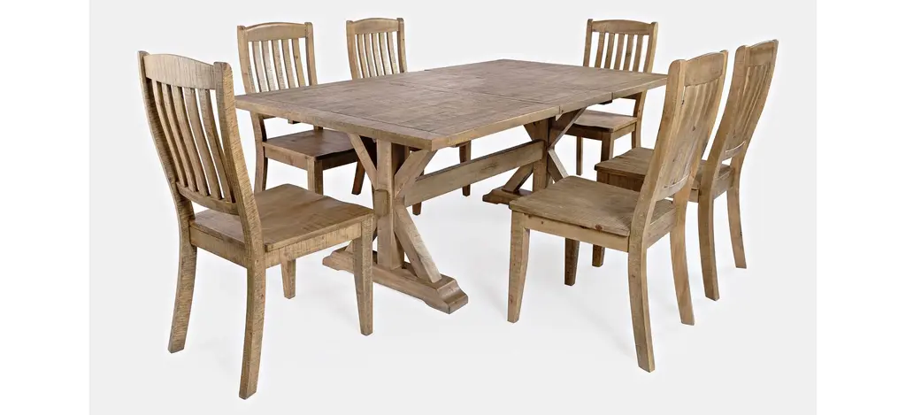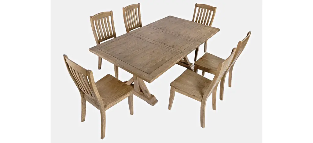 Rustic solid pine on a farmhouse pedestal and trestle base creates the perfect blend of classic and modern style with this Carlyle Crossing Dining Set. This set includes one extendable dining table, and six matching upholstered dining chairs. The base with cross-beam supports are naturally distressed with plenty of character, and a table top with a unique framed corner design adds a unique cottage flair. Each table includes one removable 18" extension leaf to bring the table to a maximum length of 78" and perfect for extra seating when entertaining guests or larger family dinners.