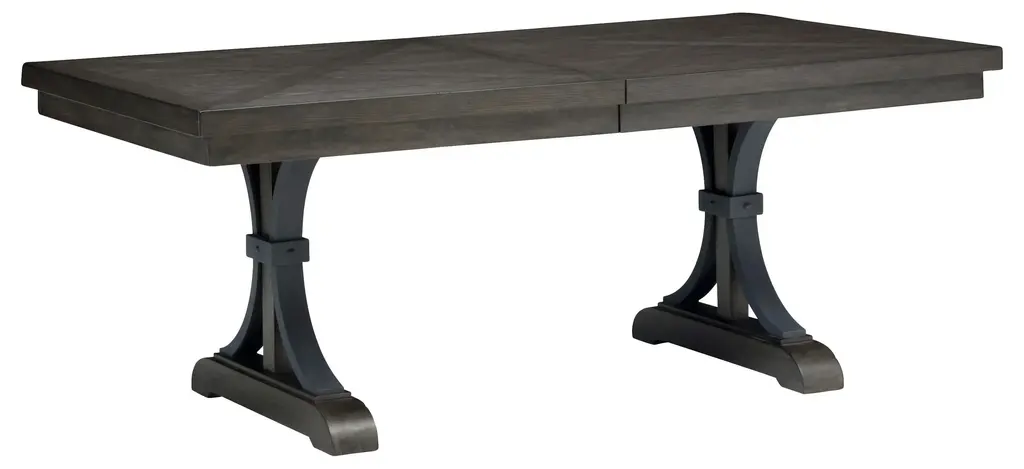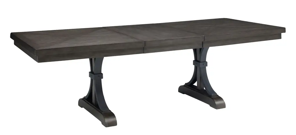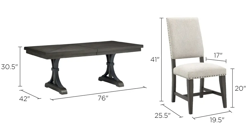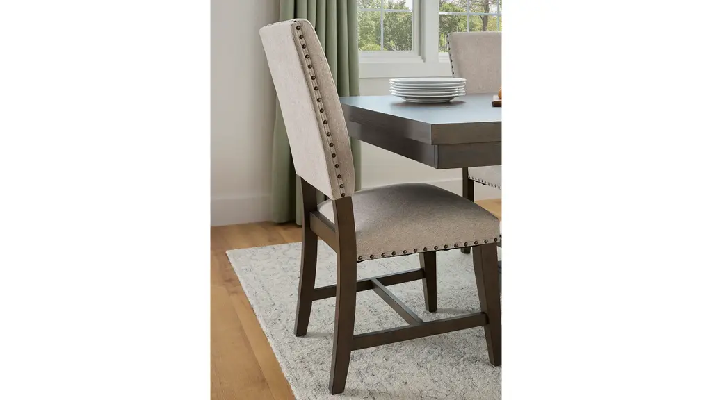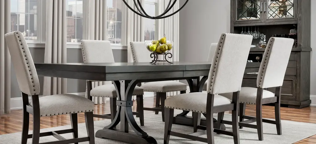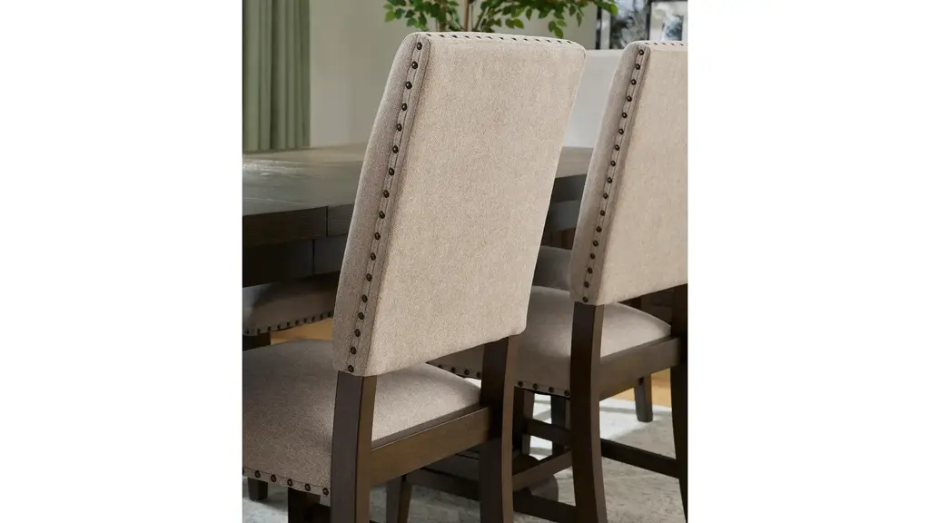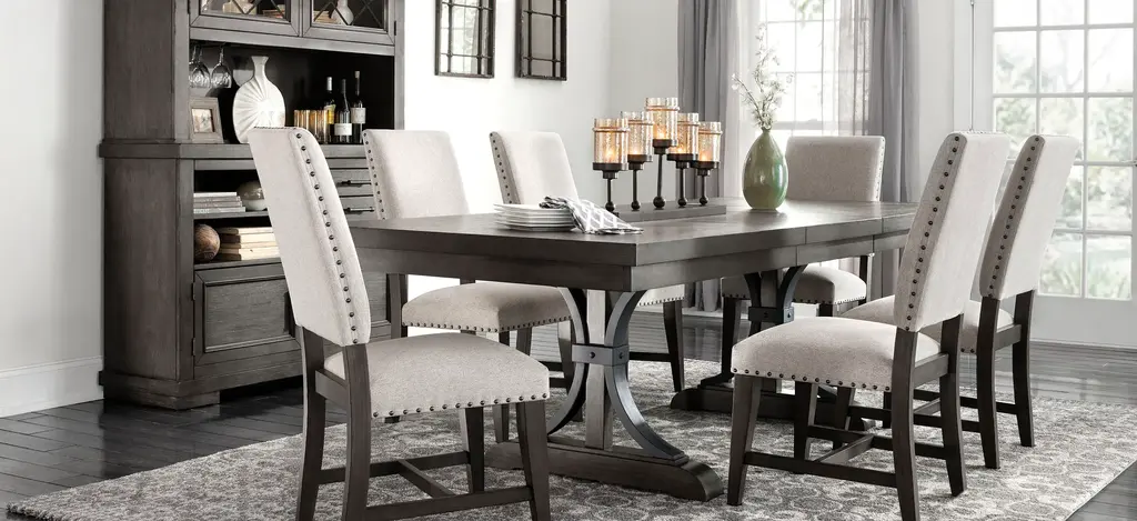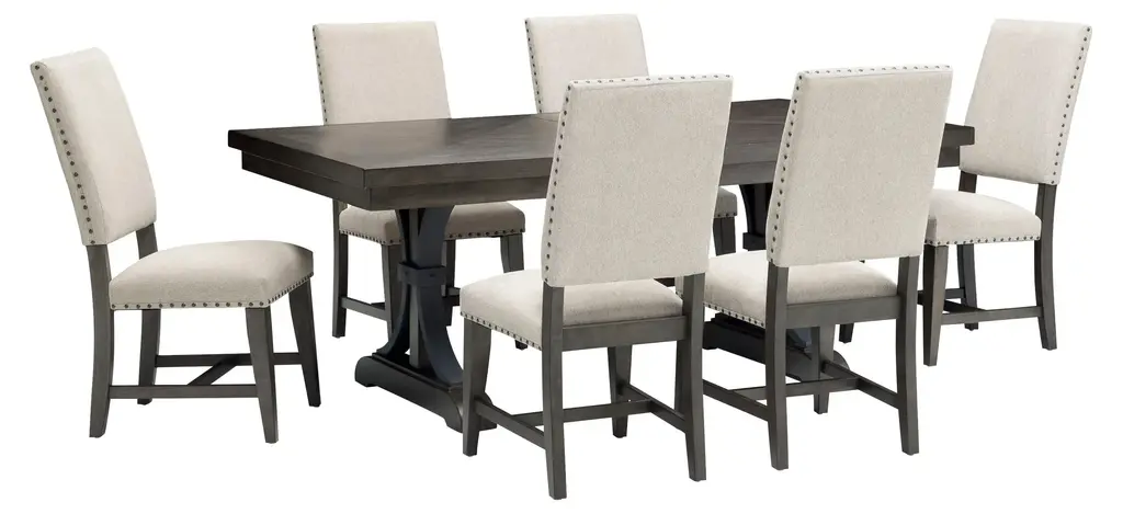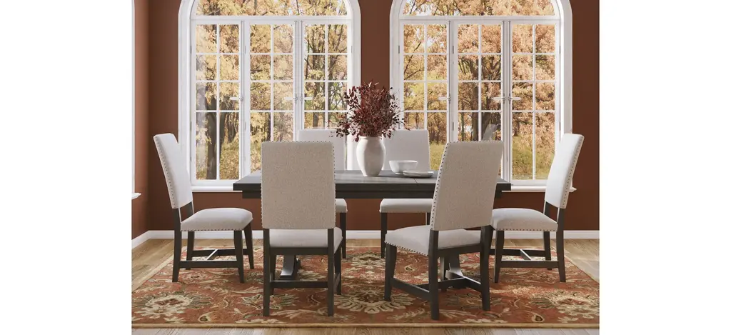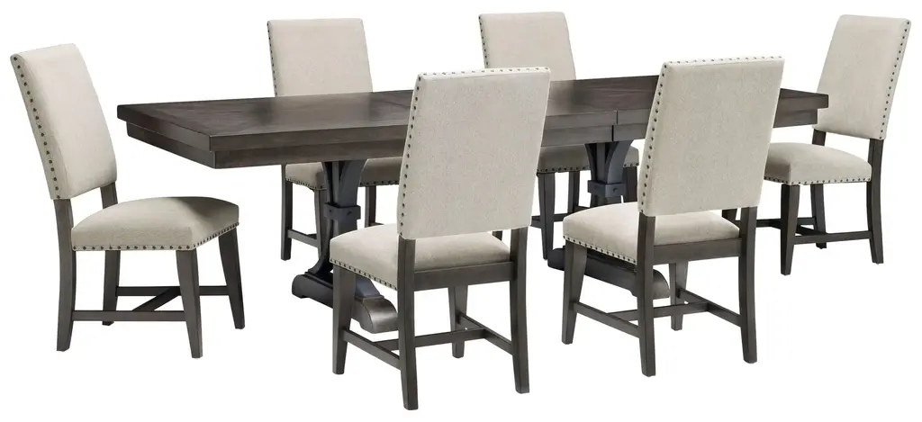 When it comes to the Halloway 7-pc. dining set, strong lines and eye-catching detail create a transitional look that serves up fine dining for a variety of decorating styles. Distressed, espresso finish and parquet pattern oak veneers showcase this set's natural beauty, while details like nailhead trim add a rustic touch. The upholstered chairs feature neutral colored fabric and are sure to make the sit-down dinner a comfortable experience. Matching Table Protector
