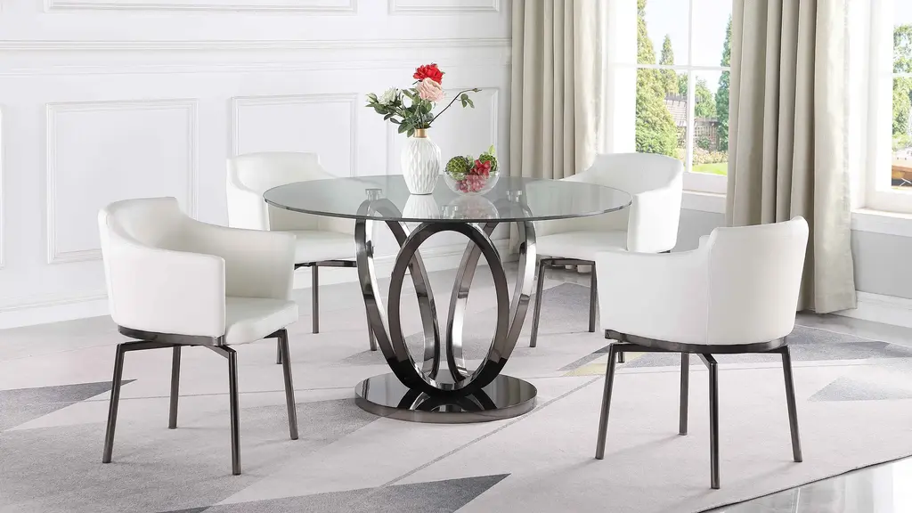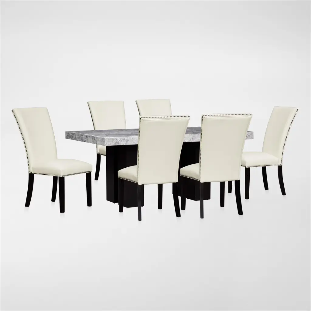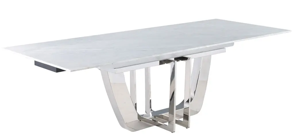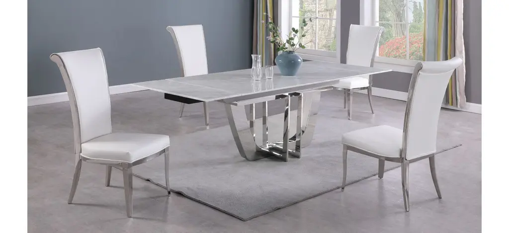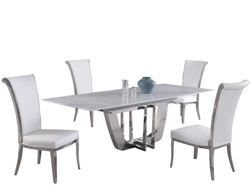This Joy dining set includes a Carrara marble top with two 14" pull out extensions that open the table to 95" on a polished stainless steel open design base. The 4 matching tall, rolled-back side chairs are uphostered in faux leather.