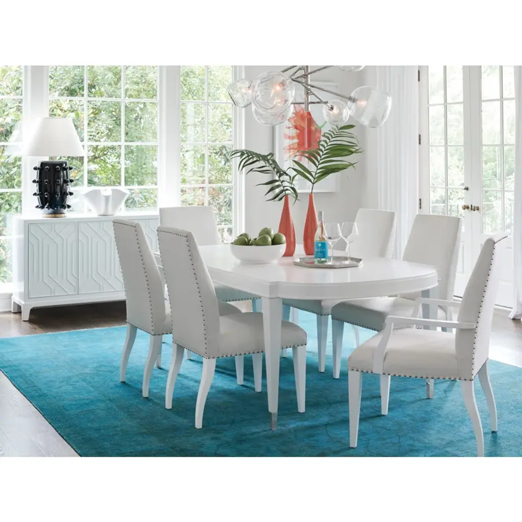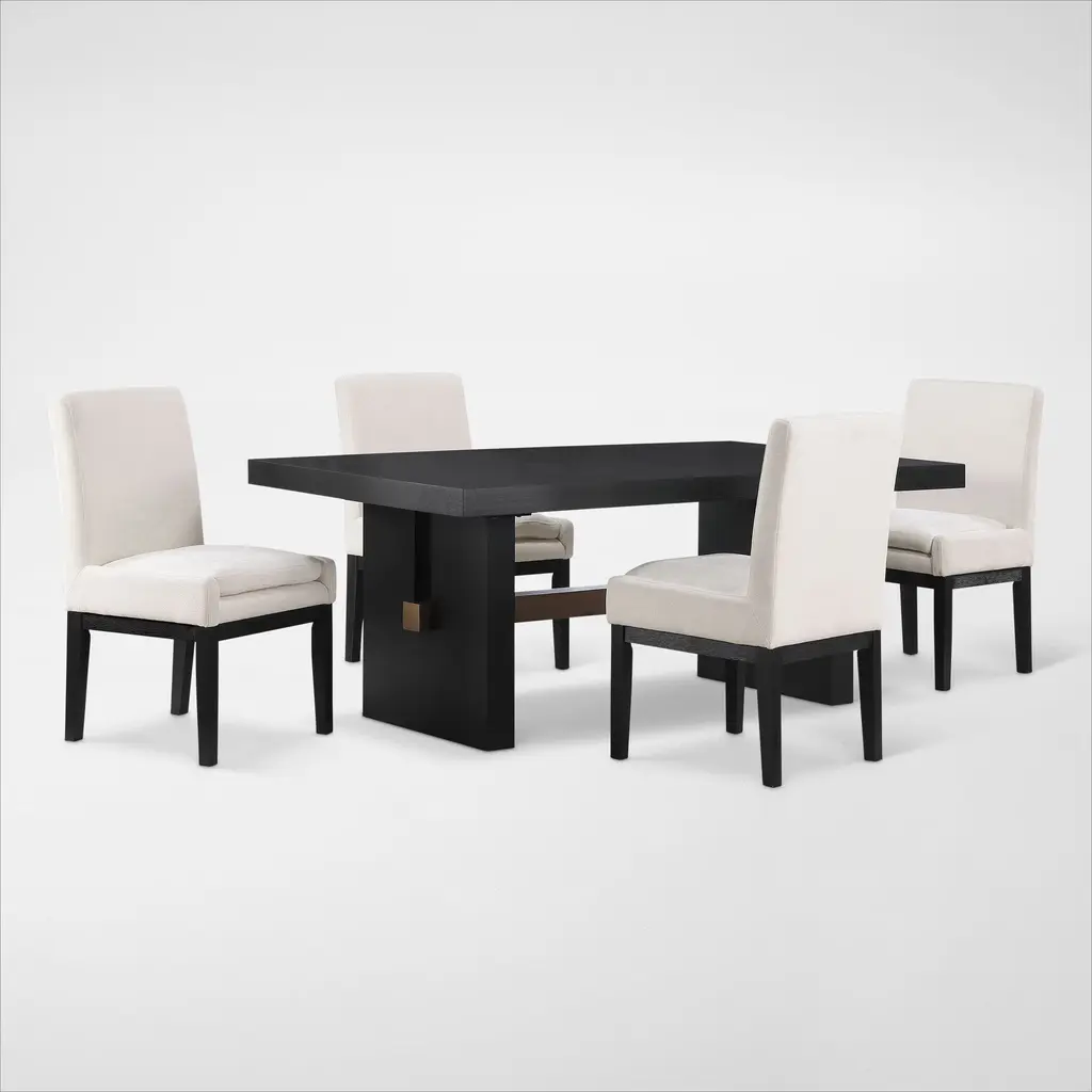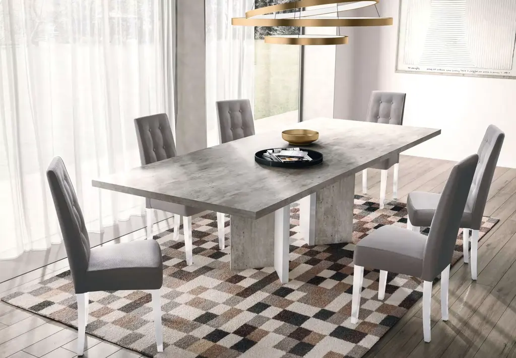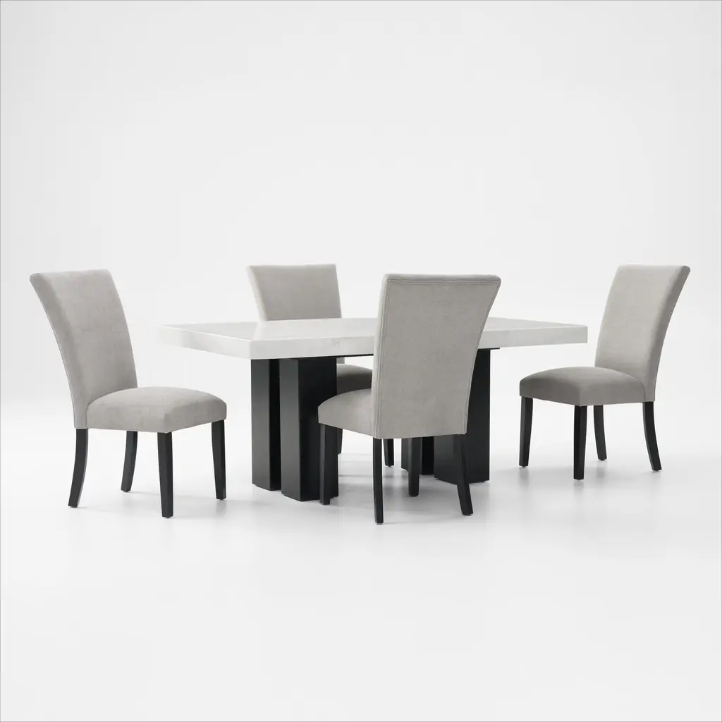 This Joy dining set includes a Carrara marble top with two 14" pull out extensions that open the table to 95" on a polished stainless steel open design base. The 4 matching tall, rolled-back side chairs are uphostered in faux leather.