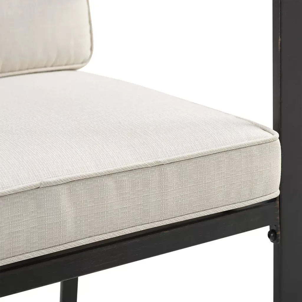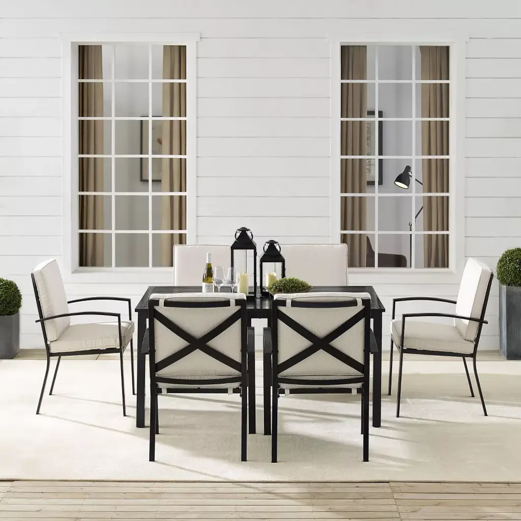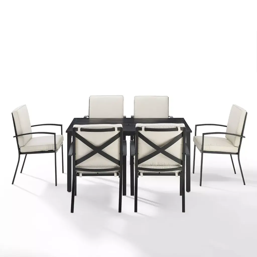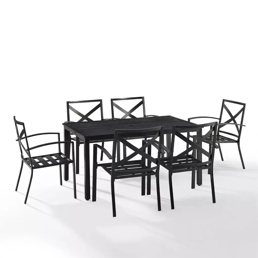 Gather around the Kaplan 7pc Outdoor Dining Set for an elegant meal al fresco. The rectangle table features a slatted design that elevates the sturdy steel construction and creates a perfect partner to the six outdoor dining chairs. Each chair showcases comfy back and seat cushions plus a classic x-back design. The table has a standard umbrella hole that will allow you to add some shade on a hot summer day. Simple and stunning, the Kaplan 7pc Outdoor Dining Set will be a welcome addition to your outdoor entertaining.