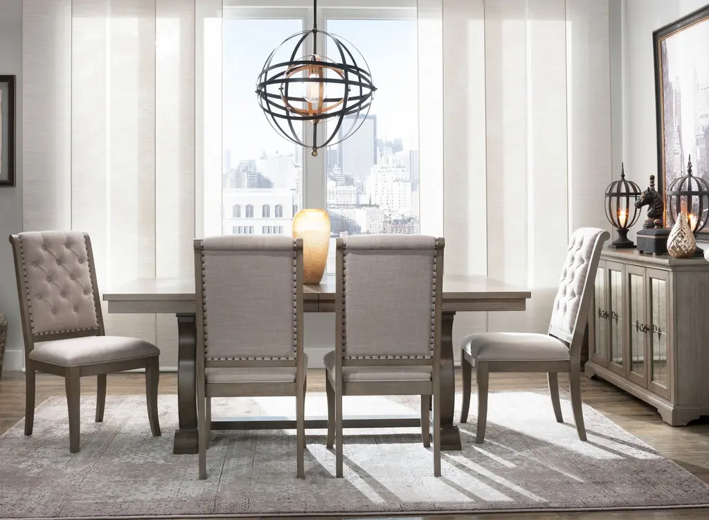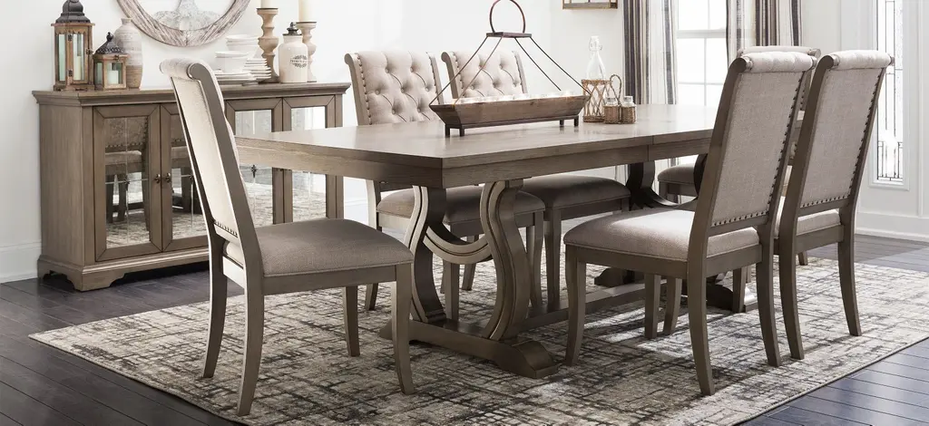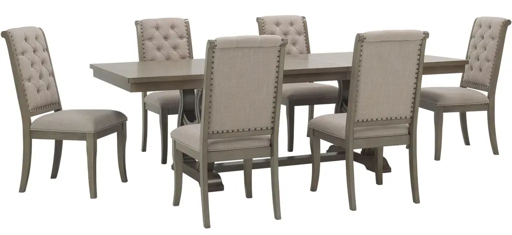 Have splendid gatherings with family and friends around the well-designed Lorient 7-pc. set. From the beautiful oak and poplar finished wood to fine details like nailhead trim and button tufting, this set has it all. Versatile seating options, with upholstered wingback armchairs and upholstered dining chairs in a neutral colored fabric provides additional visual interest. Aside from looks, Lorient is functional as well with a 12-bottle removable wine rack in the server and a 20-inch extension leaf that stows away inside the table when you don't need it. Matching Table Protector