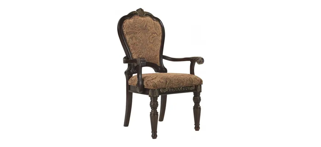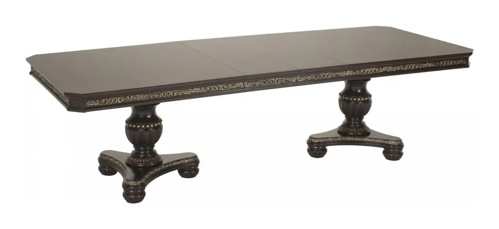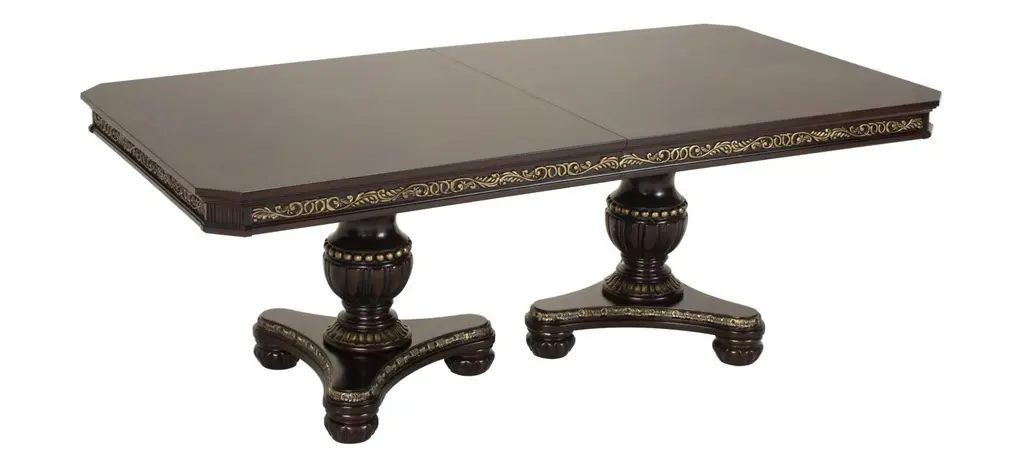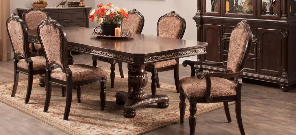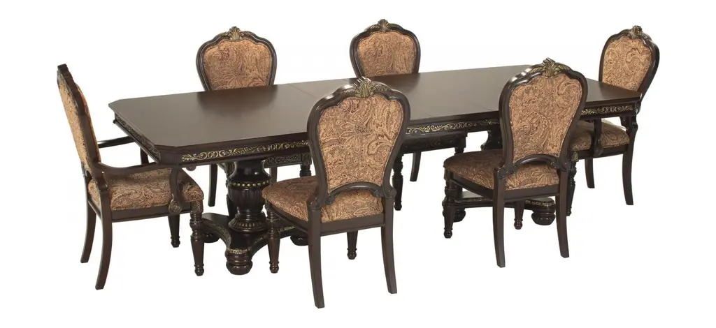 The stately details of the Regal Manor 7-pc. dining set characterize those of a cherished family heirloom. From the table's double pedestal base to the chenille-upholstered chairs, the cherry finish is highlighted by ornate carvings with gold tipping. Underneath the paisley-patterned fabric, polyurethane seat and back cushioning pair comfort with classic style. Whether you pull up a dining chair or armchair, both bring sumptuous seating to the table; and together the dining set imparts elegance and sophistication to any gathering. Matching Table Protector