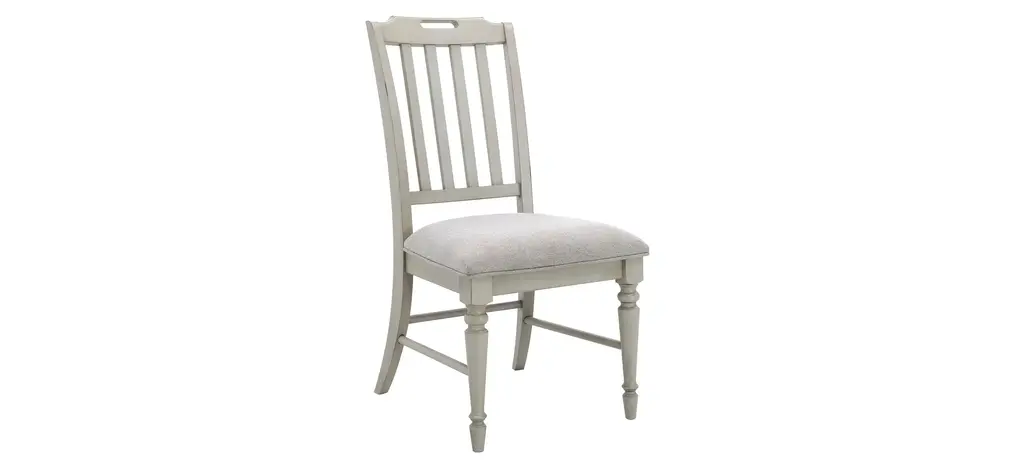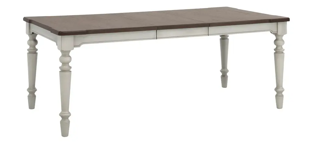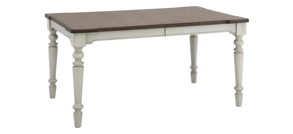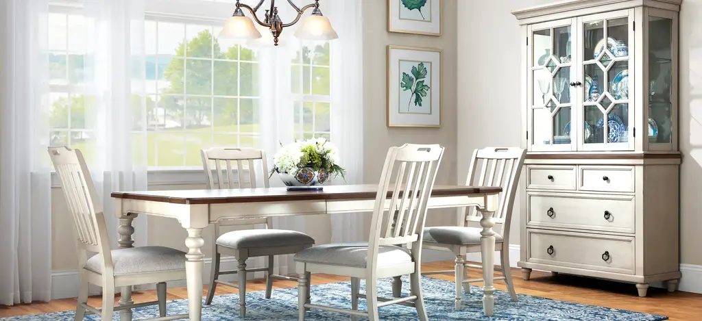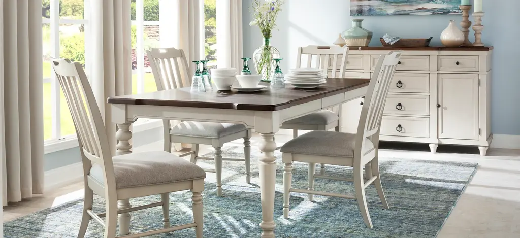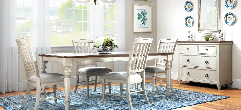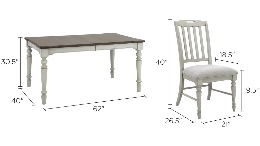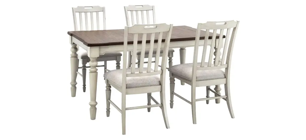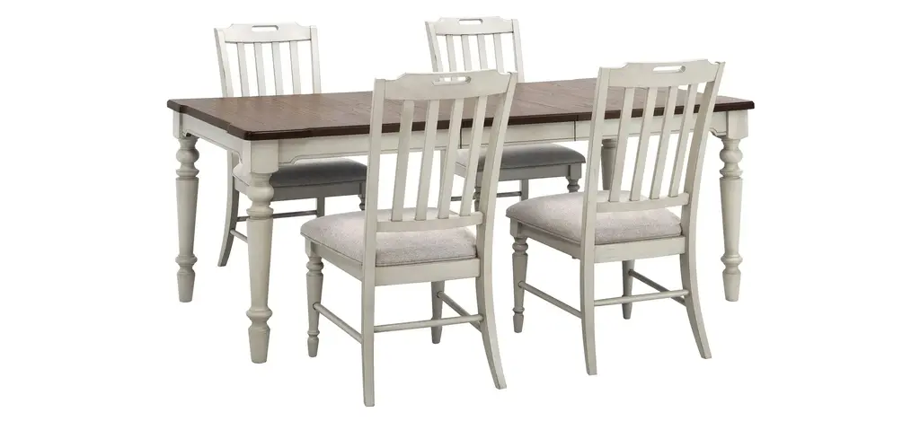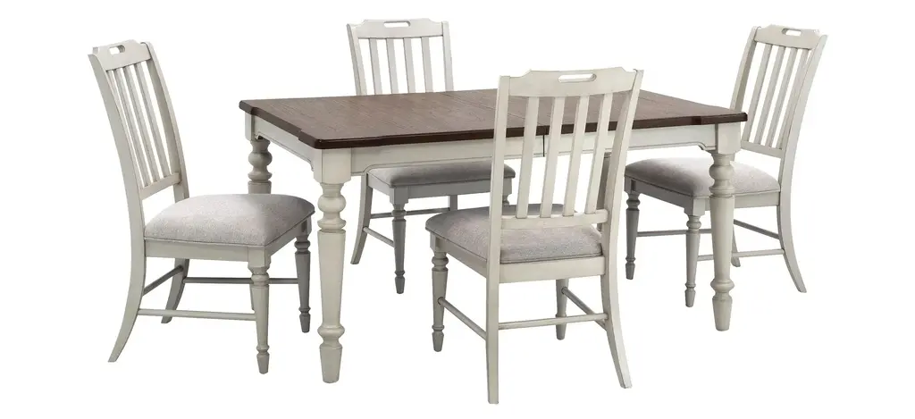 The Saybrook 5-pc. dining set creates the ideal atmosphere for everything from weeknight dinners to holiday feasts. This casual set's attractive two-tone finish combines off-white legs and chairs with a warm brown tabletop. Turned legs show off just a touch of traditional style which, when paired with the chairs' slat backs, creates a beautiful look of blended styles. Best of all, this set fully accommodates your family and friends with an 18-inch self-storing leaf. Plus, you can display your favorite china in the well-lit china cabinet and hutch. Matching Table Protector