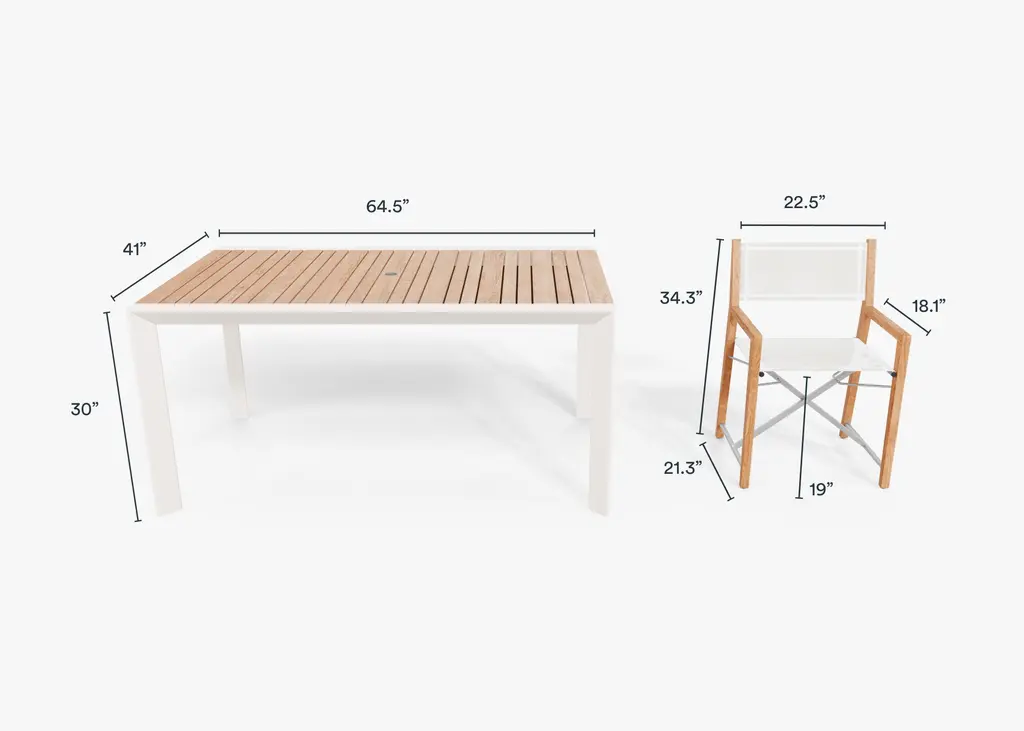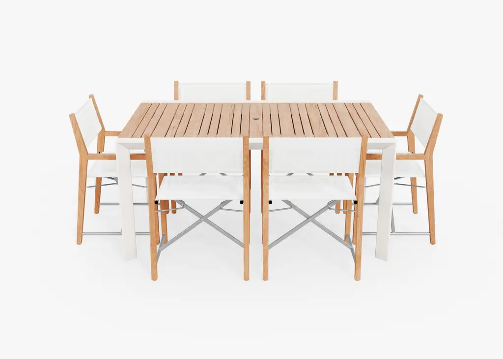 Our FSC® certified, Grade-A teak and powder-coated aluminum alloy dining table comfortably fits up to 6 people. The table is outfitted with the exclusive OuterShell®, which keeps your elbows clean by unfurling easily over the table when not in use, protecting it from dust, dirt, and pollen. Magnets keep it securely in place. The foldable director's chairs make rearranging and storage a breeze, and each is made from all-weather fabric that repels water, resists mildew, and endures sun, heat, and rain without fading.