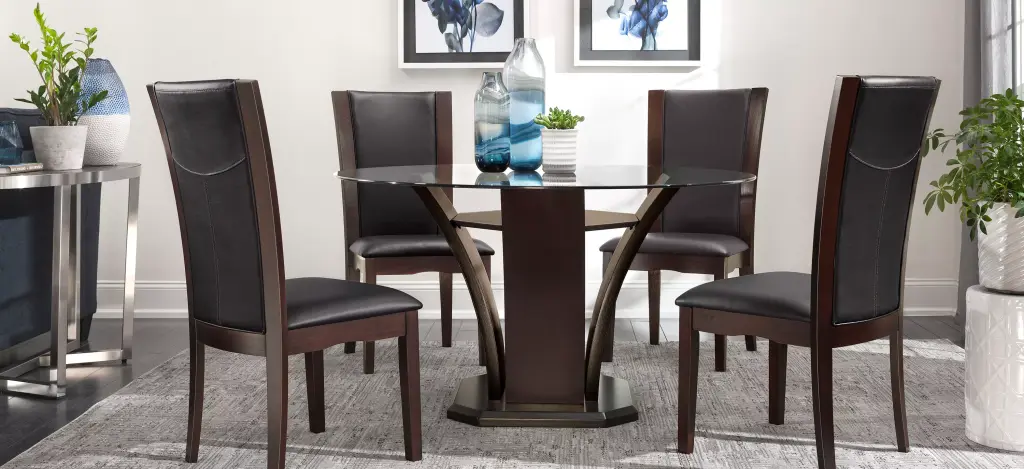 This Venice 5-pc. 54" glass dining set combines the small-scale coziness of casual dining with a more formal feel. The table features an elegant tulip base and a beveled glass tabletop that provides an open, airy feel. Plus, the easy-to-clean, faux leather chair seats provide a luxurious look.