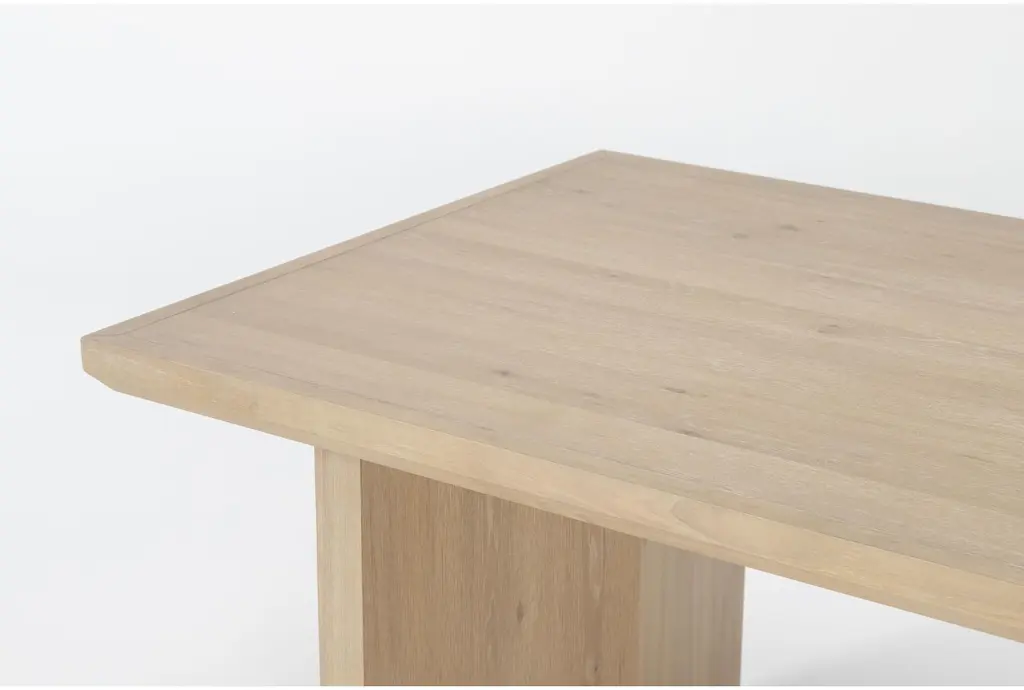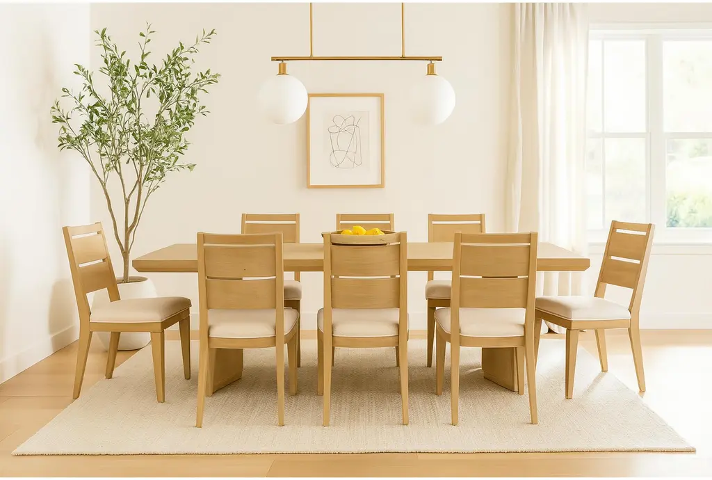 Transform your dining space with the Voyage Natural Rectangular 94" Trestle Dining Table and Wood Back Dining Table Chairs Set for 8 by Nate Berkus + Jeremiah Brent. The modern design features a natural finish that complements any decor, while the solid hardwood construction ensures durability and longevity. This 9-piece set offers comfortable seating for your family and guests, making it perfect for both everyday meals and special occasions.