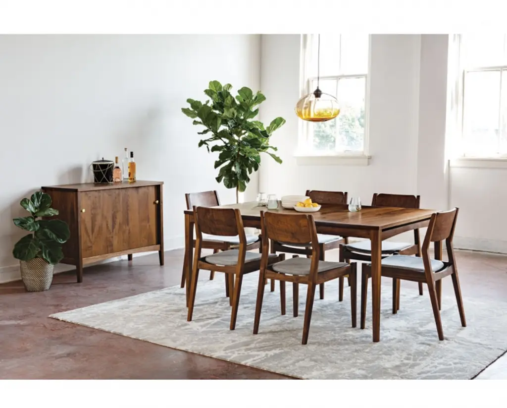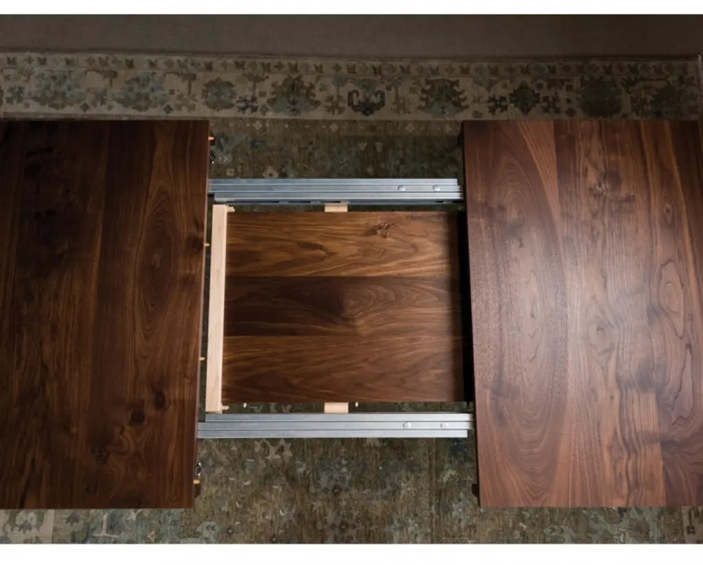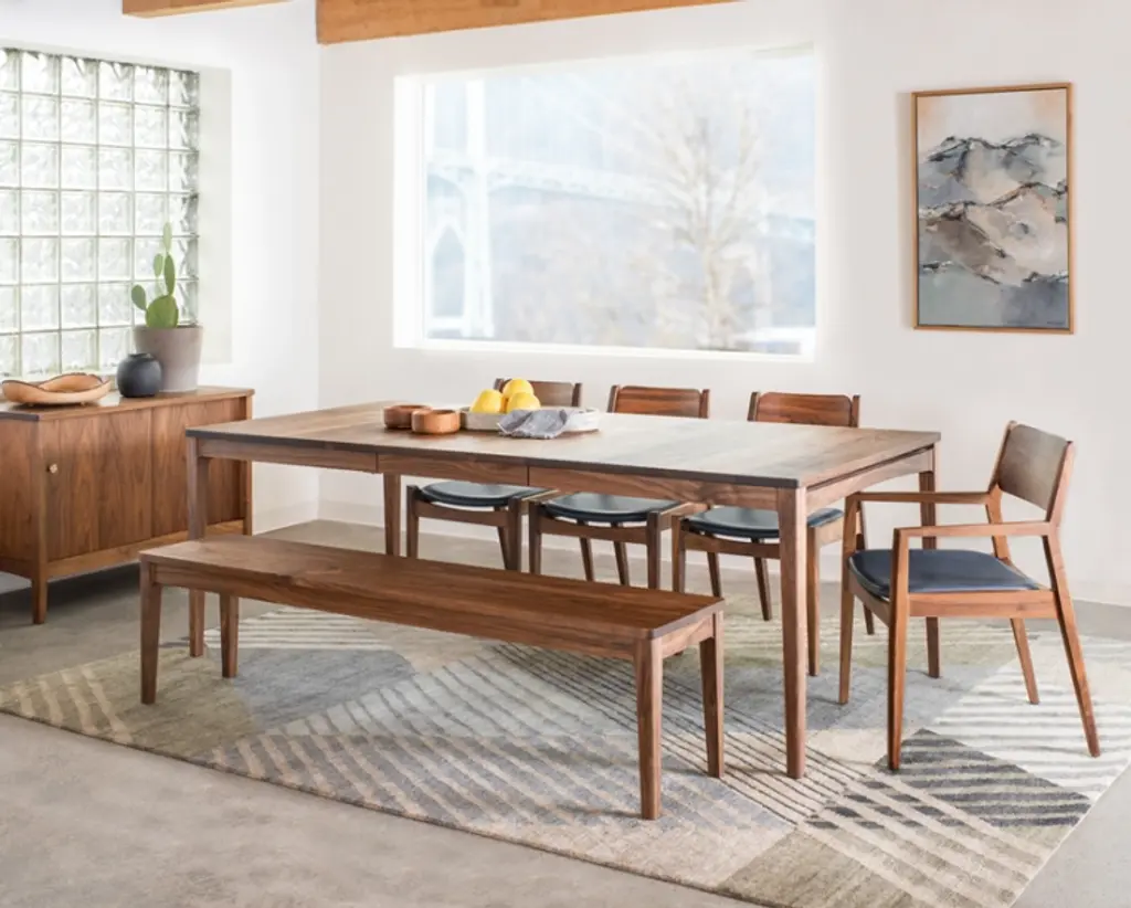 Handcrafted from solid wood, the Whitman Collection is inspired by Mid-Century Modern furniture and features a timeless look including round corners on tops, a unique leg shape with a curved mortise and tenon joint at the stretcher. The dining table is available in solid top, extension and extension with self-storing leaves.