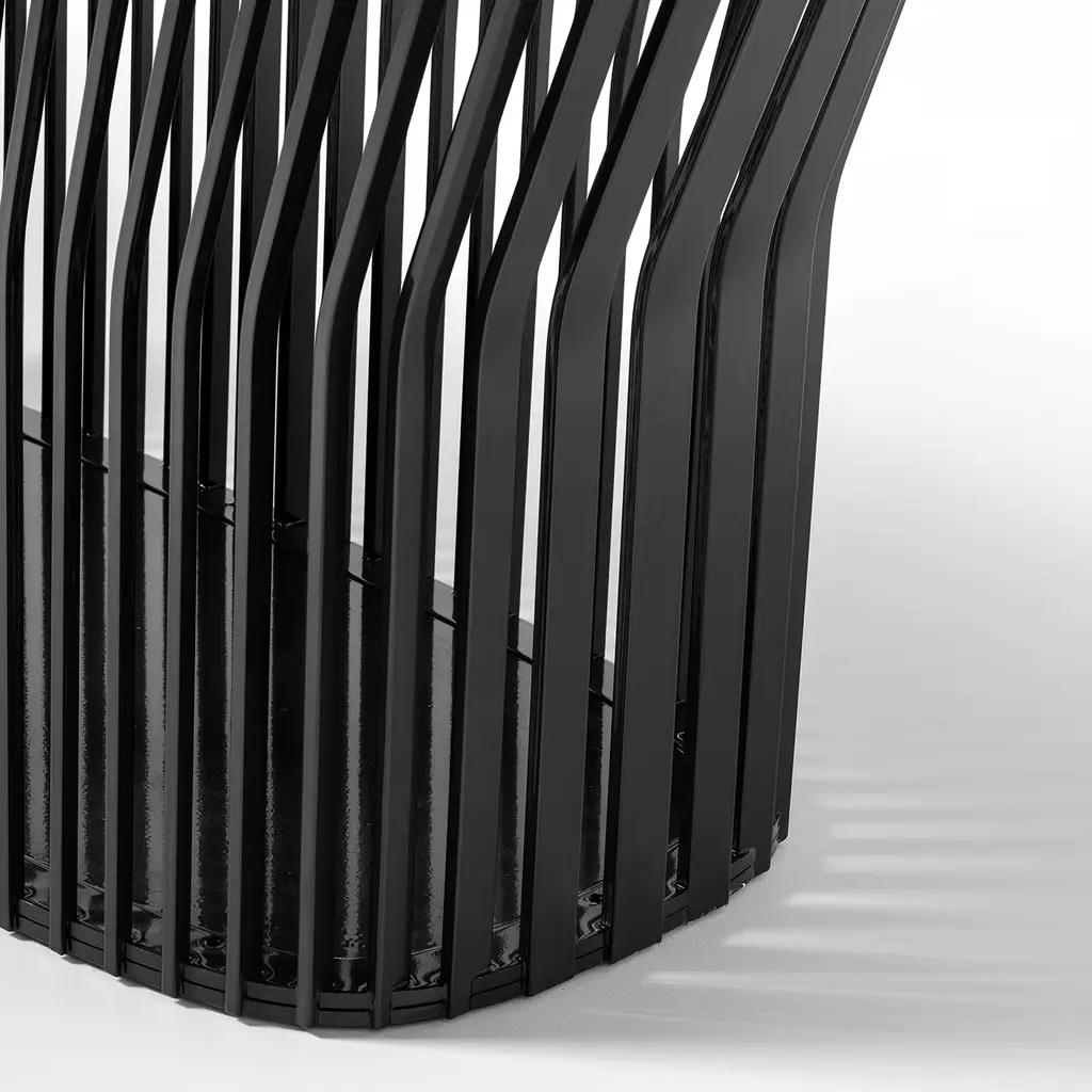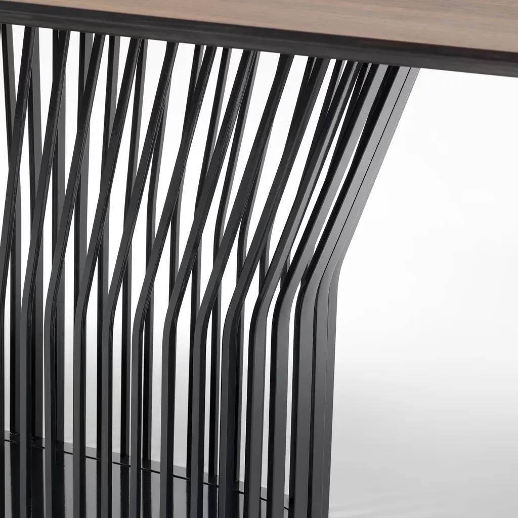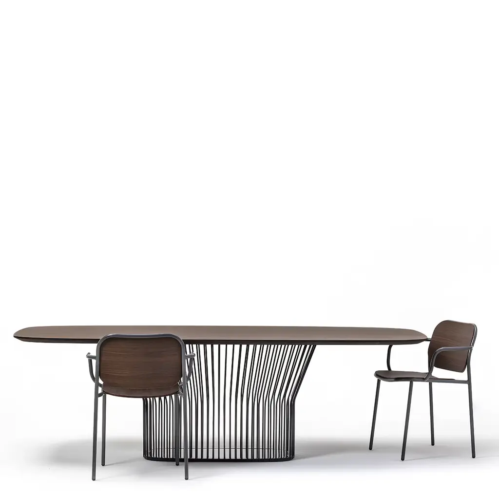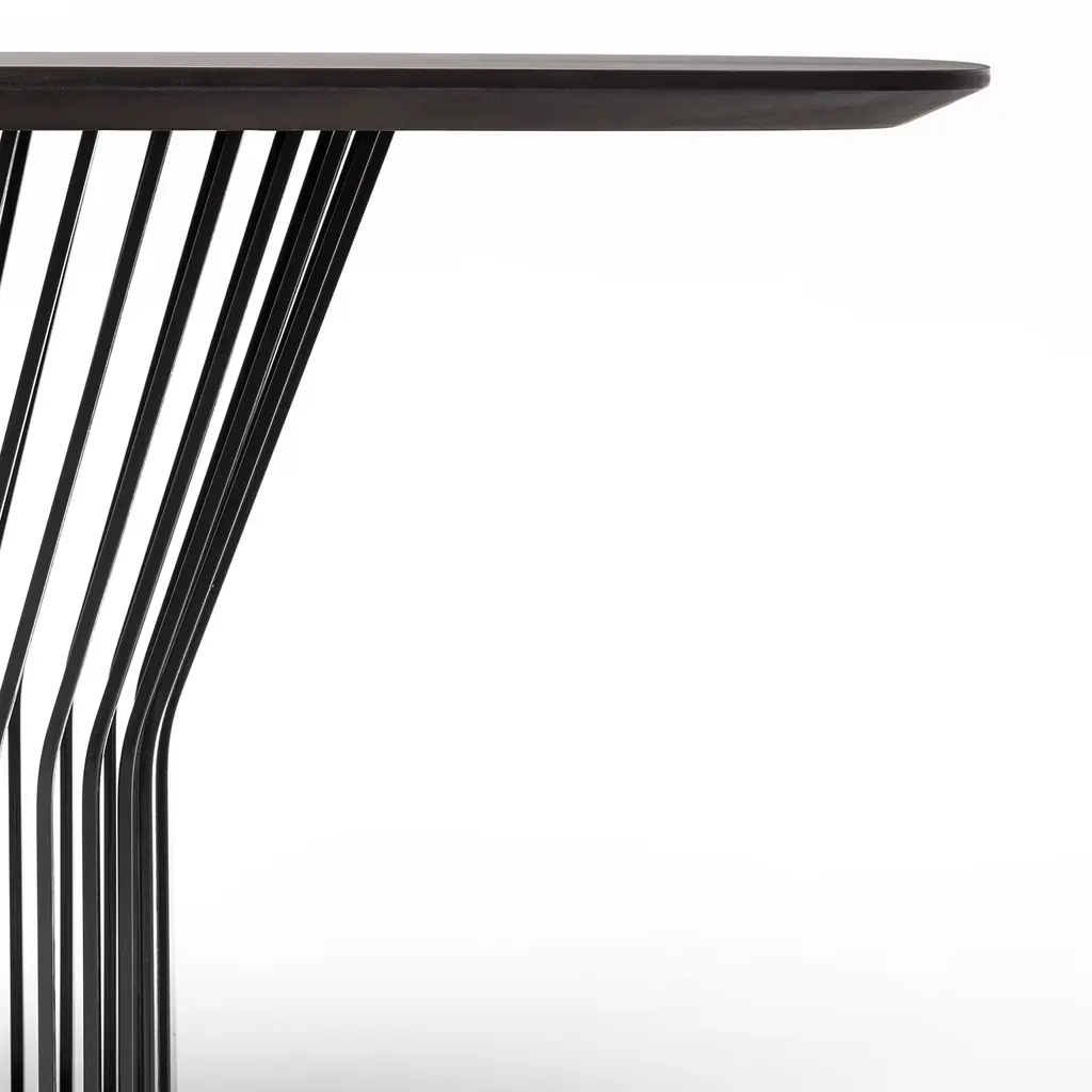 Stately yet airy, this dining table designed by Studio Gabbertas brims with sculptural allure. The sculpted rods extending from the perimeter of an elongated plate create an intriguing pedestal support for the top in heat-treated oak. A splendid addition to a contemporary dining or conference room, it comes in multiple variants. Please inquire with the Concierge for details and customization options.