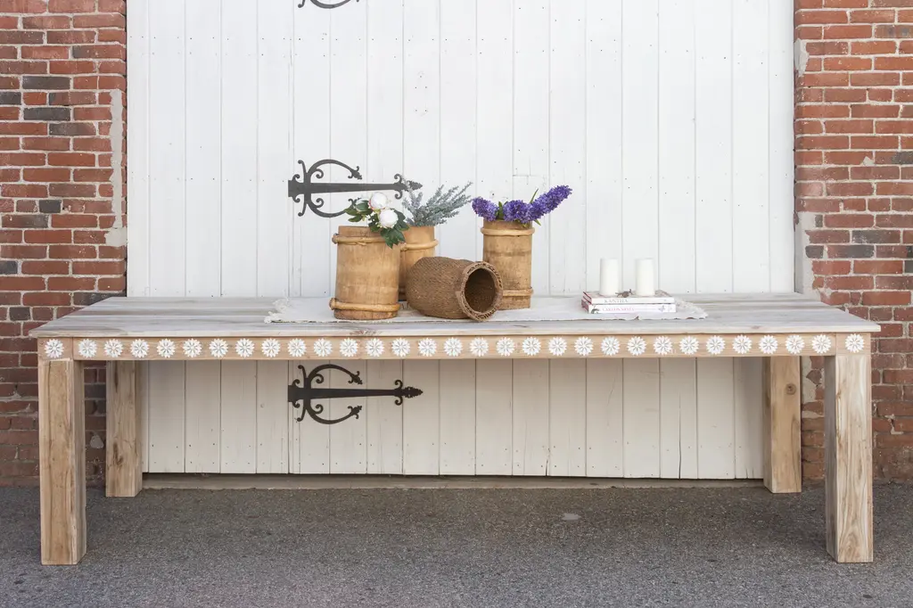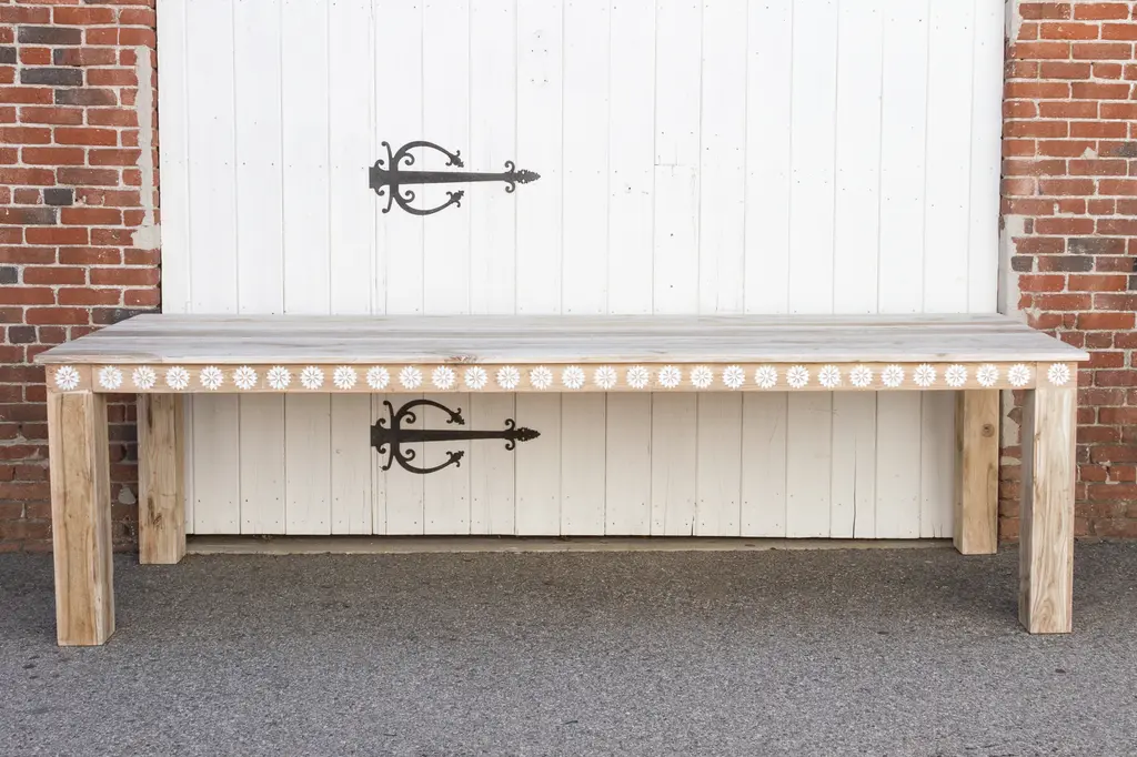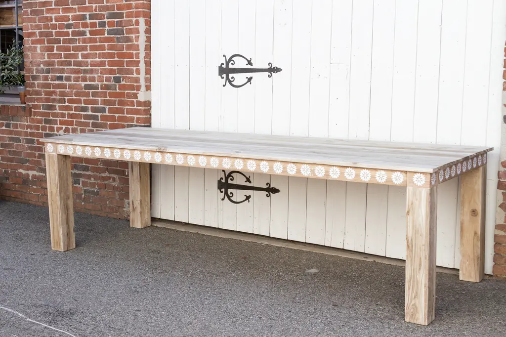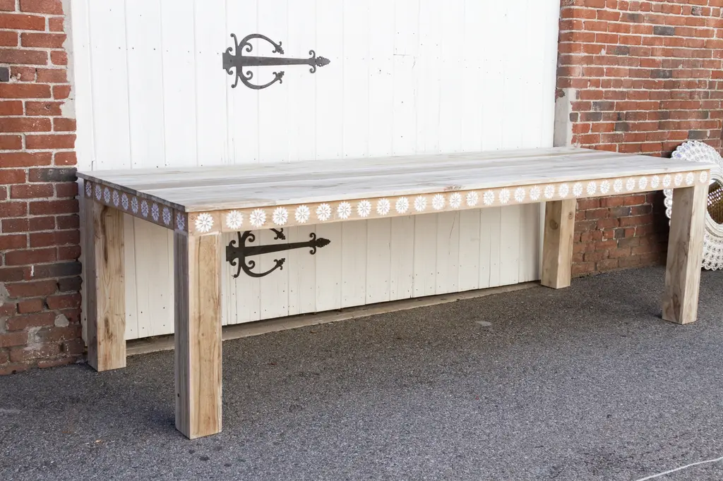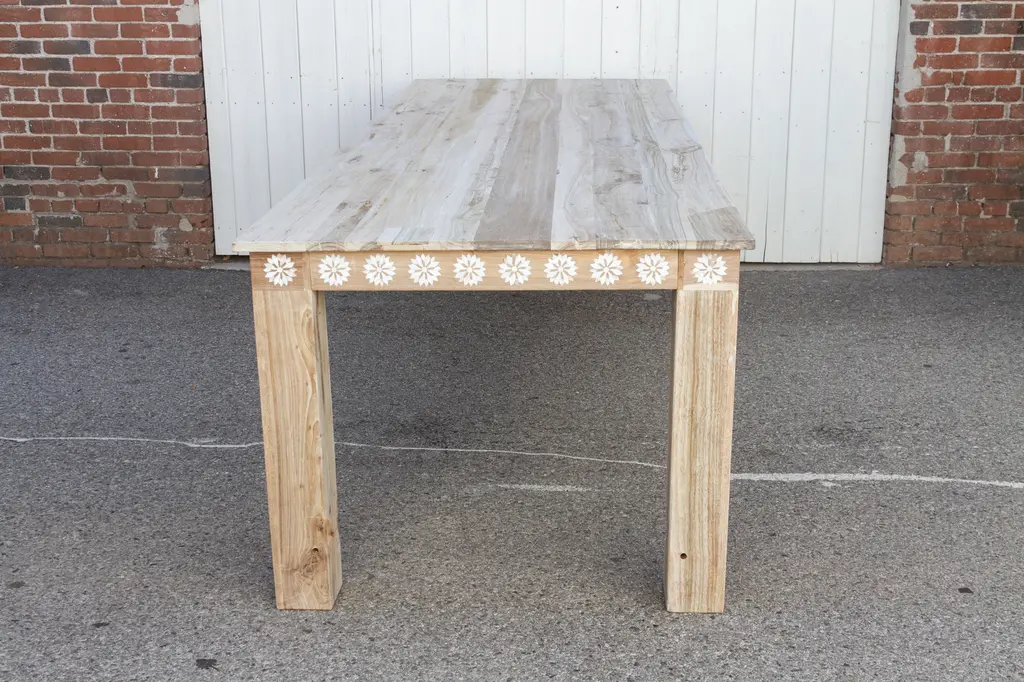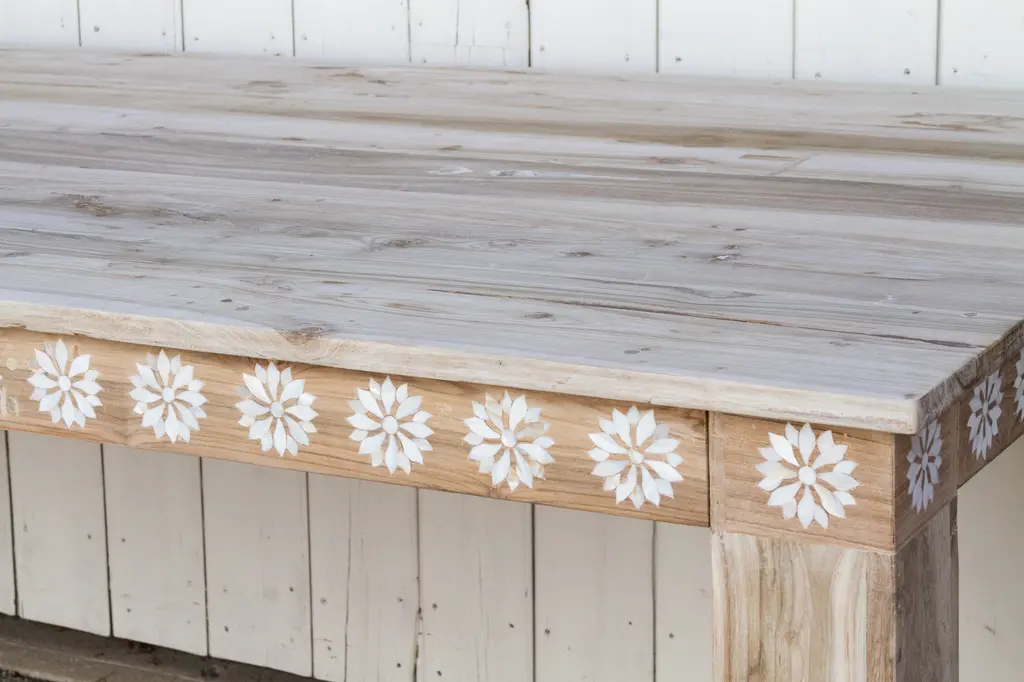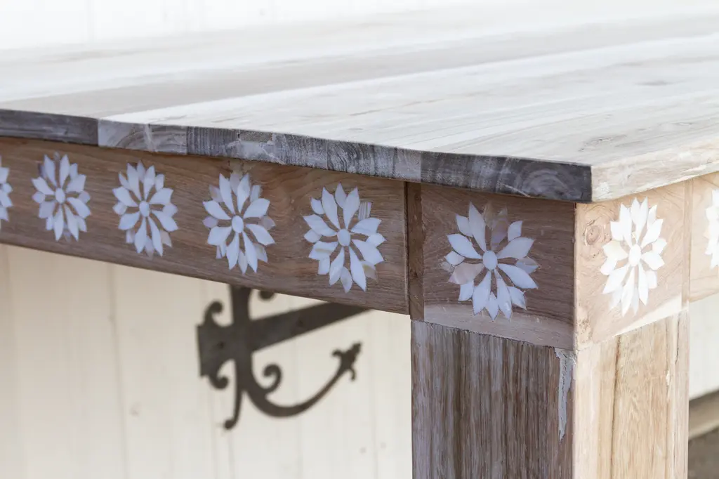 An impressive ten feet dining table with thick square legs and a lower shelf. Made from reclaimed teak, this large reconstructed table has a sun bleached finish with a beautiful inlay work in a floral motif. This table features blossom inlay designs across all the apron on all sides of the table. This table has six thick square sturdy legs. Please note, it does not have an outdoor grade sealer so if the table is exposed to the elements there will be oxidation and age marks showing on the wood.