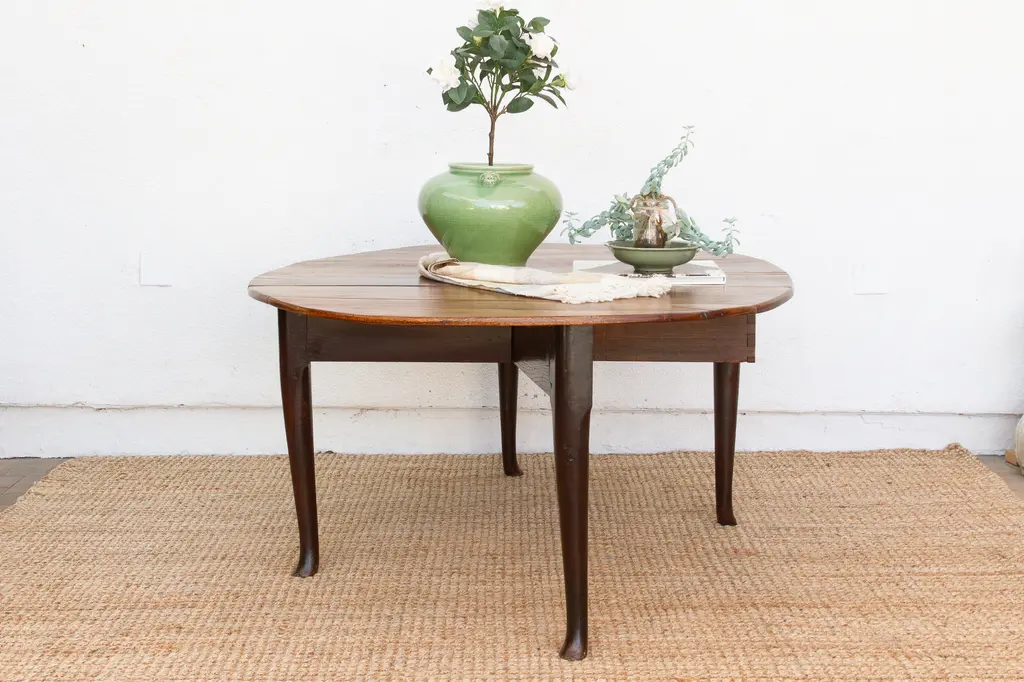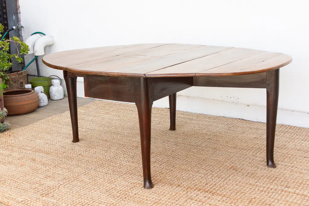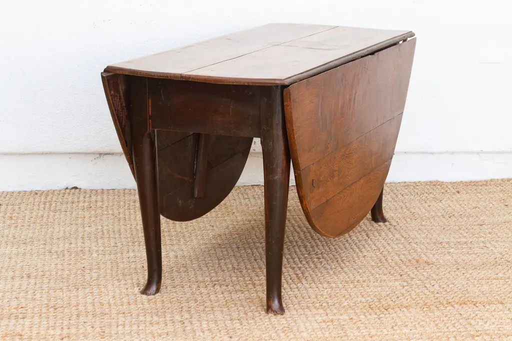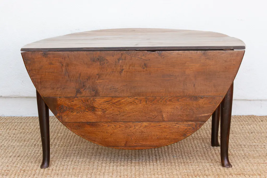 Step into the charm of an English cottage with this antique oak gateleg table. Crafted from solid oak with a rich, dark patina, it features sturdy turned legs and a clever drop-leaf design. Compact at 56"x26" as a console, it expands to a spacious 73"x56" oval table. Dating to the 18th century, it reflects a history of family moments and timeless craftsmanship. Perfect for those seeking vintage elegance combined with modern versatility.