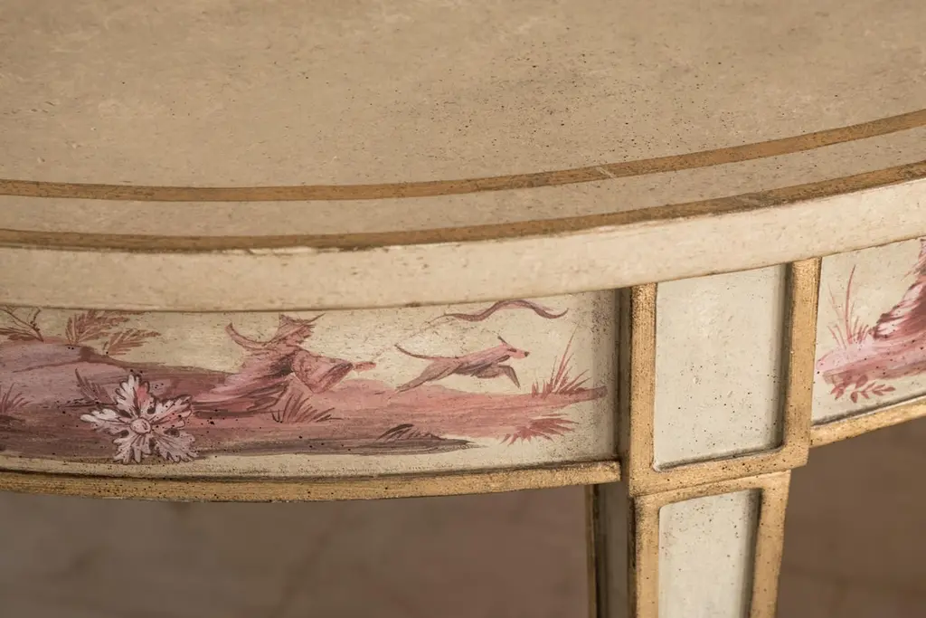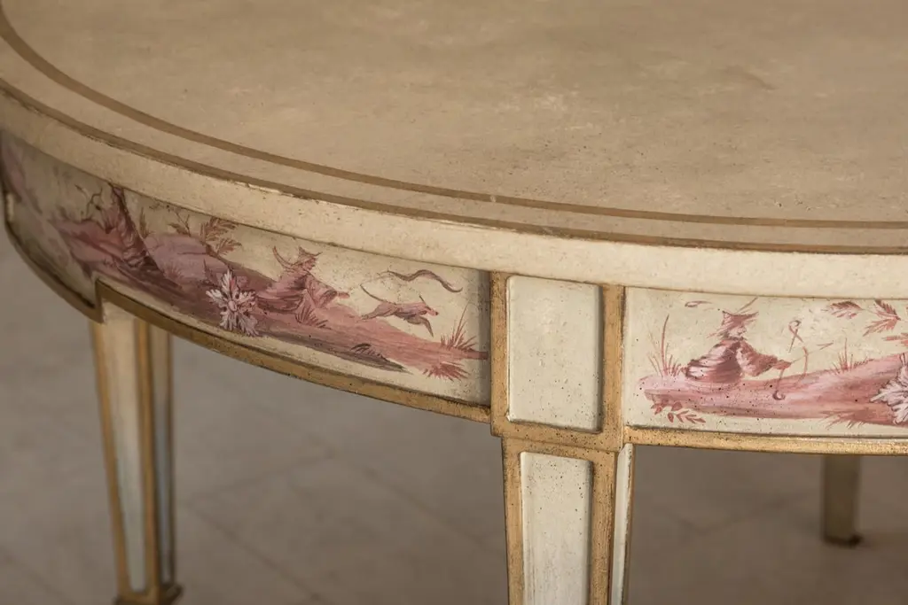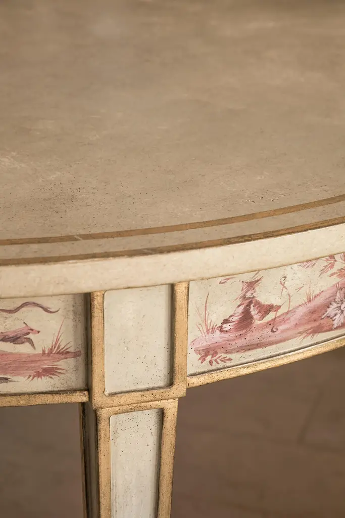 From our Hand-Painted Furniture Collection, we are pleased to introduce you to our Apple Green Manin Table.A beautiful creation made with one of Venice most representative decor: a detailed chinoiserie, in Fuchsia tones, in contrast with the softer green background and gold-leaf edges. You may use it as a wonderful solid Central Table for your entryway or as a luxurious dining table, this Manin Table will give you that extra touch of refined, European antique craftsmanship, like a timeless jewel for your home. Each Piece from our Hand-Painted Furniture Collection is entirely hand-painted on every side of the Furniture by using the very best 18th century craftsmanship Venetian Techniques, passed down through the generations of artists from our land.