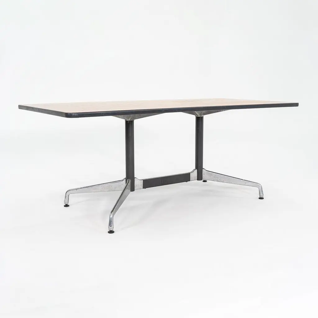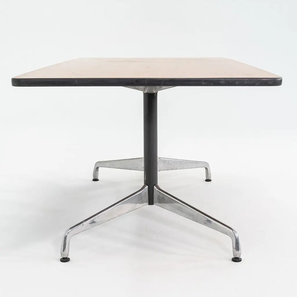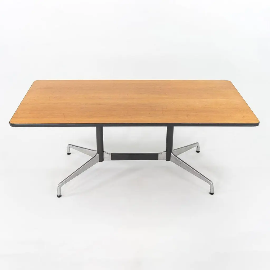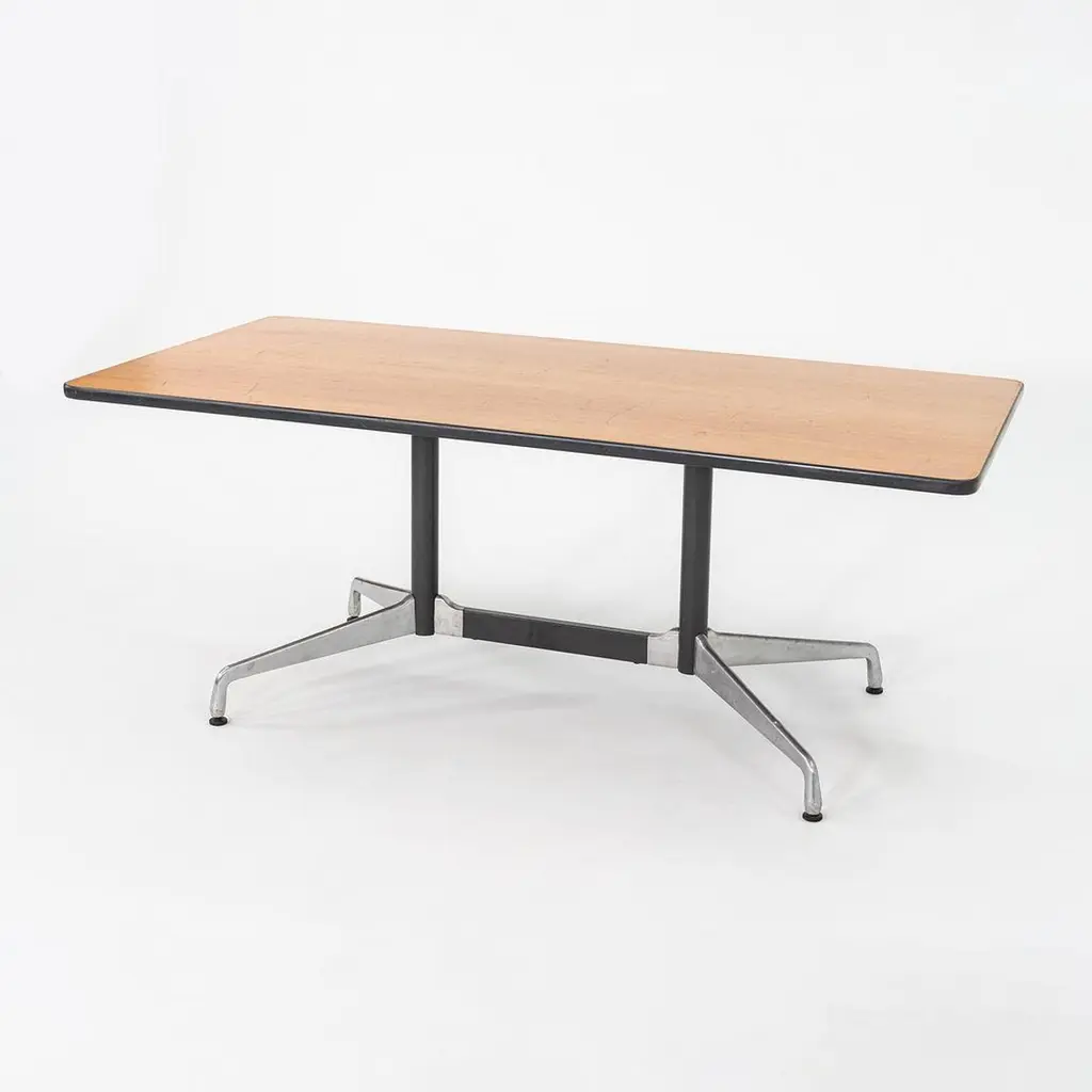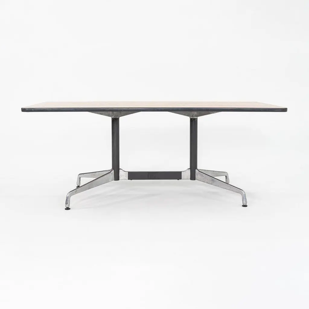 This is a Segmented Conference Dining Table, Model ET143, initially designed by Ray and Charles Eames for Herman Miller in 1964. These particular examples date back to 1977. These pieces feature a walnut veneer rectangular table top with segmented bases that are constructed of steel and aluminum. This was a very popular series from the Eames' and was manufactured for several decades. The listed price includes one table and there are two available to purchase. The table measures 35.25 inches deep, 71.75 inches long, and is 28.5 inches high. The table tops have some light scratches and scuffs, and the bases have some light scuffs as well. Overall, these tables are in very good condition with light wear. Please see photos.