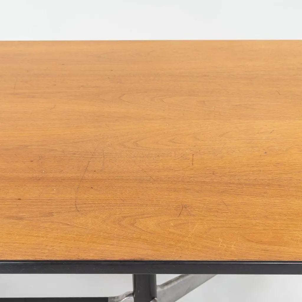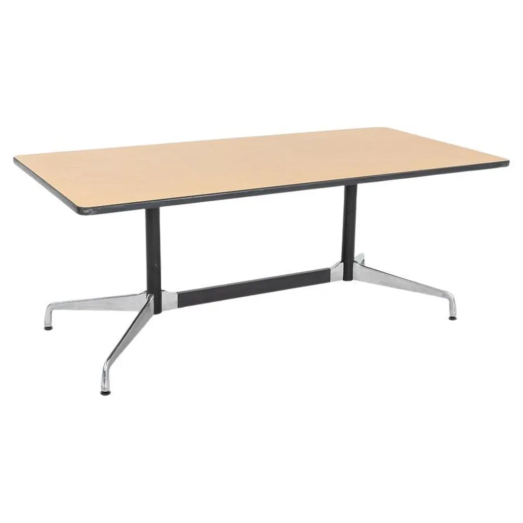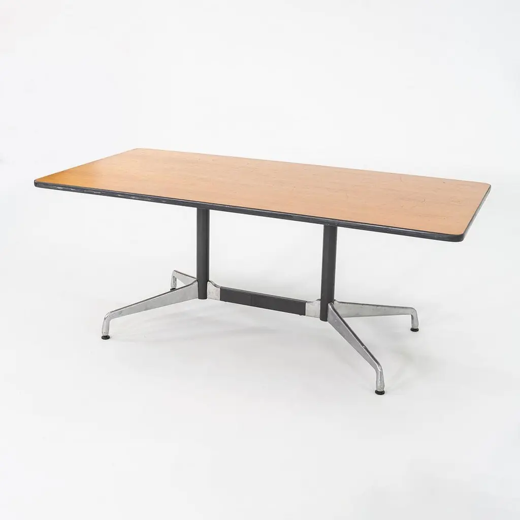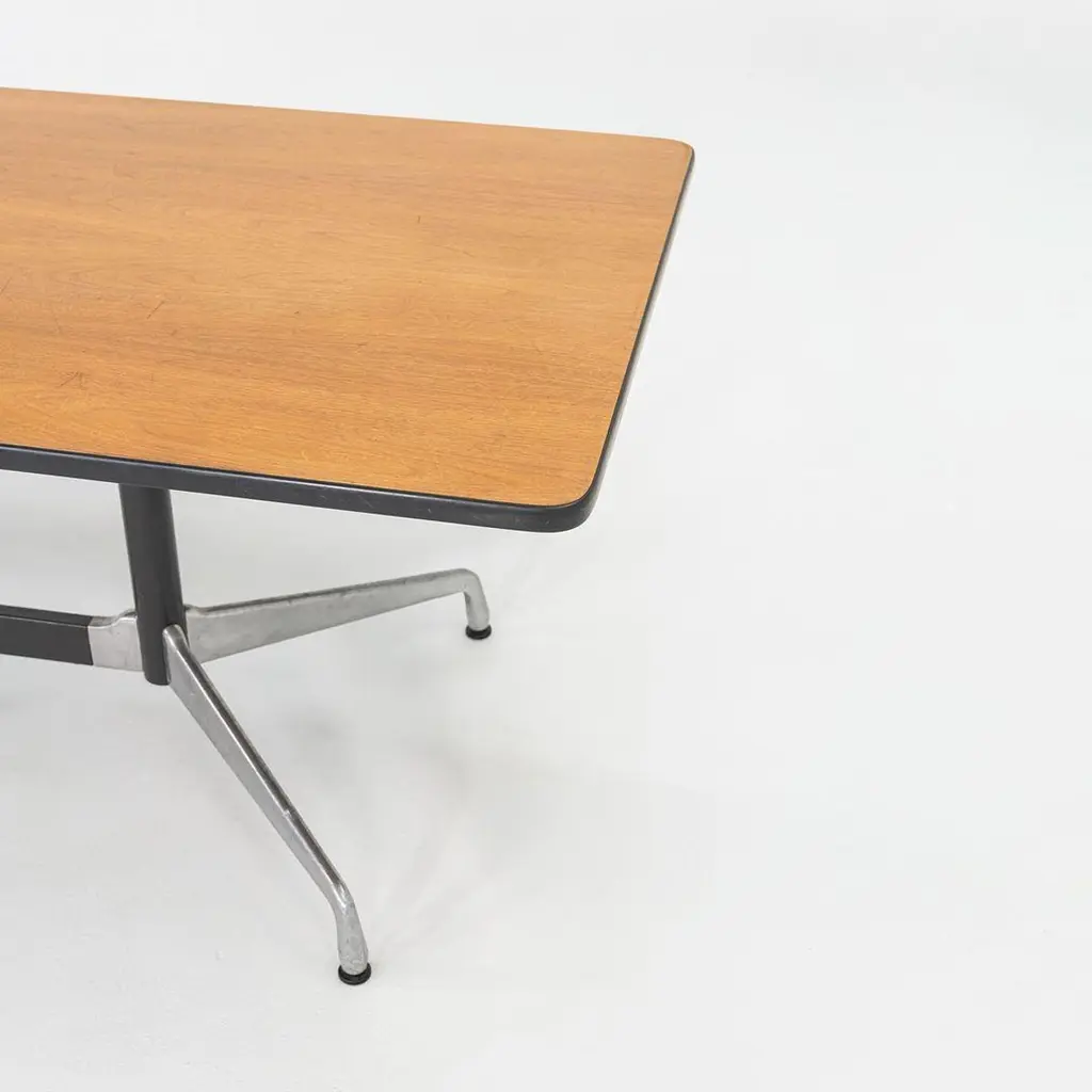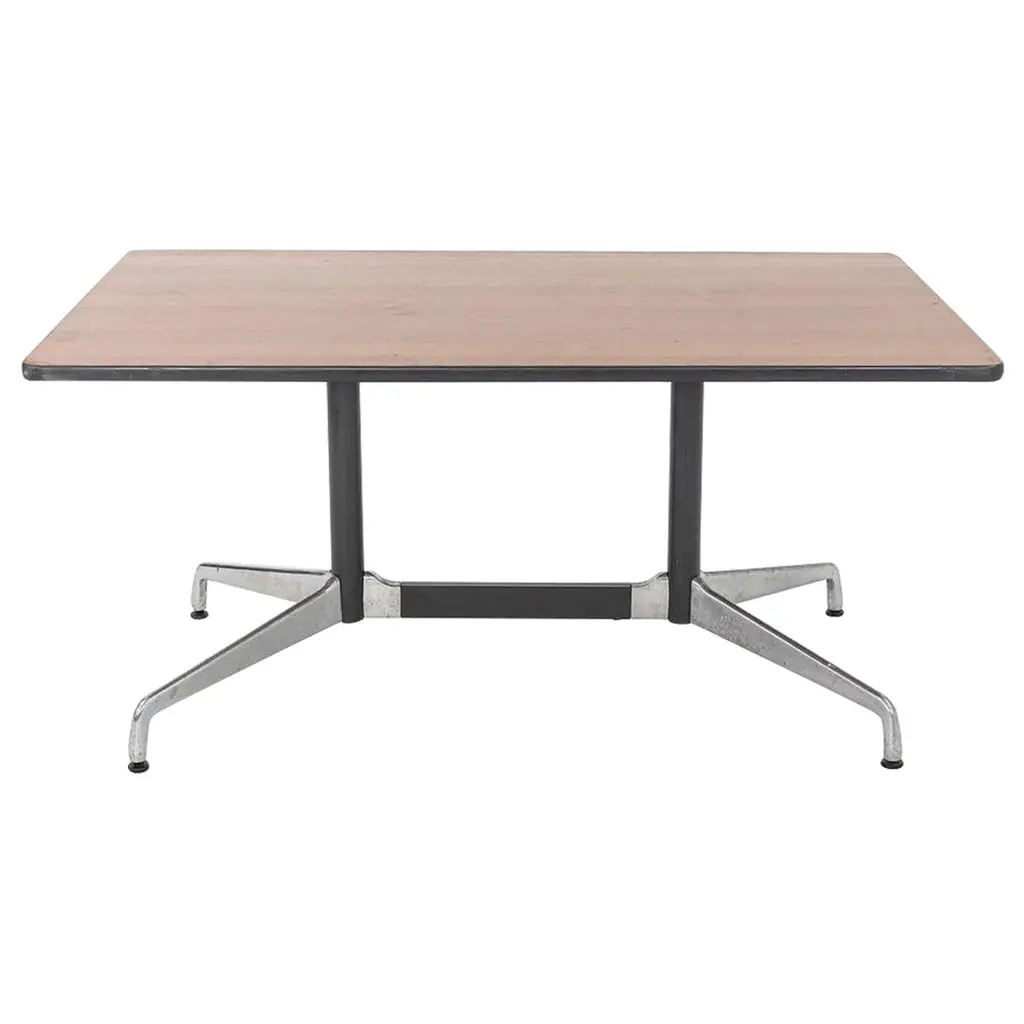 This is a Segmented Conference Dining Table, Model ET143, initially designed by Ray and Charles Eames for Herman Miller in 1964. These particular examples date back to 1977. These pieces feature a walnut veneer rectangular table top with segmented bases that are constructed of steel and aluminum. This was a very popular series from the Eames' and was manufactured for several decades. The listed price includes one table and there are two available to purchase. The table measures 35.25 inches deep, 71.75 inches long, and is 28.5 inches high. The table tops have some light scratches and scuffs, and the bases have some light scuffs as well. Overall, these tables are in very good condition with light wear. Please see photos.