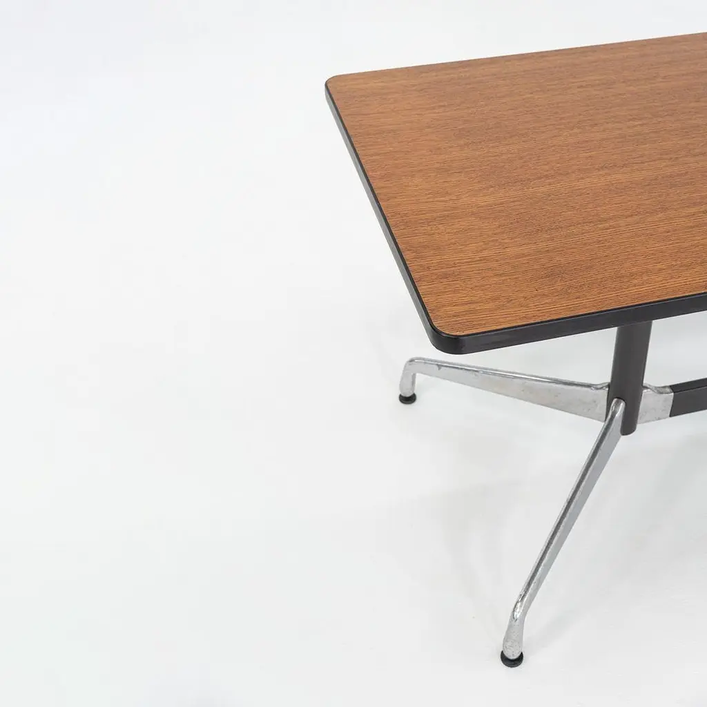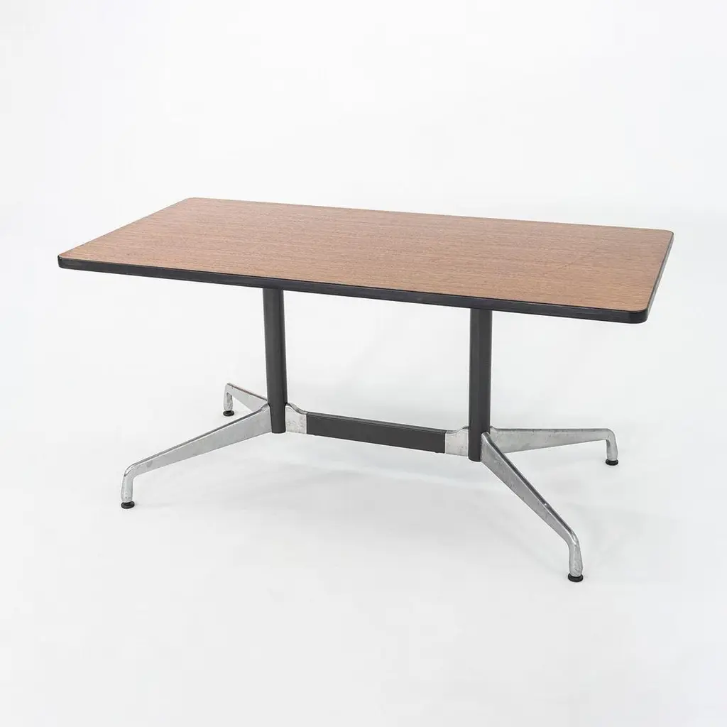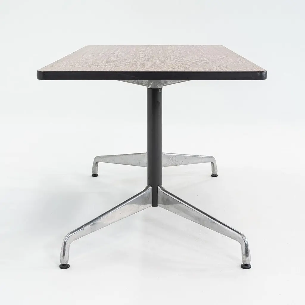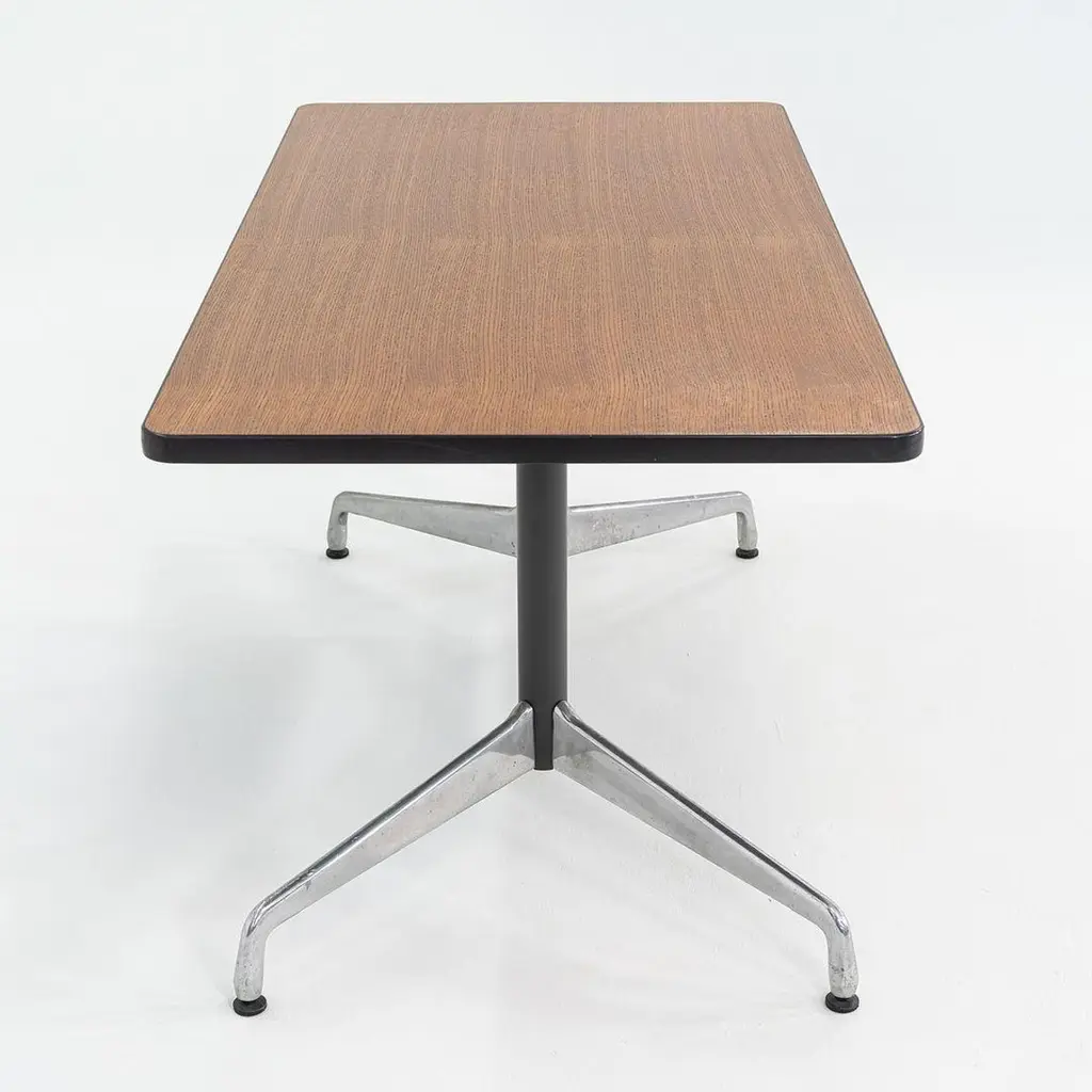 This is a Segmented Conference Dining Table, Model ET187, initially designed by Ray and Charles Eames for Herman Miller in 1964. These pieces date to the year 2007. They feature a rectangular table top made of dark oak with segmented bases that are constructed of steel and aluminum. This was a very popular series from the Eames' and was manufactured for several decades. The listed price includes one table and we have more than 12 available to purchase. Each table measures 30 inches deep, 60.25 inches long, and is 28.5 inches high. The dark oak tops have some light scratches and scuffs, and the bases have some light scuffs as well. Overall, these tables are in very good condition with light wear. Please see photos.