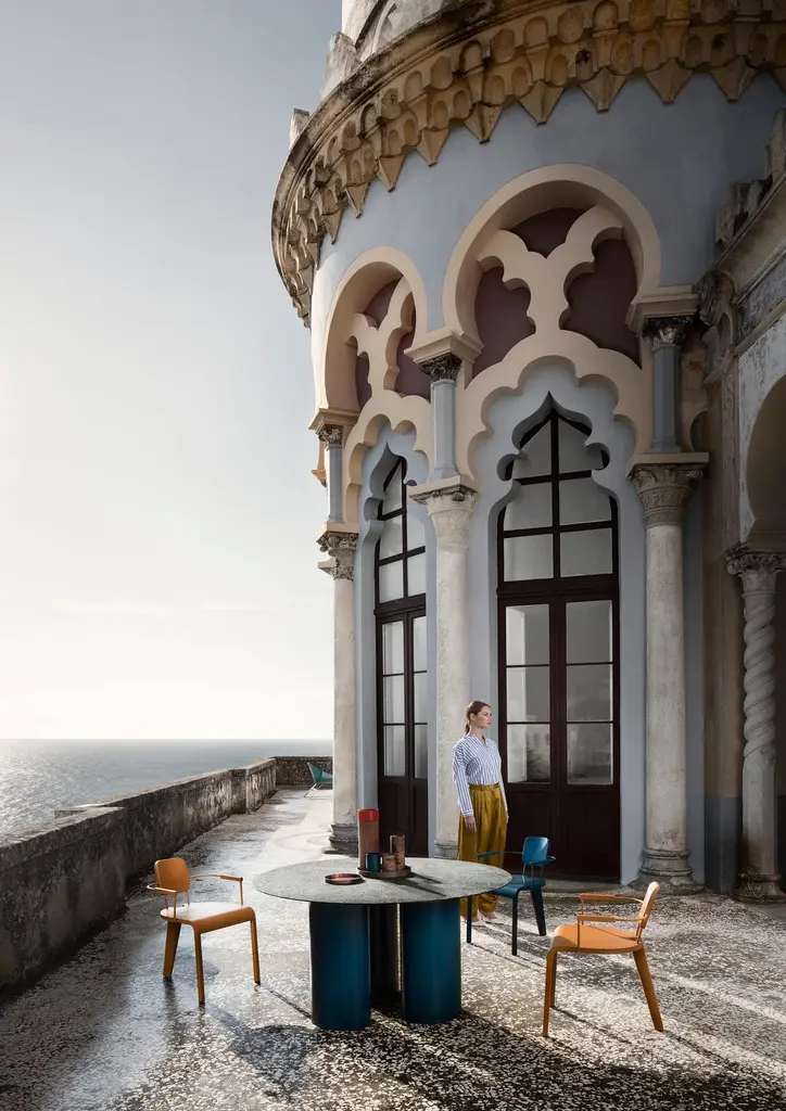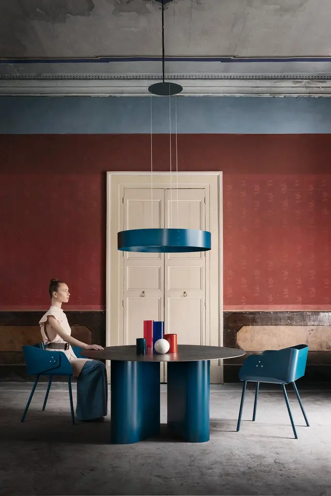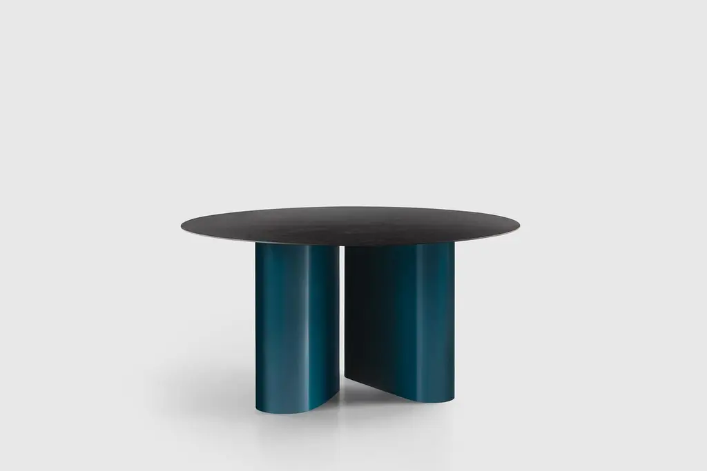 Indoor-outdoor oval table, elongated and curved cylindrical legs, available with steel topor with other tops of the DAA collection.