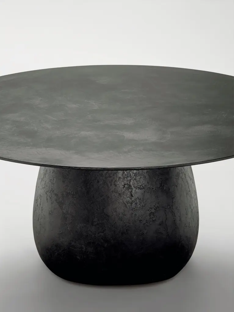 Indoor-outdoor table, moulded rigid polyurethane base with internal central leg in steel, purenit top. Base and top entirely coated with a hand-trowelled mixture of lava stone
