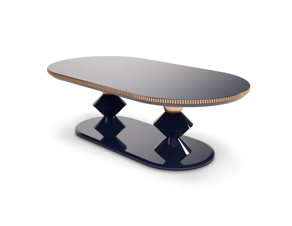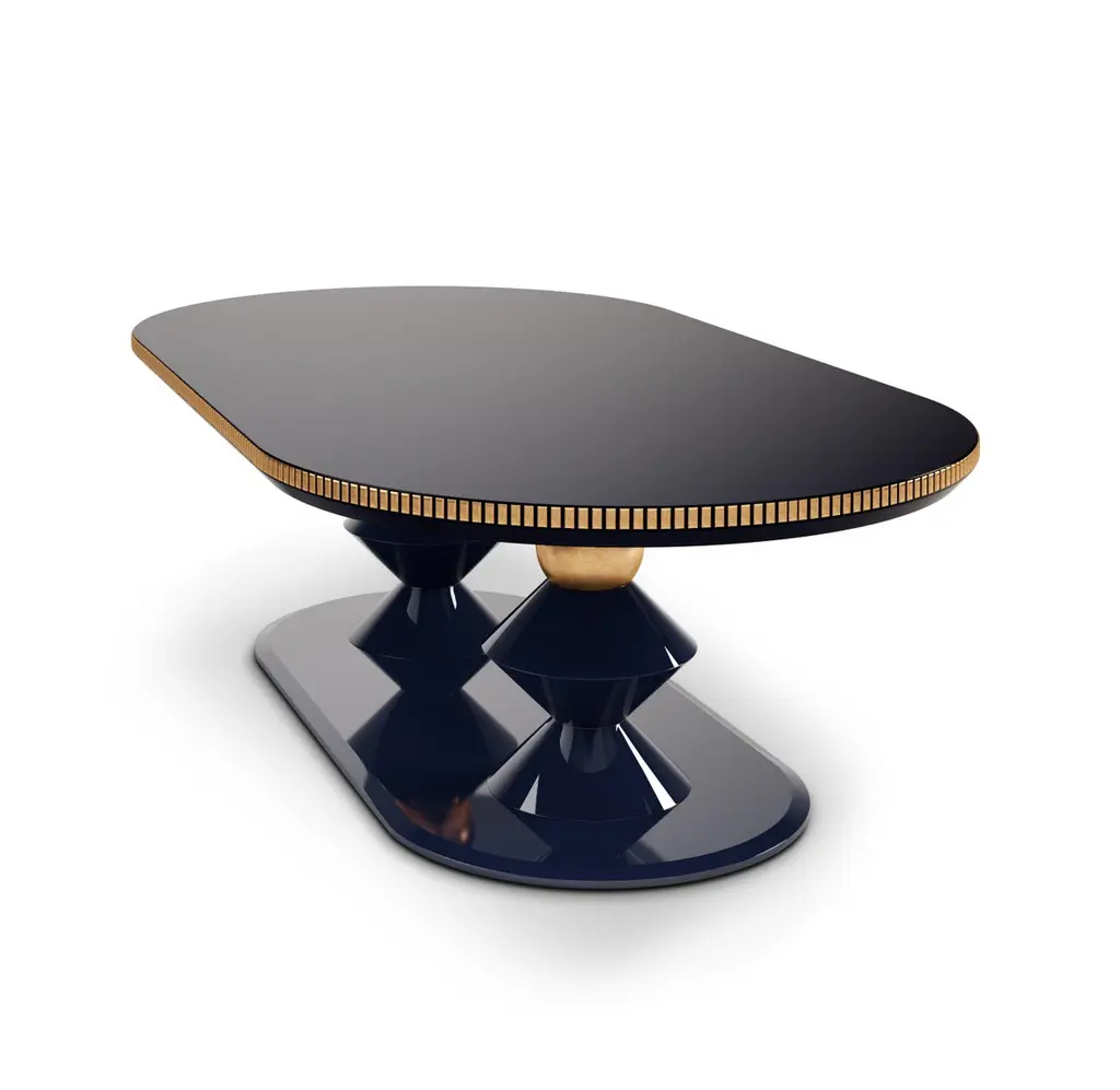 Elegant and simply described as the bastion of Portuguese luxury, the Cortez modern dining table exhales the splendor of the uniqueness of the kings and queens’ era. Its timeless originality and imperial design were inspired by the Palace of Ajuda, a neoclassical monument in the civil parish of Ajuda, in Lisbon. This piece’s top is made of wood finished with high gloss black varnish surrounded by a subtle line of gold leaf coated elements. The structure is supported by two shapely designed geometric feet in lacquered wood and gold leaf coated semi-spheres. This makes Cortez II modern dining table ideal for spacious contemporary rooms. Cortez II dining table was designed by Malabar and is part of the Heritage collection.