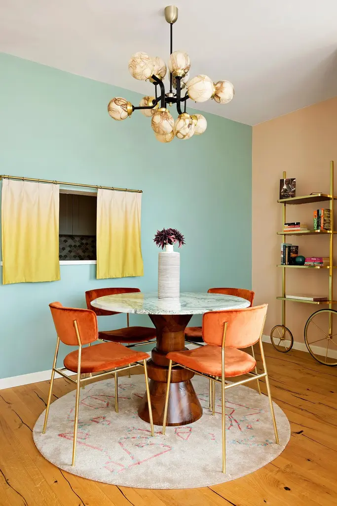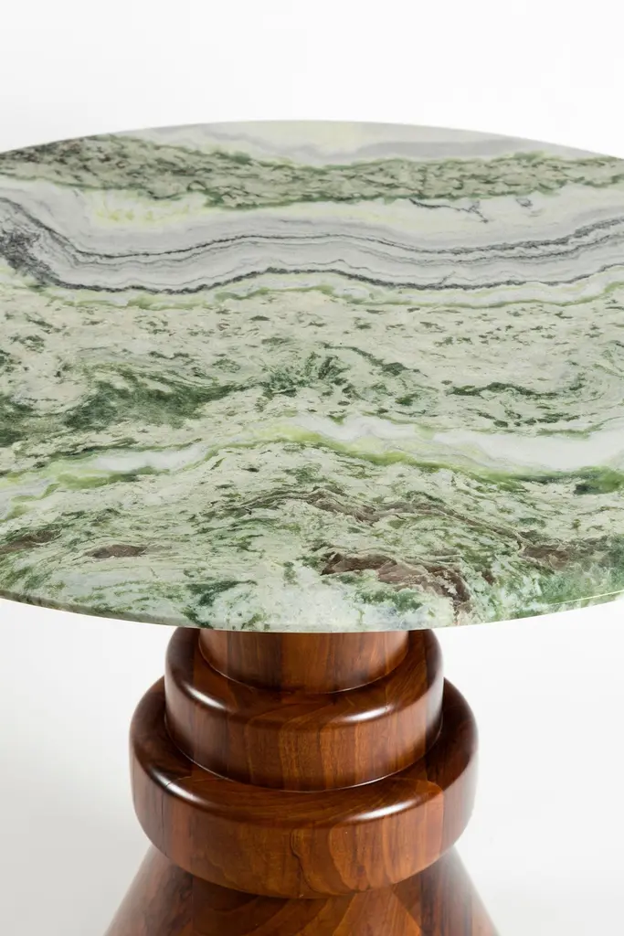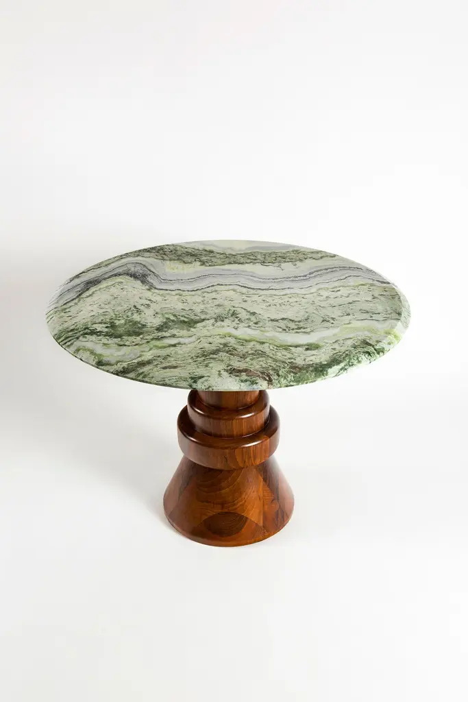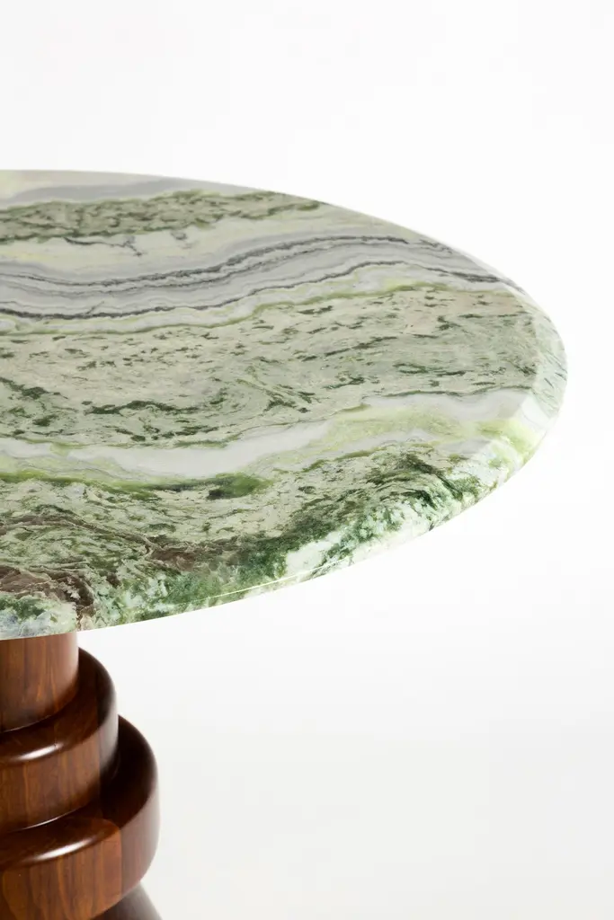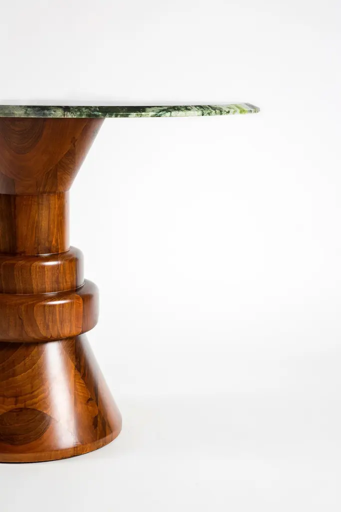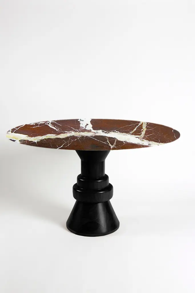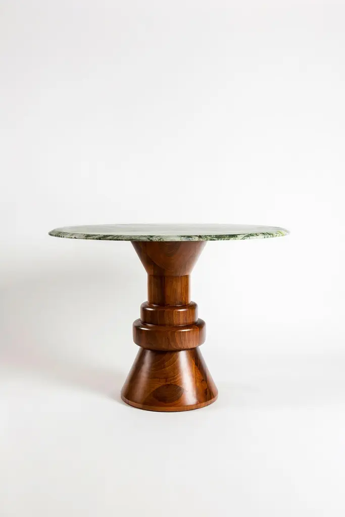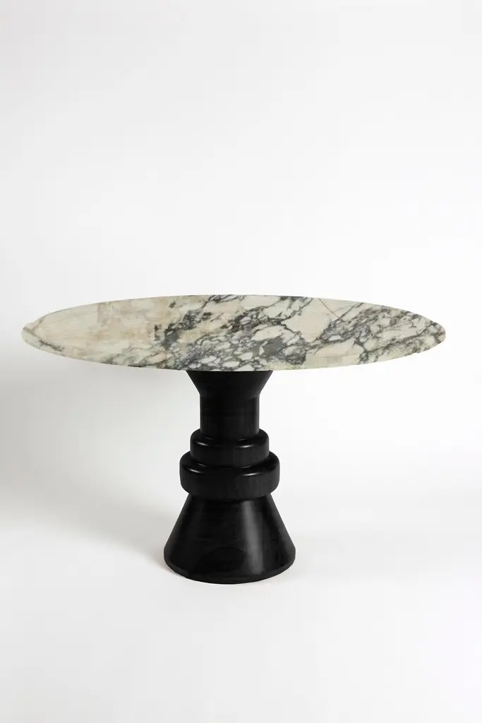 This playful handcrafted dining table is perfect to accommodate 4 people in smaller spaces. Cream marble top is combined with sculptural wooden base and can be customized in different sizes and marble tops.