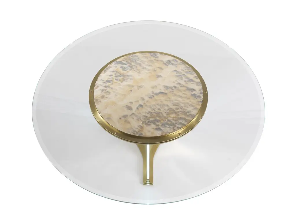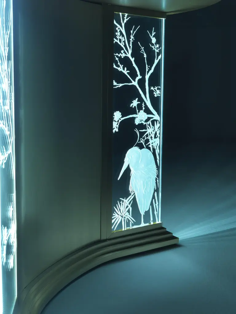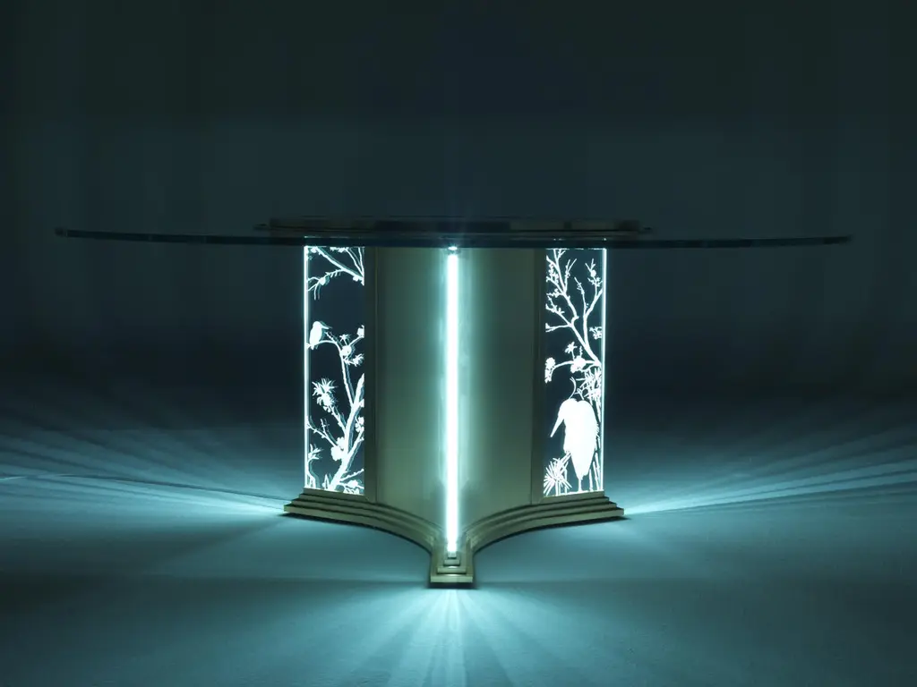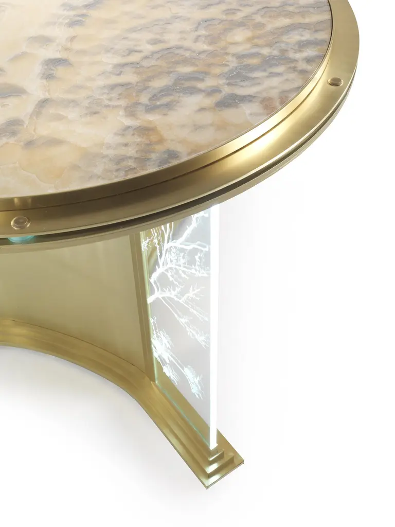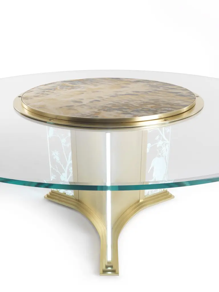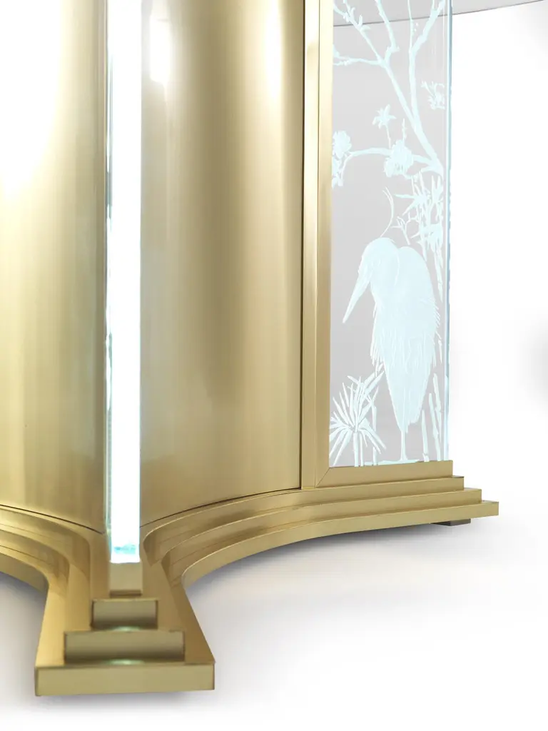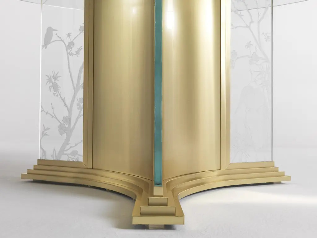 A scenographic dining table that demonstrates Jumbo Collection’s technical and artistic skills. The special manufacturing of the glass, engraved in several steps and with different depths, gives a three-dimensional effect to the drawings, studied ad hoc on the piece. The lighting takes place through the thickness of the glass and allows the engraved elements to be highlighted: bamboo, herons, peach blossoms and other elements inspired by the Orient.Fuji dining table with structure in metal with gold finishing. Engraved glasses with Oriental classical decorations. Top in bevelled glass, with electrical rotating Lazy Susan in Cloudy Onyx. Lighting system.