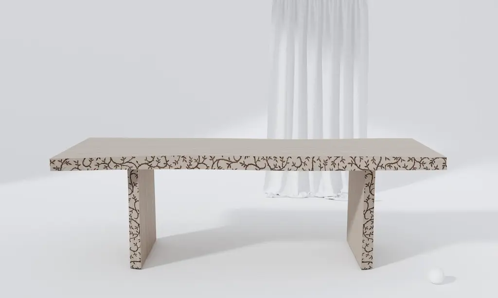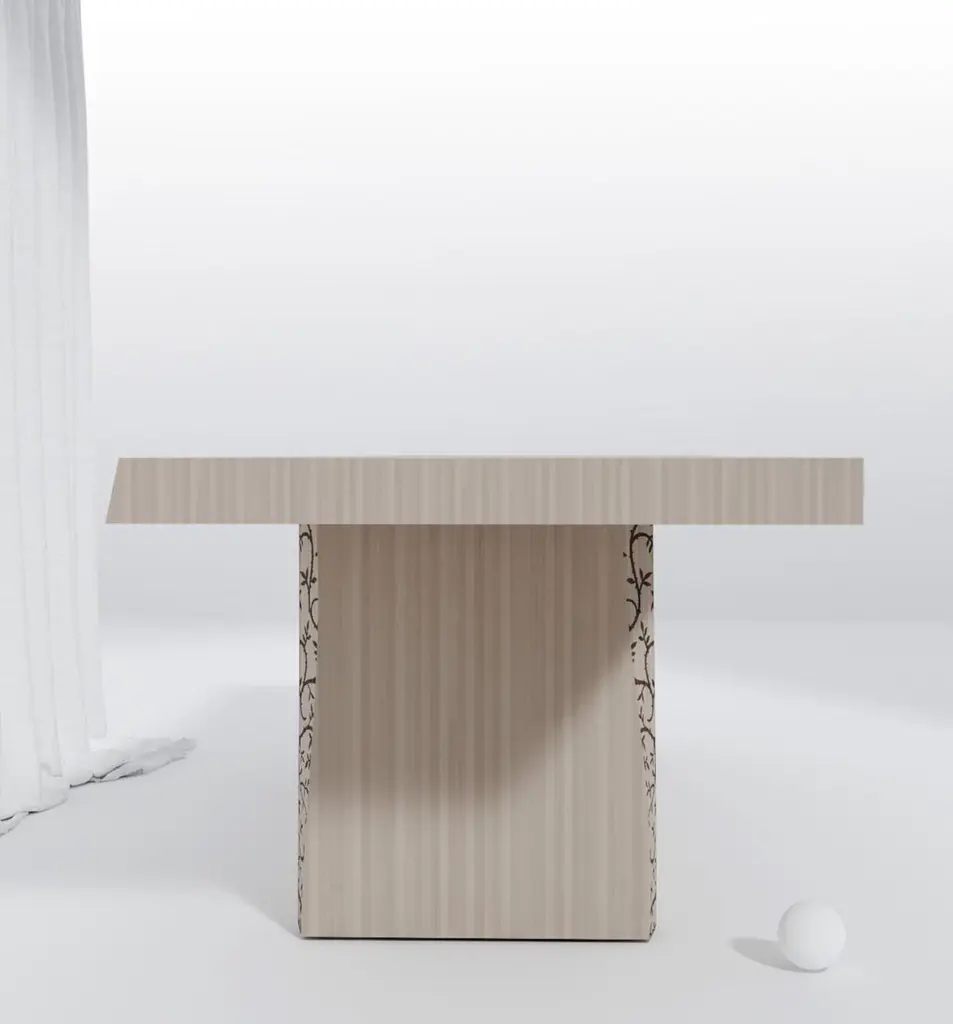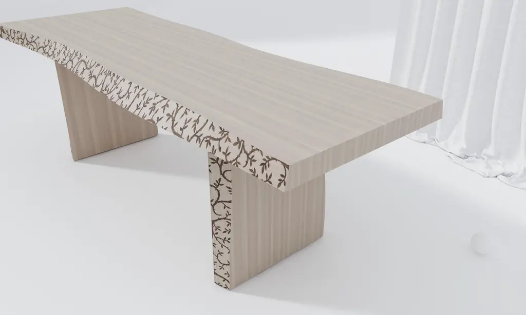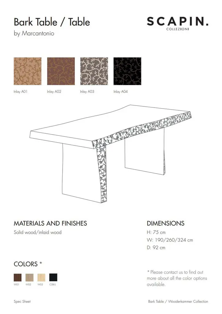 Bark tableBark table è realizzabile in tre essenze di legno e accostabile a quattro diverse tonalità di intarsio. Le forme sinuose caratterizzate dai profili ramage simulano le irregolarità della corteccia. Bark table cabìn be made of three essences of wood and matched to fuor different hues of inlay. Its sinuos shapes, featured by ramage profiles, reminds of bark's irregularities.