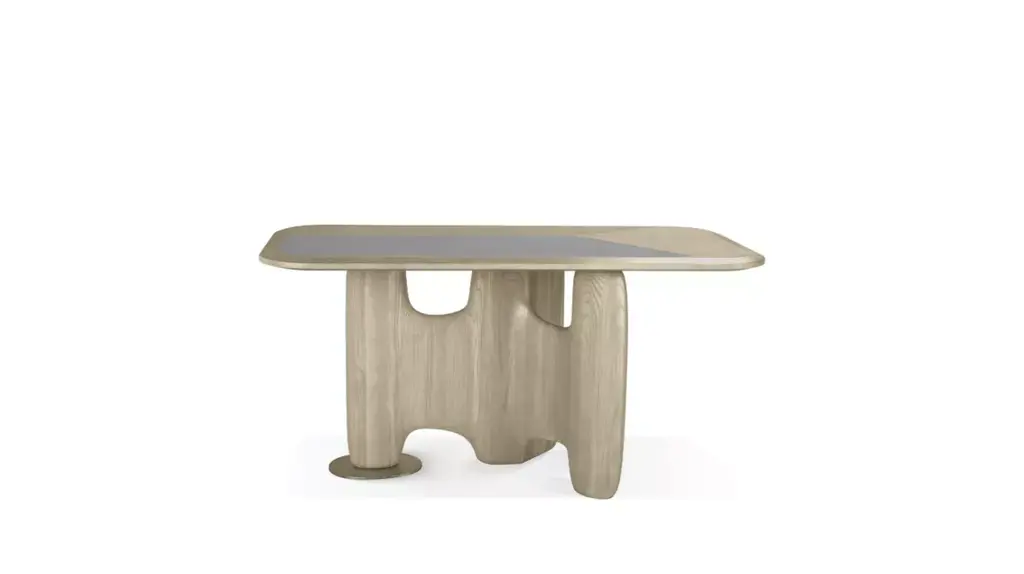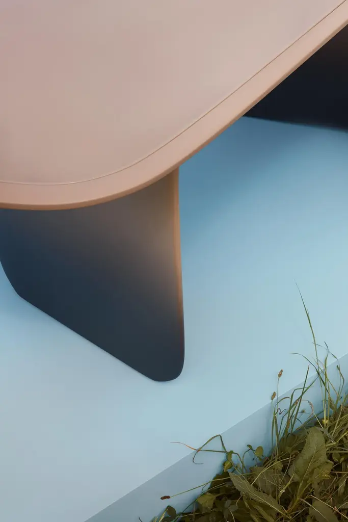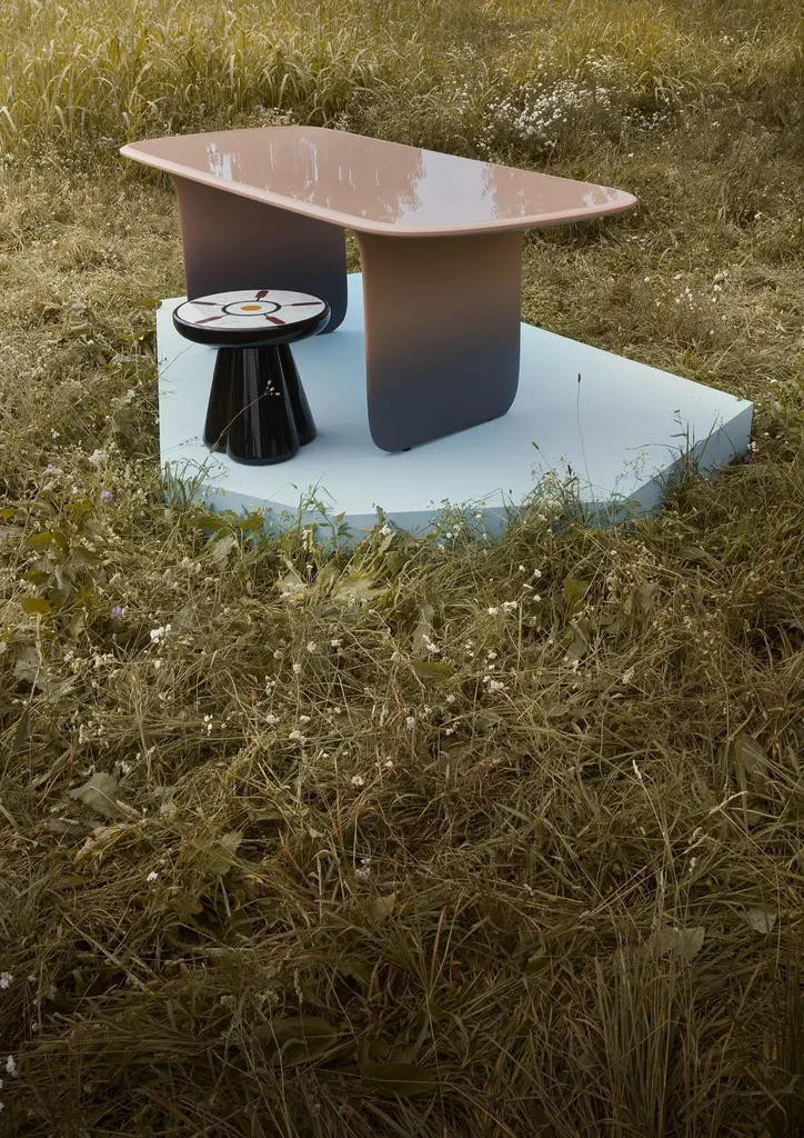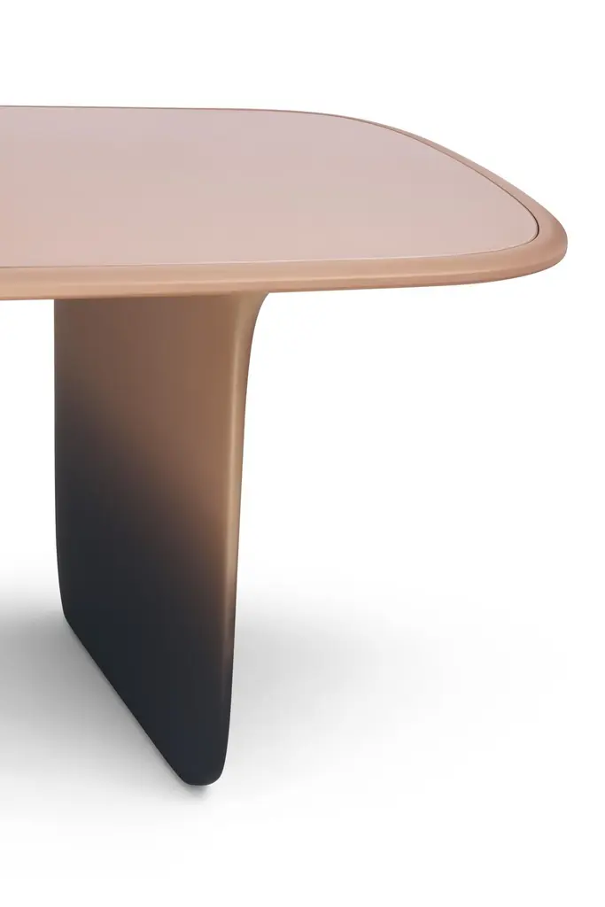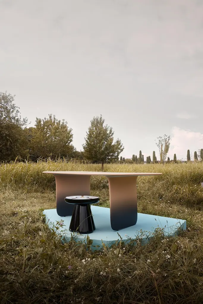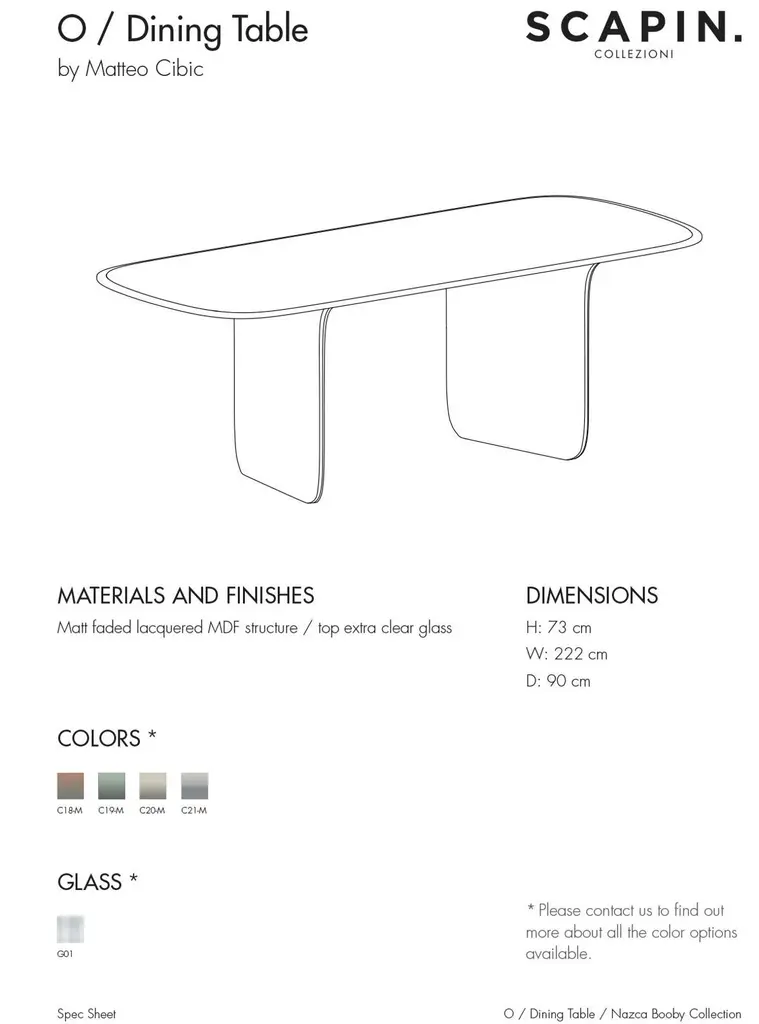 O dining table, design by Matteo Cibic, product by Scapin CollezioniThe shaded lacquering technique gives the thin legs of the table a striking geometric lightness and makes it illusion that the top is floating.Materials: matt faded lacquered MDF, top extra clear glass.Nazca Booby Collection by Matteo CibicWorking with colors and their juxtapositions, Matteo Cibic has created a truly outstanding universe of unique and sophisticated pieces. While designing the collection, he took his inspiration from the slender and faded paws of the Nazca Booby, a particular South American specie of birds. The search for ancient mysteries, shapes and animals coming from remote and mysterious lands, inspired Cibic to create a collection that stands out for the lightness of its elements and for the unique use of faded lacquered surfaces.