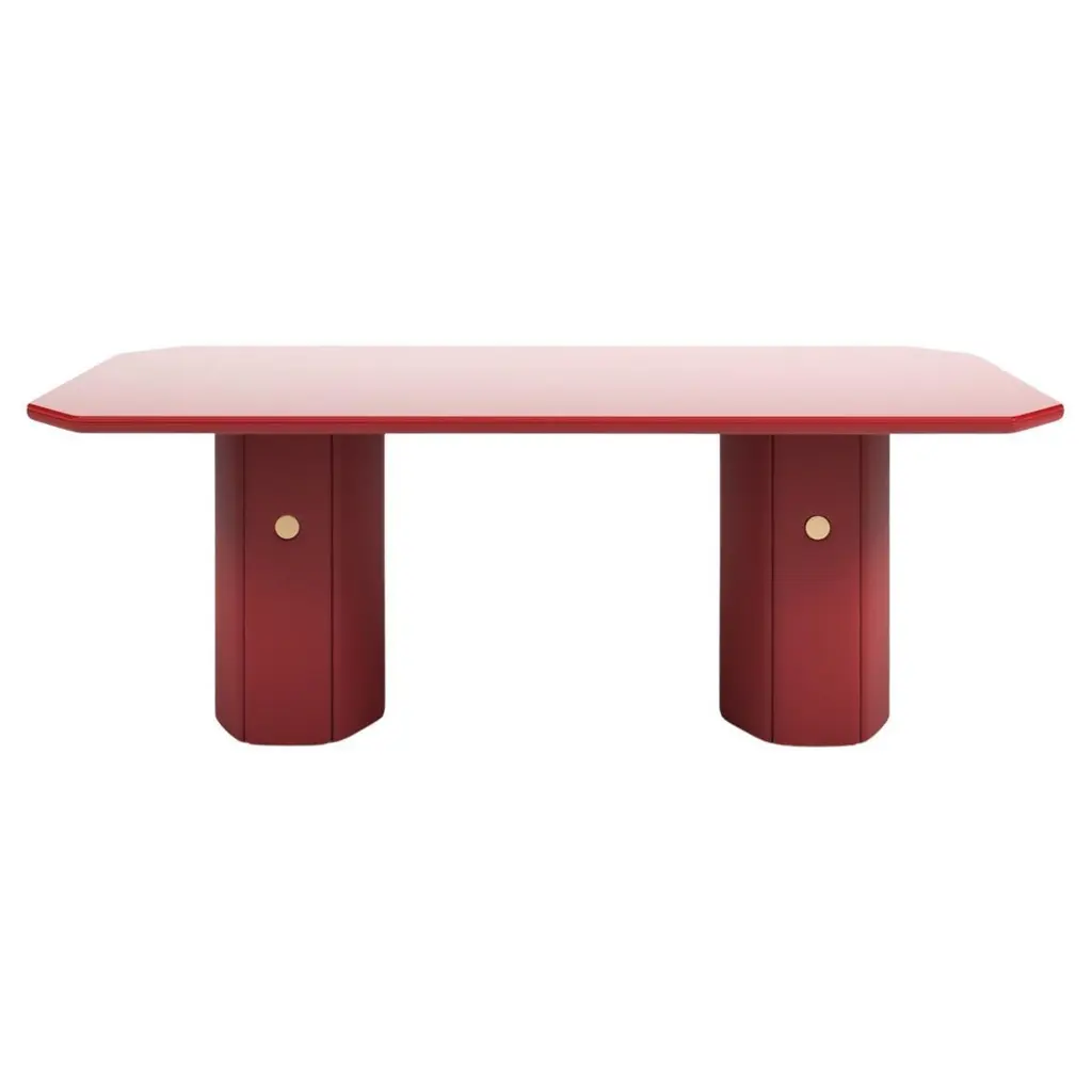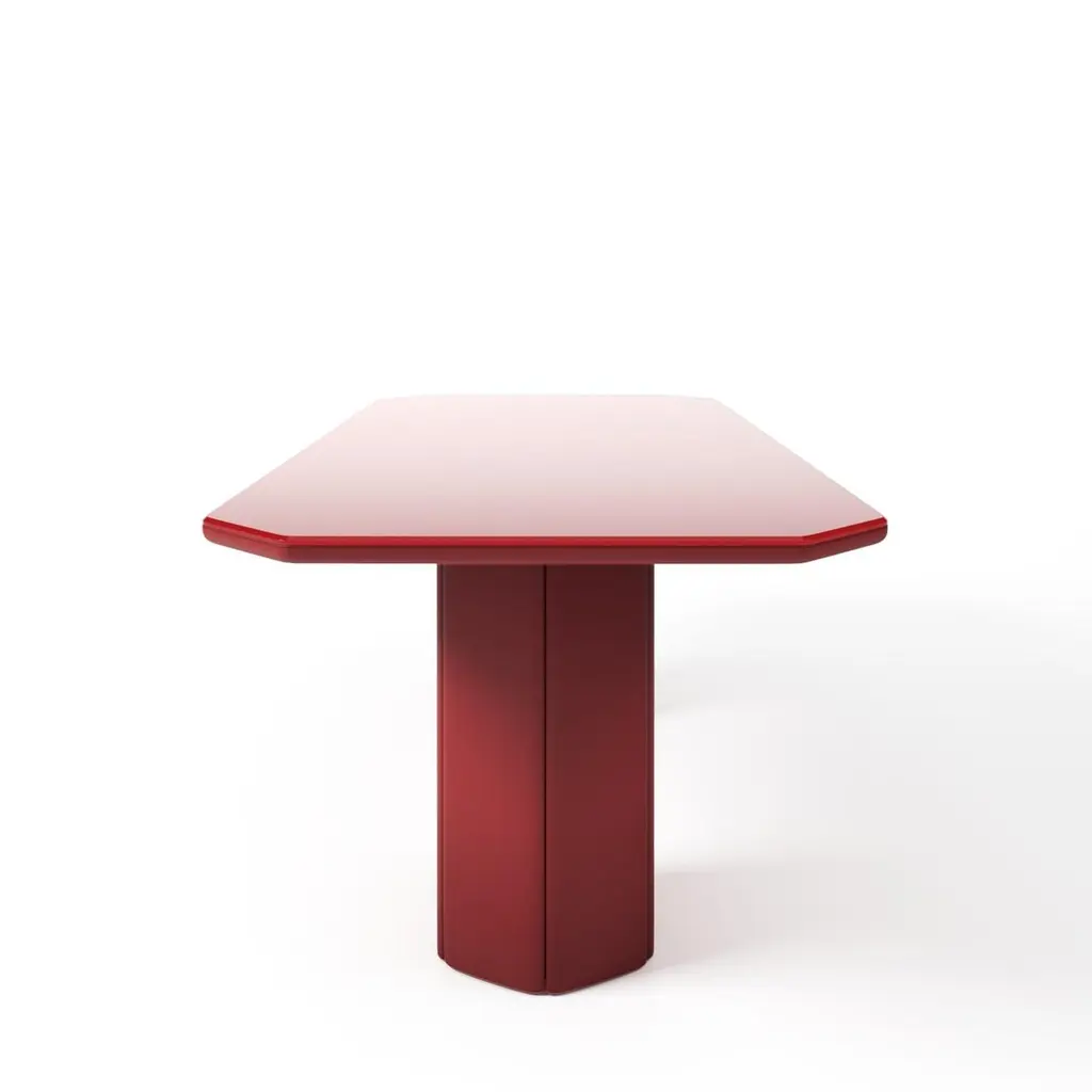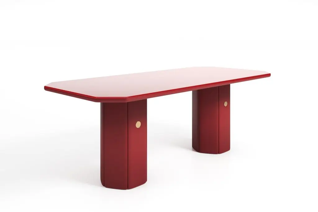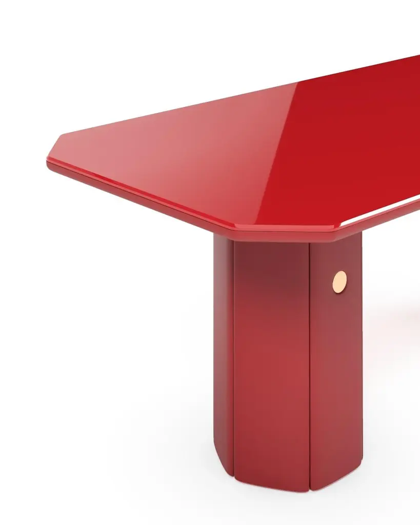 Zeta dining table, design by Matteo Cibic, product by Scapin CollezioniZETA DINING TABLE is a dining table that harmoniously combines volumes and materials. The top, made of extra-clear back-painted glass, rests on a matt lacquered MDF base with hexagonal legs, where a circular insert in polished brass becomes a distinguishing decorative element. The rounded corners of the top and legs give the table a soft appearance, enhanced by the flame red monochrome finish.Nazca Booby Collection by Matteo CibicWorking with colors and their juxtapositions, Matteo Cibic has created a truly outstanding universe of unique and sophisticated pieces. While designing the collection, he took his inspiration from the slender and faded paws of the Nazca Booby, a particular South American specie of birds. The search for ancient mysteries, shapes and animals coming from remote and mysterious lands, inspired Cibic to create a collection that stands out for the lightness of its elements and for the unique use of faded lacquered surfaces.