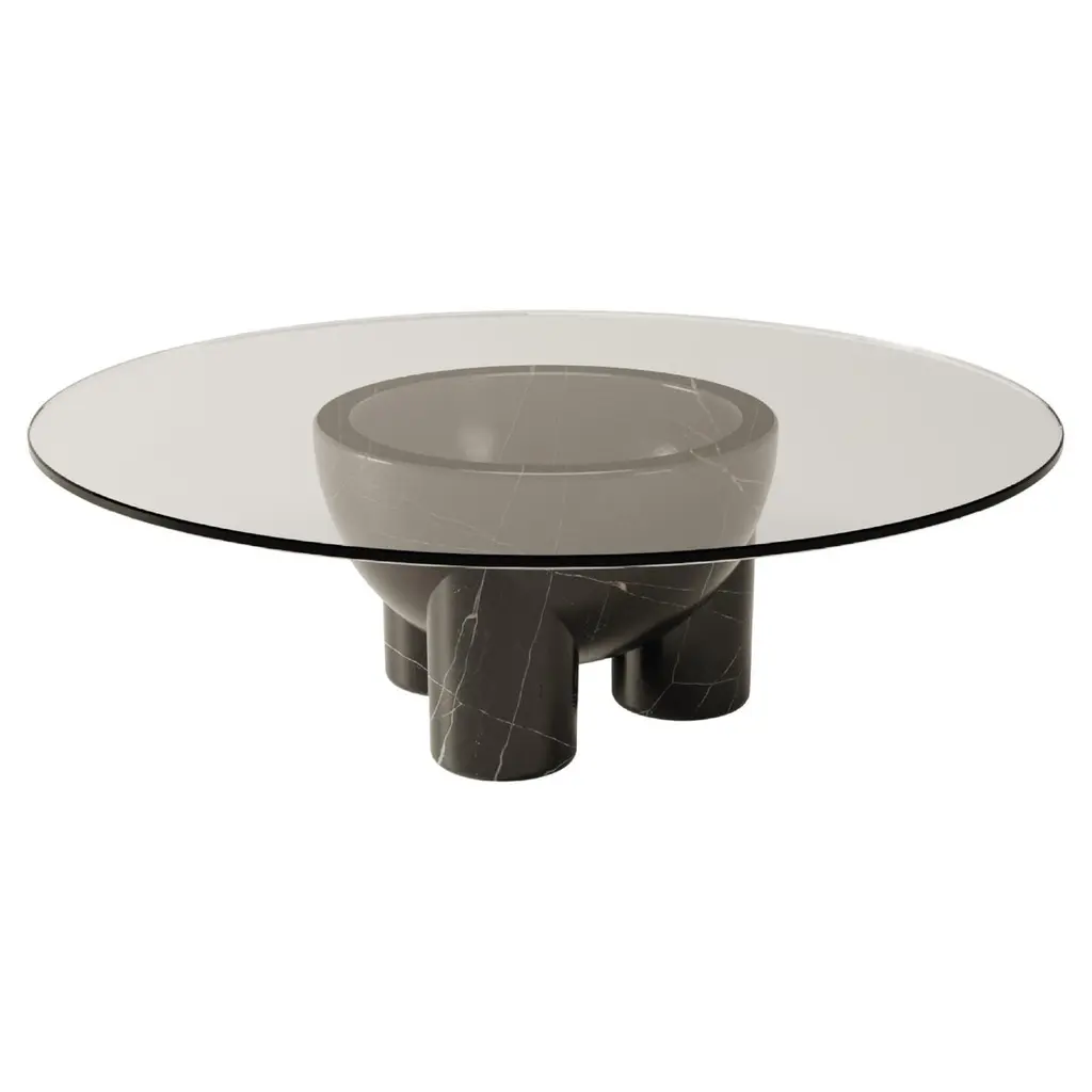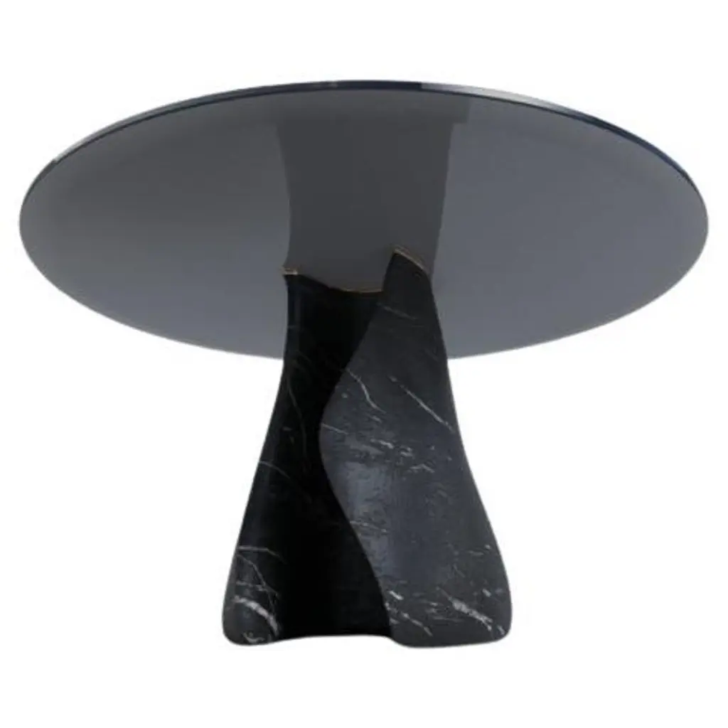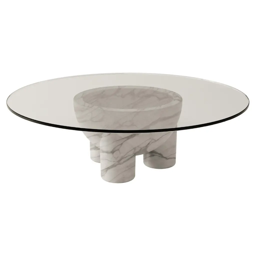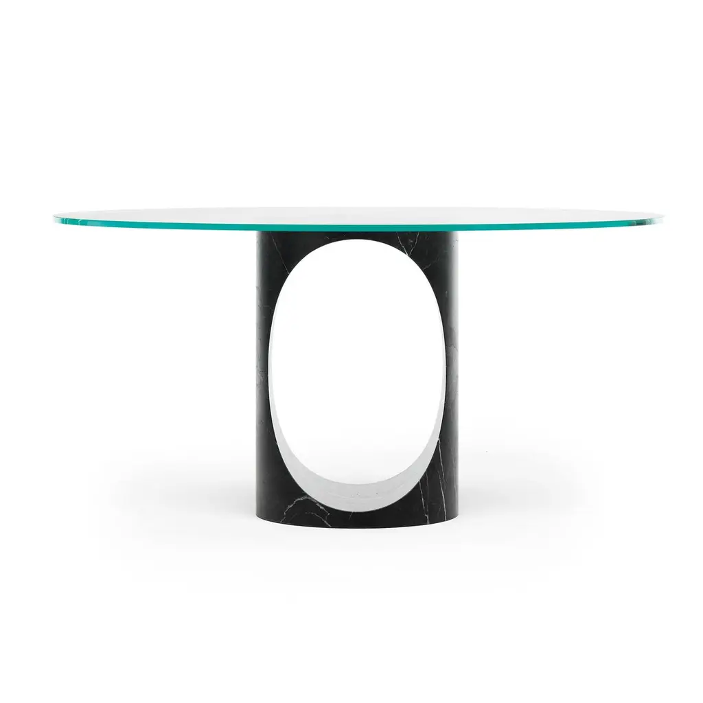Roll is Epònimo’s central stem dining table. The base, carved from a single block of marble, is a geometric and yet organic sculpture that changes dramatically when viewed from different angles. Functionally it supports a thick but clear glass top which maintains a perfect visual balance with the marble volume below without hindering the view of it. With our standard glass top our roll table seats 8 people.New Saint Laurent marble and 15 mm extra-clear tempered glass. Other stones are available upon request.